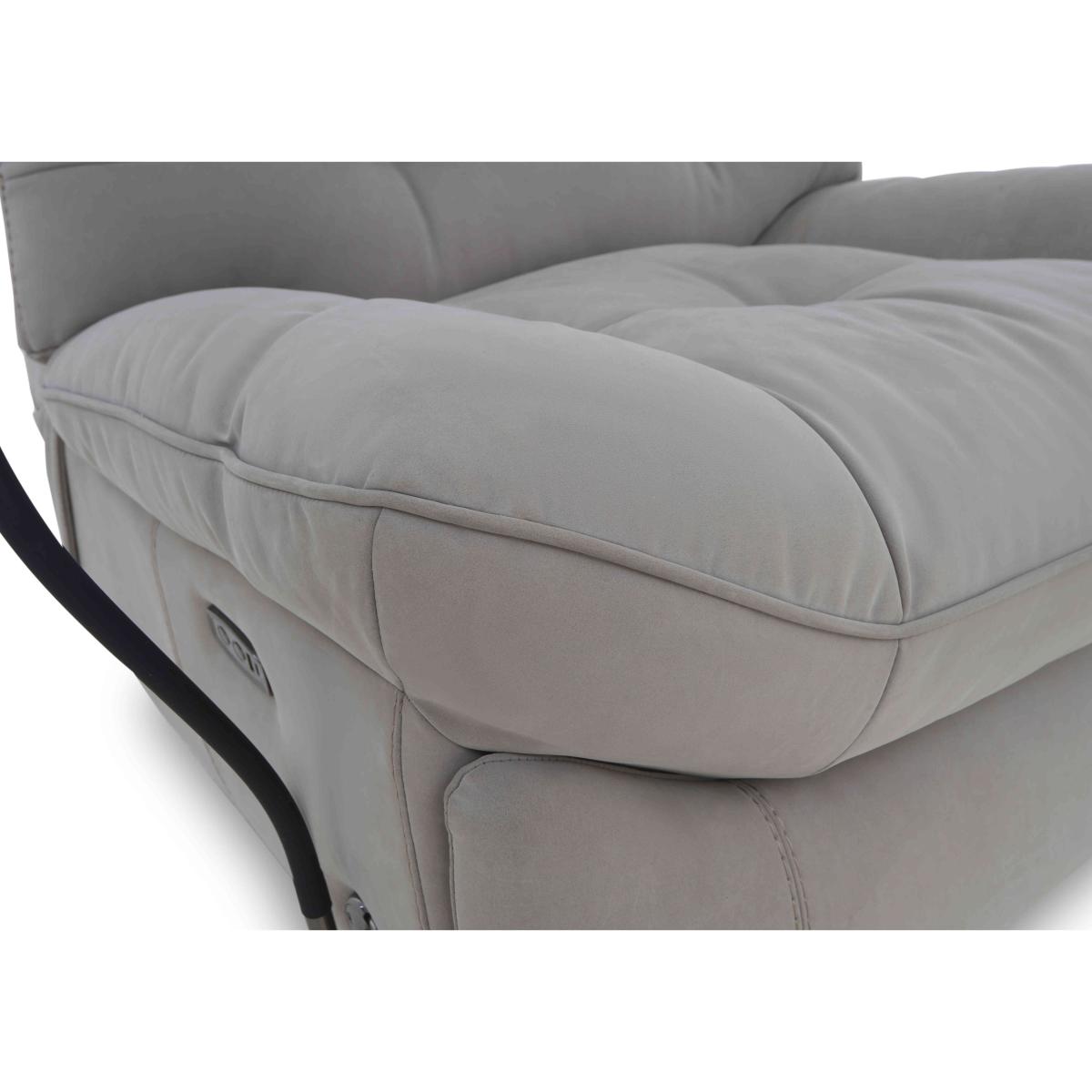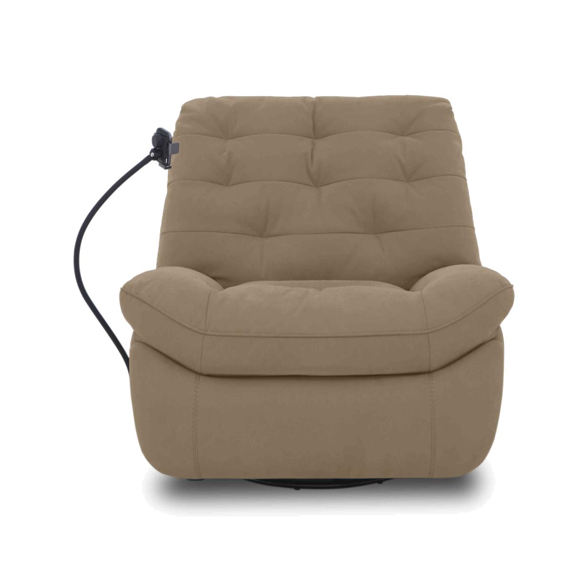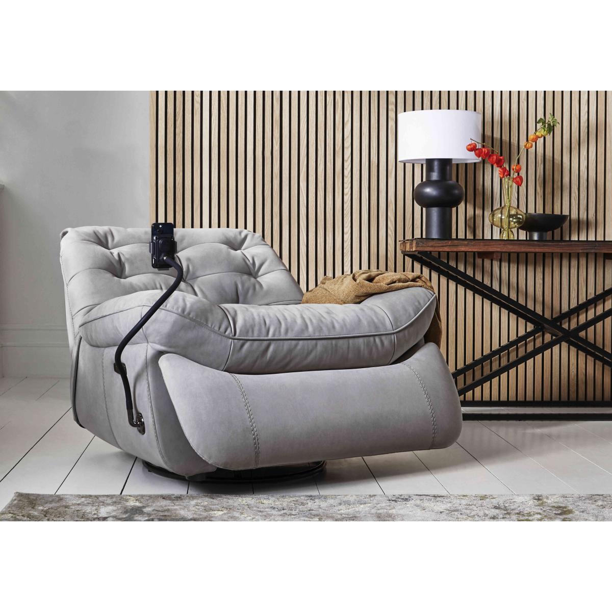 There’s relaxation – and there’s Ozzy-style relaxation. The incredible power reclining chairs in this collection take comfort to new heights and every direction. Each has a swivel base and independently adjustable power recliner and power elevating footrest so it’s easy to perfectly fine tune your comfort. The sprung seat and back with deep and luxurious cushioning promises comfort with support. And with a smartphone holder on a flexible arm plus built-in USB and USB-C charging, you can enjoy effortless hands-free media and phone time. Available in both 100% leather and high-quality fabric upholstery, the Ozzy range is exclusively available at Furniture Village. It’s easy to settle in for a while with our Ozzy power recliner chair. The sprung seat and fabulous cushioning feel incredible and the flexible-arm smartphone holder offers relaxing hands-free viewing. Why you’ll love it There’s no end to this stylish power chair's comfort features. You’ll love the smartphone holder with flexible arm for hands-free viewing. The sprung seat and back feel fabulous. And the power recliner promises instant relaxation. Back recline and elevating footrest can be adjusted independently. With USB and USB-C ports for easy device charging. And, of course, it swivels. Cool curves are accentuated by the luxurious cushioning. Stylishly buttoned back cushion. In a huge choice of upholstery fabrics and colours to match any decor. Also available in 100% leather upholstery. Exclusive to Furniture Village. This swivel power recliner chair is part of our Ozzy range. What you need to know Medium comfort level. Seat suspension: no-sag spring. Seat cushioning: foam and fibre. Cushioning is fixed. Back suspension: rubber webbing. Back cushioning: fibre. Cushioning is fixed. Arm cushioning: foam and fibre. Please allow time for new recliners to ease. Minor gaps are necessary to ensure ease of recliner motion and may be exaggerated depending on floor type. Some fabrics can show wear on areas of more use or in direct sunlight. Clean regularly using a soft brush or vacuum with the curtain attachment. Deal with any spills promptly. Professional cleaning advised for oil- and grease-based stains. Please read our upholstery care guide for more advice.