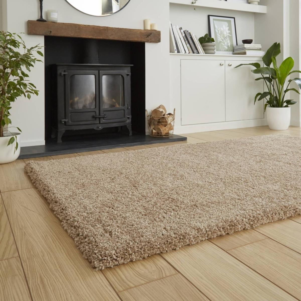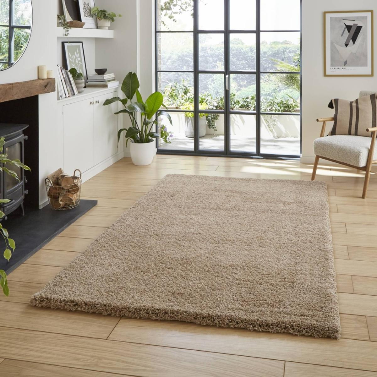 The Ozzy Plain Shaggy Rug in Natural, measuring 200x290cm, the perfect addition to any living room or bedroom. This rug features a heavy weight shaggy pile construction made from high-quality polypropylene, providing a soft and plush feel underfoot.