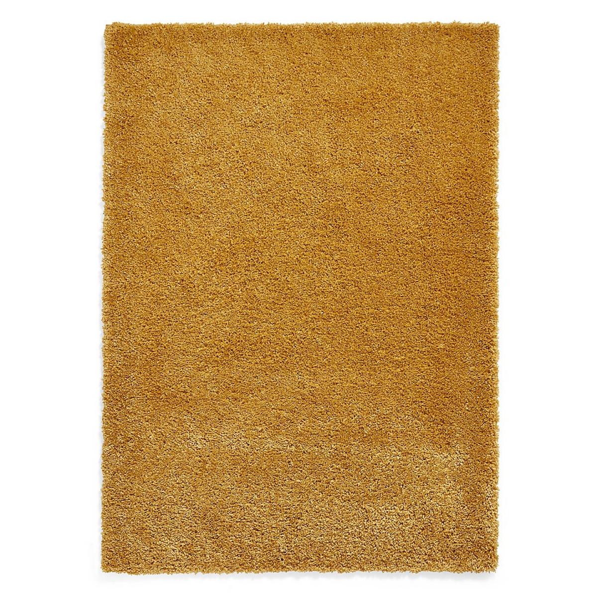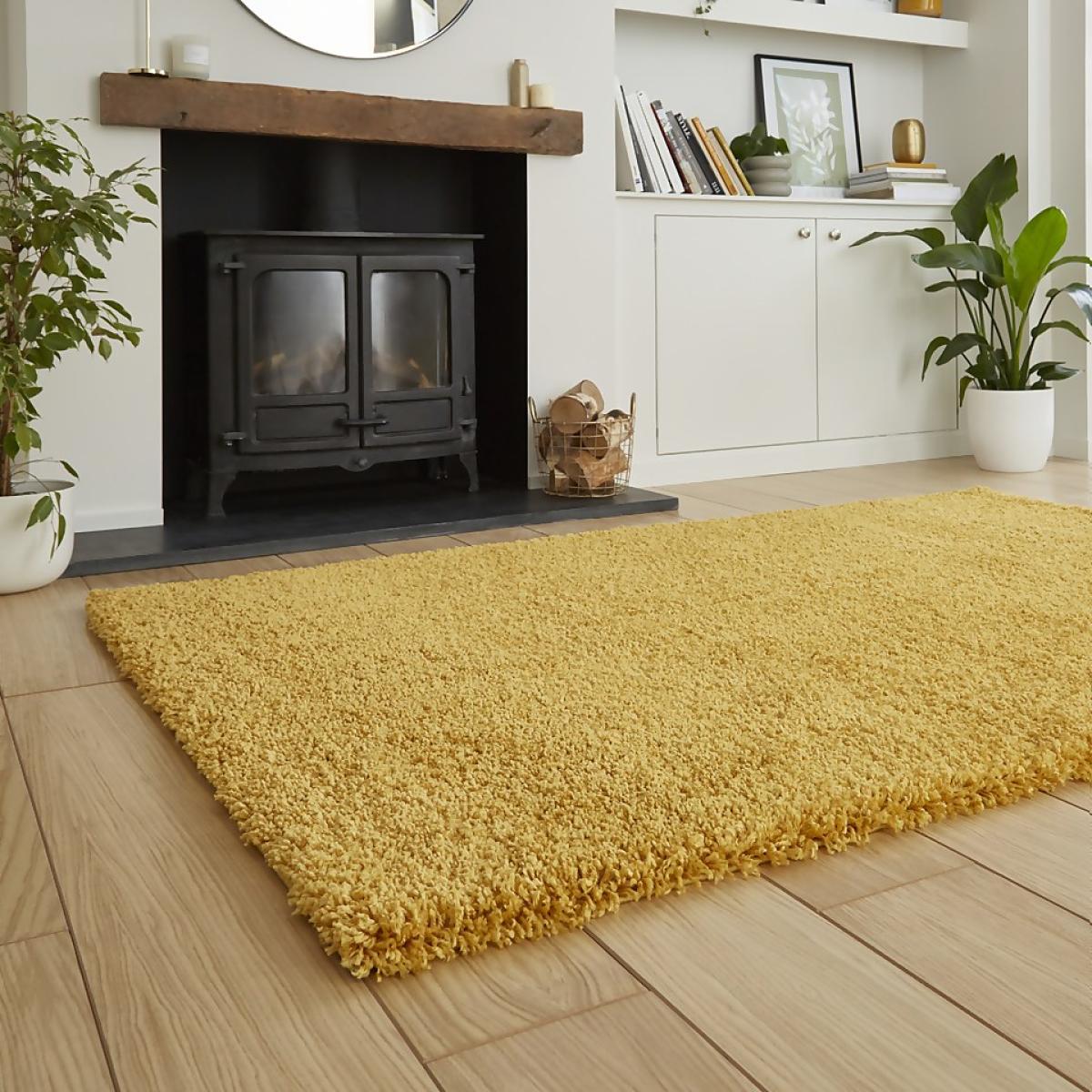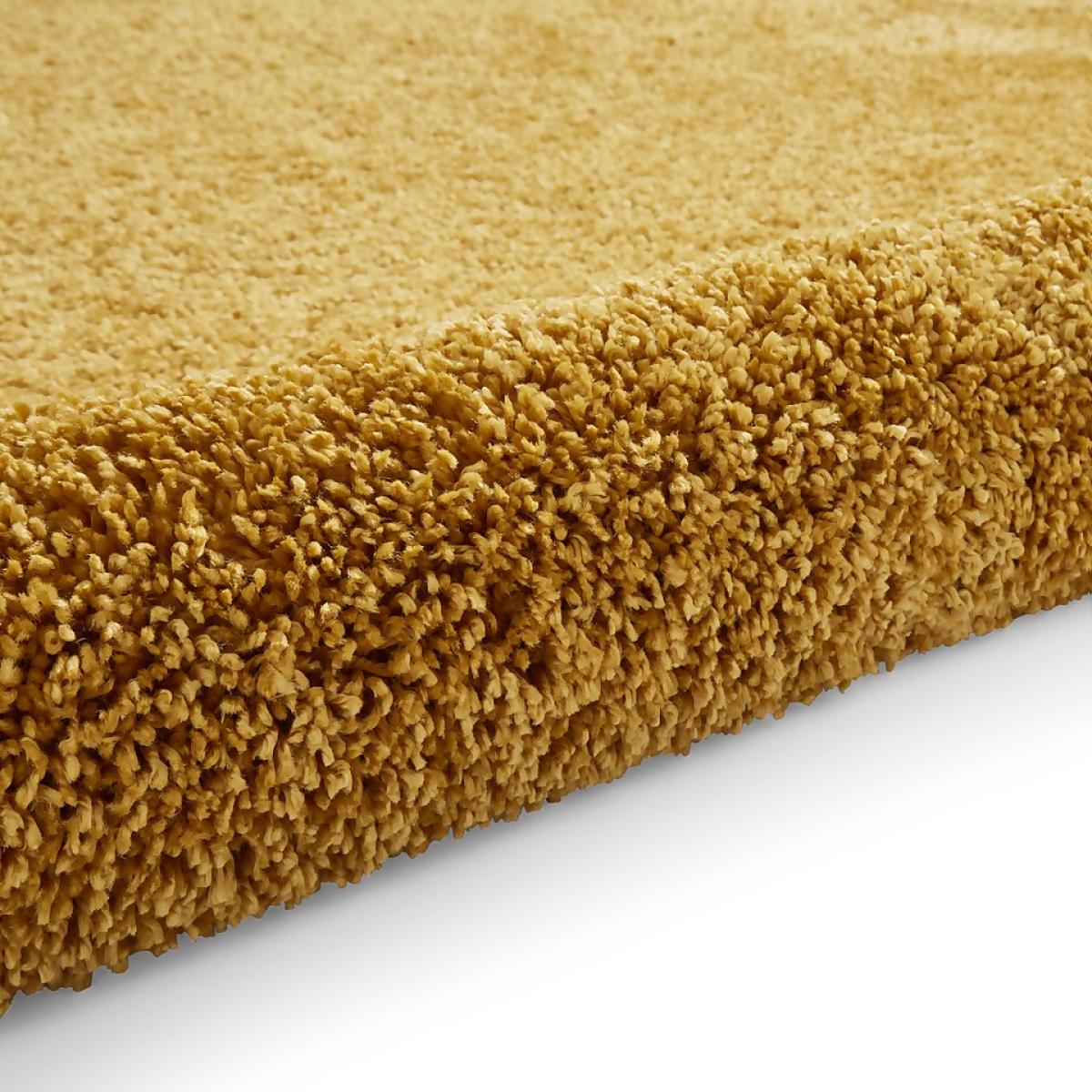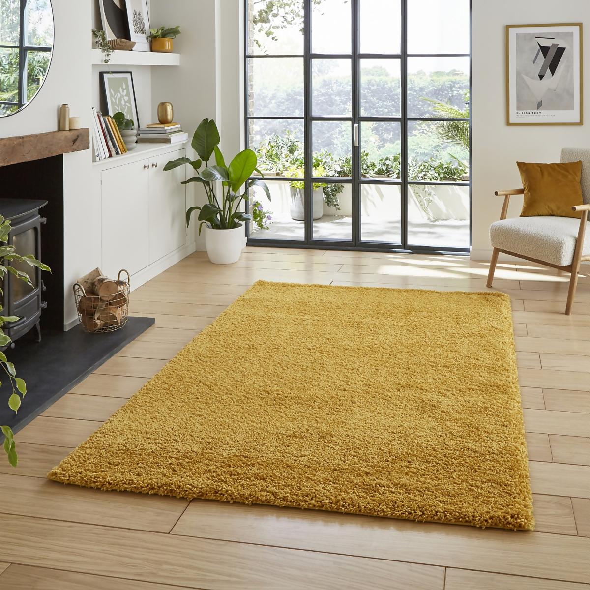 The Ozzy Plain Shaggy Rug in Ochre, measuring 120x170cm, the perfect addition to any living room or bedroom. This rug features a heavy weight shaggy pile construction made from high-quality polypropylene, providing a soft and plush feel underfoot.