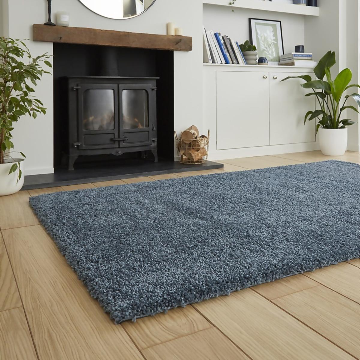 The Ozzy Plain Shaggy Rug in Petrol Blue, measuring 160x230cm, the perfect addition to any living room or bedroom. This rug features a heavy weight shaggy pile construction made from high-quality polypropylene, providing a soft and plush feel underfoot.
