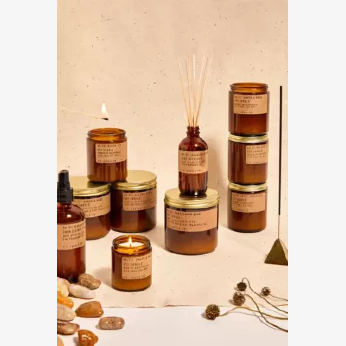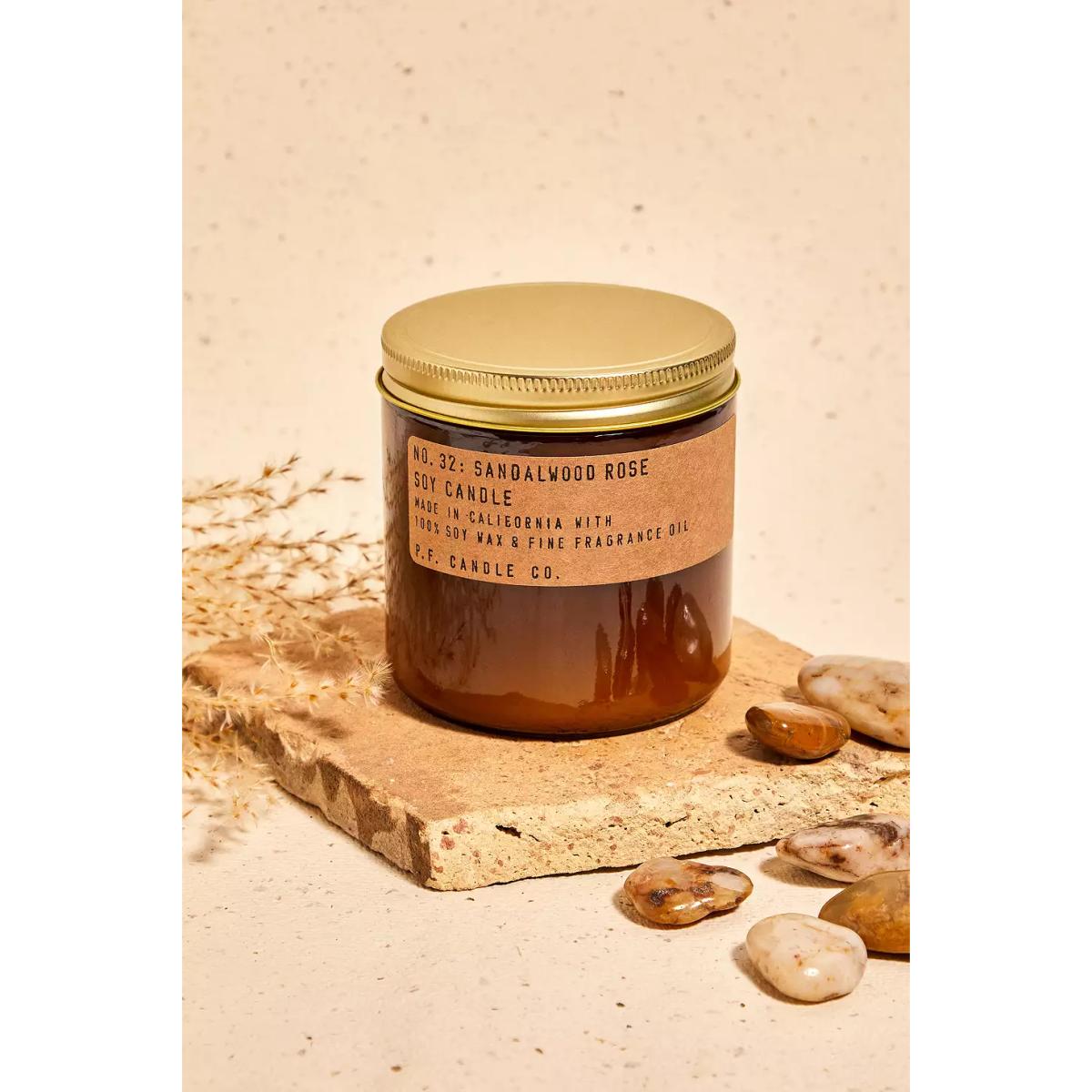 Create your cosiest home with a scented candle by P.F. Candle Co. Housed in a tinted glass jar with a screw-on lid, the candle is made of quality soy wax infused with a deliciously warming scent. **Content + Care** \- Scent: Sandalwood rose \- Soy wax, Glass \- Wipe clean \- Burn time: 40-50 hours **Size** \- Dia: 7.3cm x H: 8.9cm