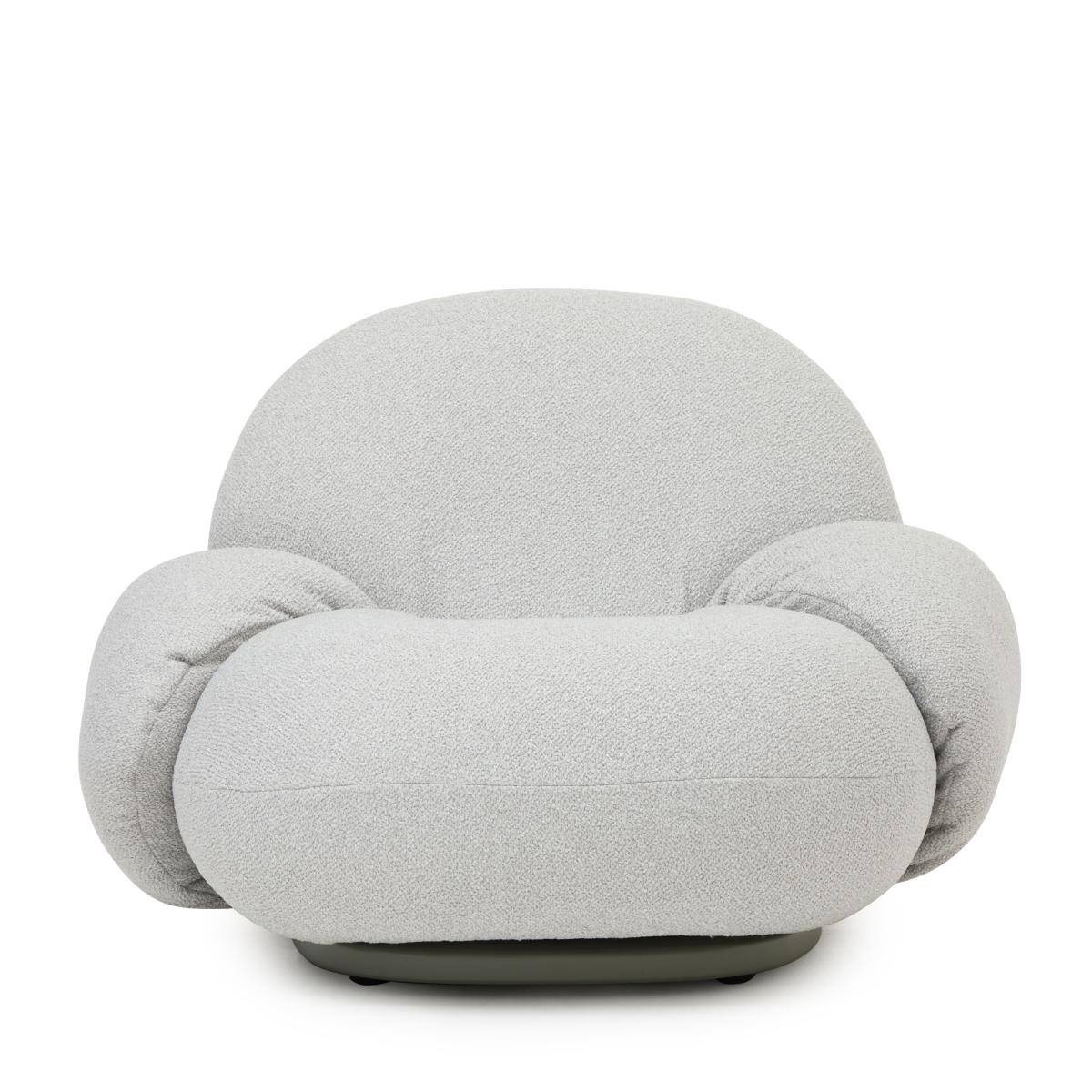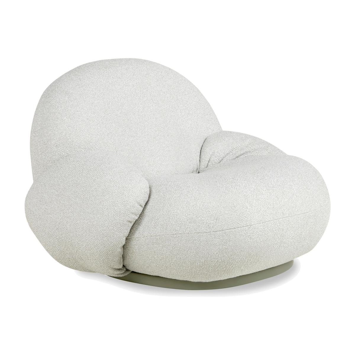 Designed in 1975 by Pierre Paulin for GUBI, the grey-hued Pacha Outdoor Armchair combines sublime comfort with creative expression, now weatherproofed and ready for a new era. With the 70s being a decade of spirited new approaches to design, Paulin designed the Pacha without the constraints of legs, thereby attesting to the comfort and cosiness of low-level living. The Pacha’s elegant, rounded form sits on a stainless steel swivel base and is the result of foam padding, finely stitched lines, a water-resistant interlayer, and Dedar's 'Libera' outdoor bouclé. The tactile, high-performing, and washable polypropylene fabric is resistant to light and moulds.