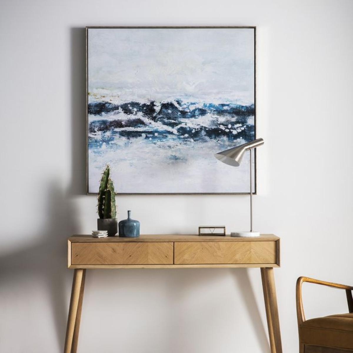 The ocean wave print makes a statement with its calming colour palette and dynamic composition. I love how it brings a touch of nature into urban spaces, making it versatile for both modern and coastal-inspired interiors. It's especially effective above a sofa or in a bedroom to evoke tranquillity. For styling, consider pairing it with minimalist furnishings to let the artwork stand out, or complement it with textured accessories in blues and greys for a cohesive look. Practical tip: hang it at eye level for maximum impact, and ensure it’s well-lit to highlight the brushstrokes and colour variation.