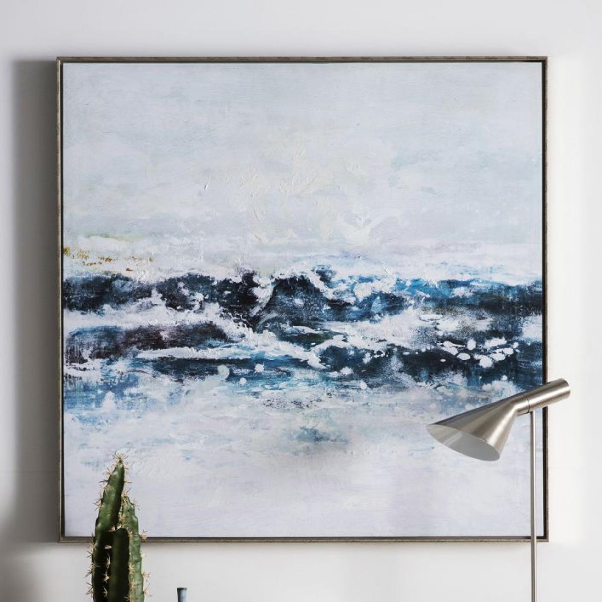 Make waves with this contemporary abstract printed giclee canvas, brought to life with textured hand applied acrylic highlights and set in a stylish antique effect silver frame. Orientation: Square. Fixing Type: D-Ring. Framed:Yes. Colour: Blue.
