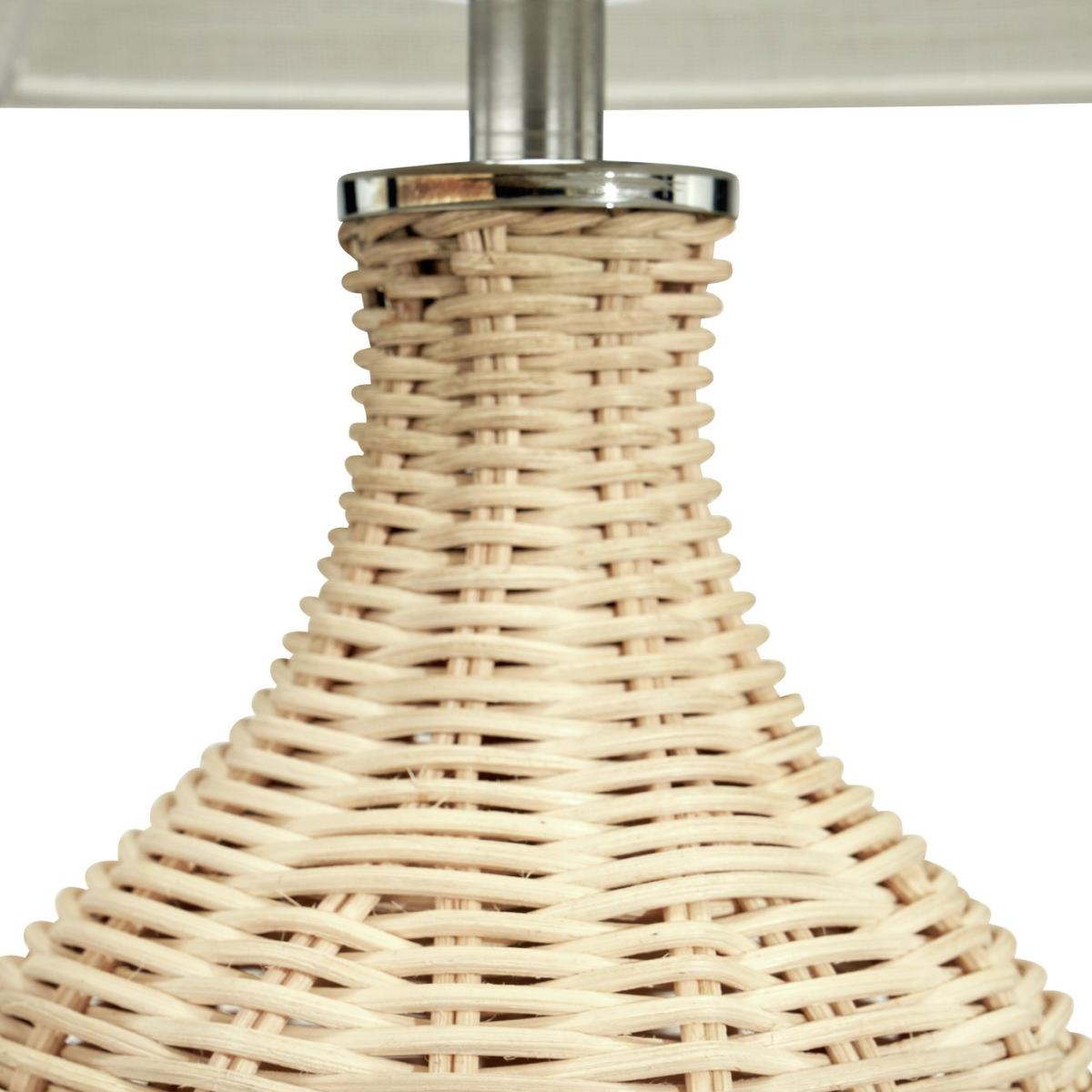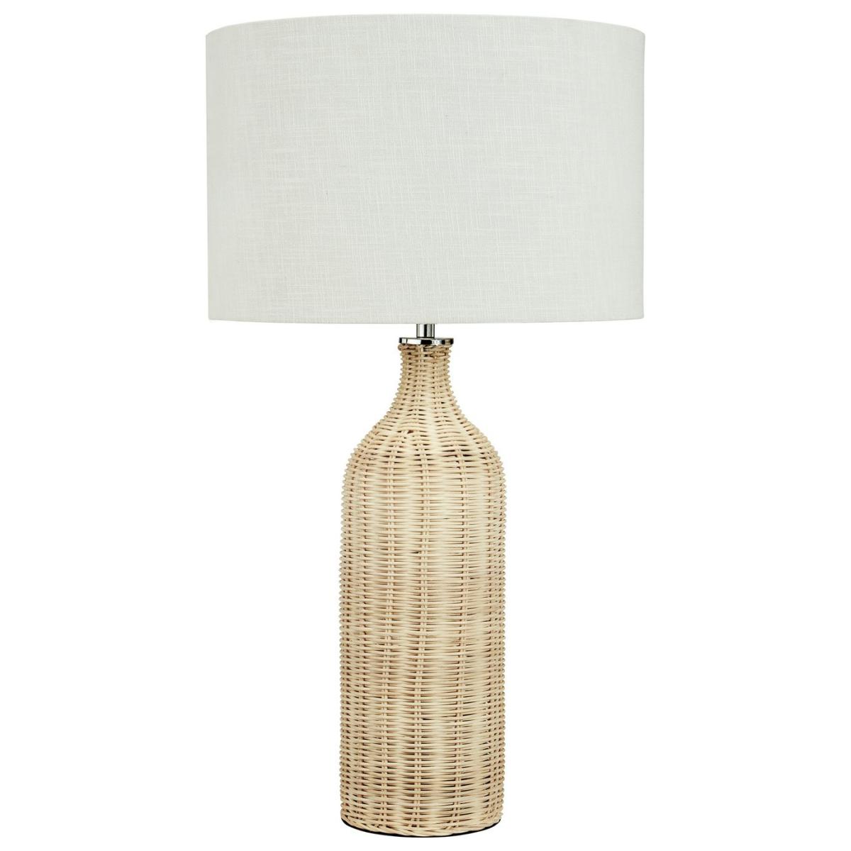 Elevate your home with our stunning woven rattan table lamp in a natural hue. With its delicate weave and elegant tall, bottle shape, this table lamp is guaranteed to make a statement. The table lamp base is topped off perfectly with a lined, textured white linen lampshade. Dimensions: Overall size H62, W35cm. Diameter 35cm. Shade size H20, D35cm. Diameter of base 13cm. Cord length 2m. Bulb Information: Bulbs required 1 x GLS E27 edison screw LED bulb(s)(not included). General Information: Shade colour: natural. Base colour: natural. Shade material: faux linen. Base material: rattan. In-line switch. IP rating 20. Minimal assembly. Product is mains powered plug in. This lighting product is a class 2 fitting. Manufacturer's 1 year guarantee.