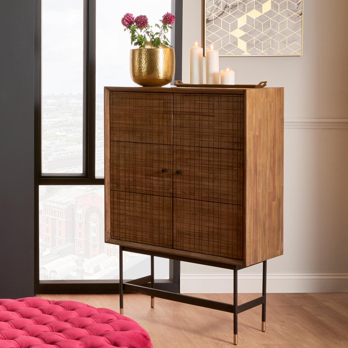 I love this drinks cabinet for its sleek, modern design and rich acacia finish, which adds warmth and sophistication to a variety of interiors. It works particularly well in contemporary or mid-century styled spaces, but can also add a stylish touch to eclectic or industrial settings. Practical styling tips include keeping the top surface minimal with a statement vase or a few candles, while utilising the internal storage for glassware and bottles. Placing it near a seating area or bar corner creates a functional yet attractive focal point, and layering with textured textiles or metallic accessories can elevate its look further. Its versatile design makes it a great functional piece that combines practicality with elegance.
