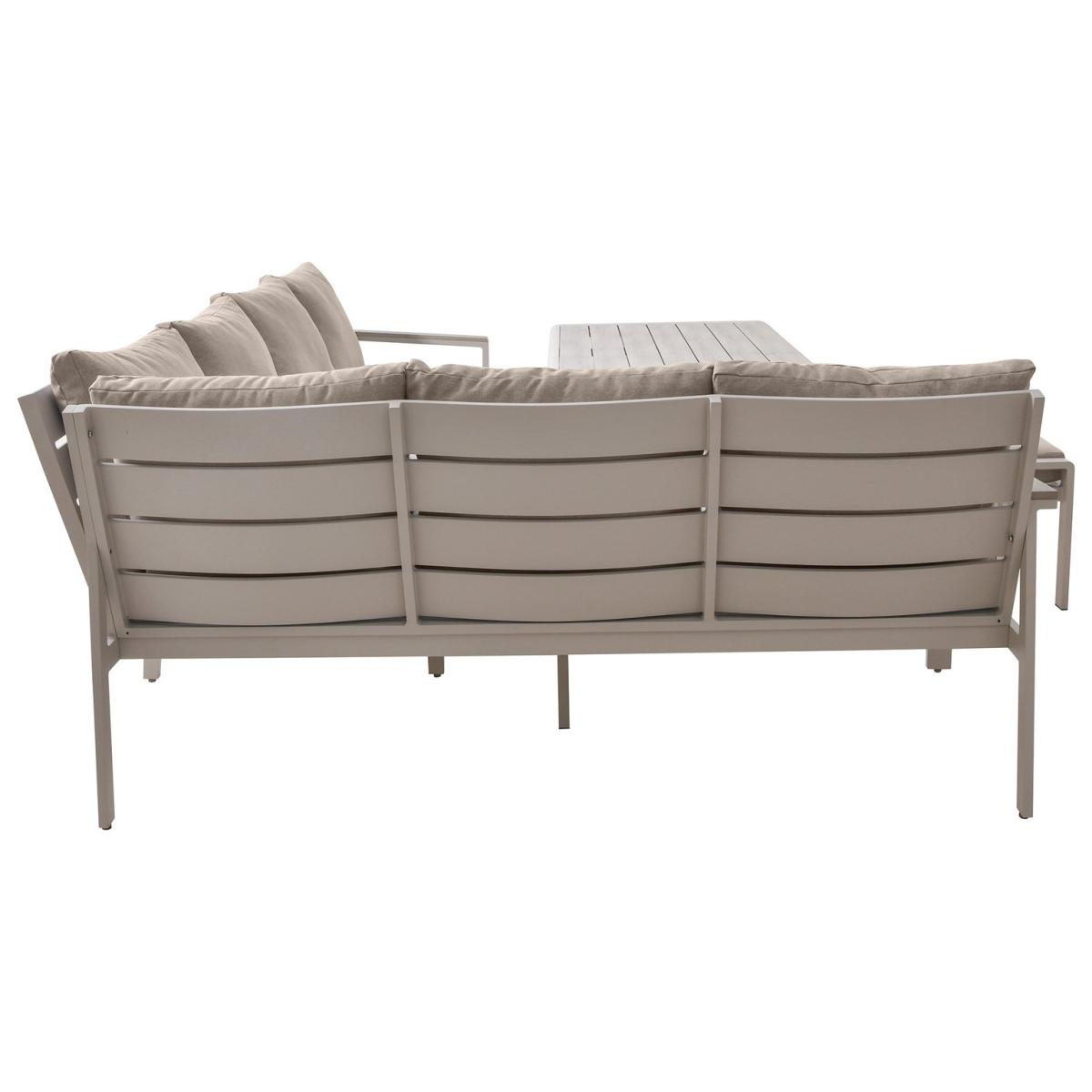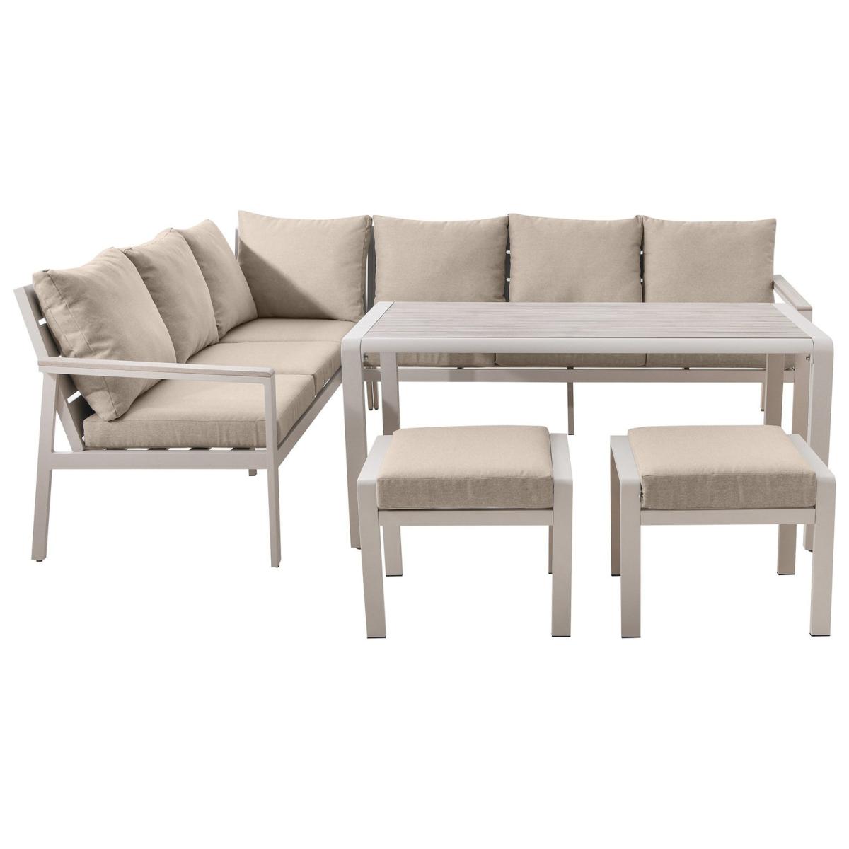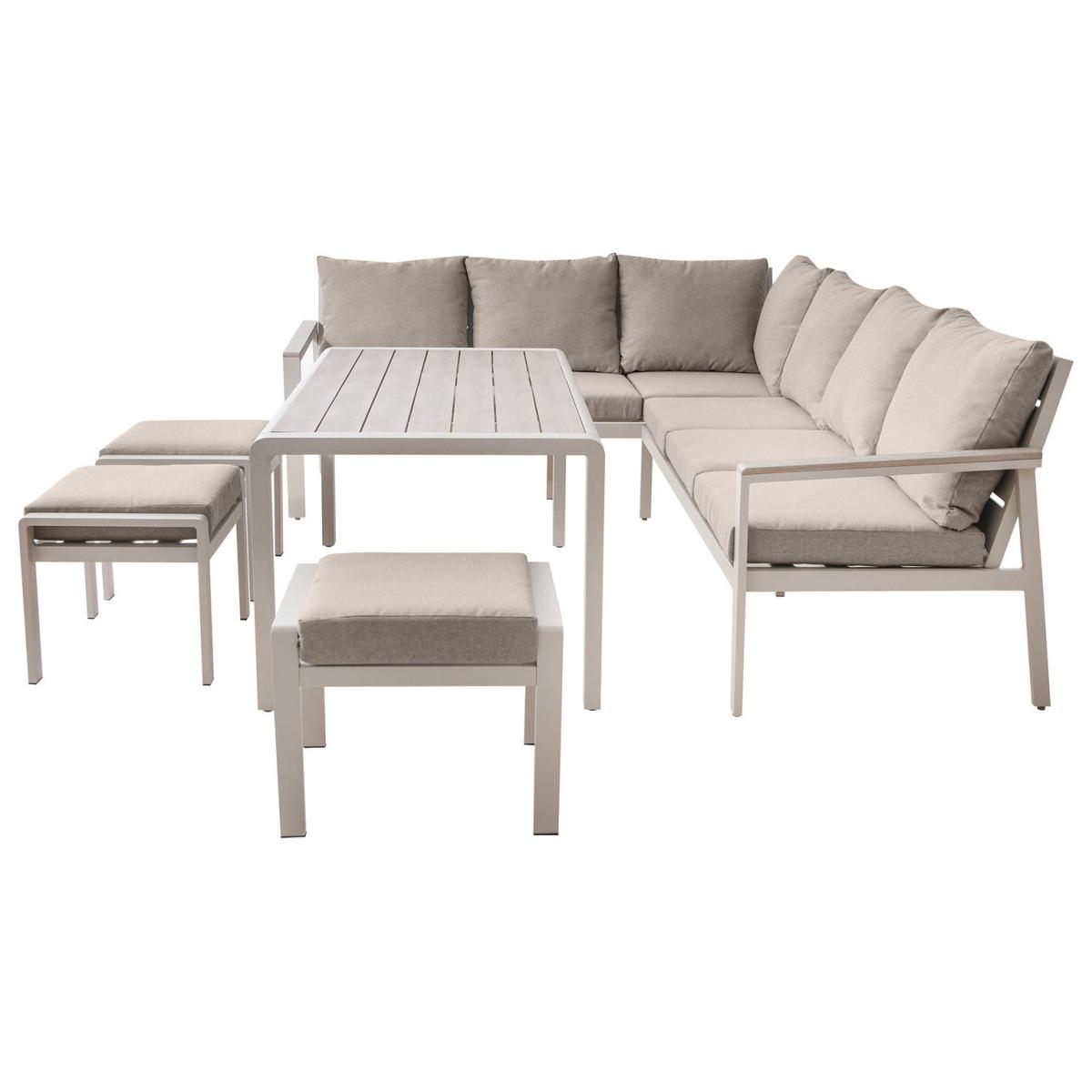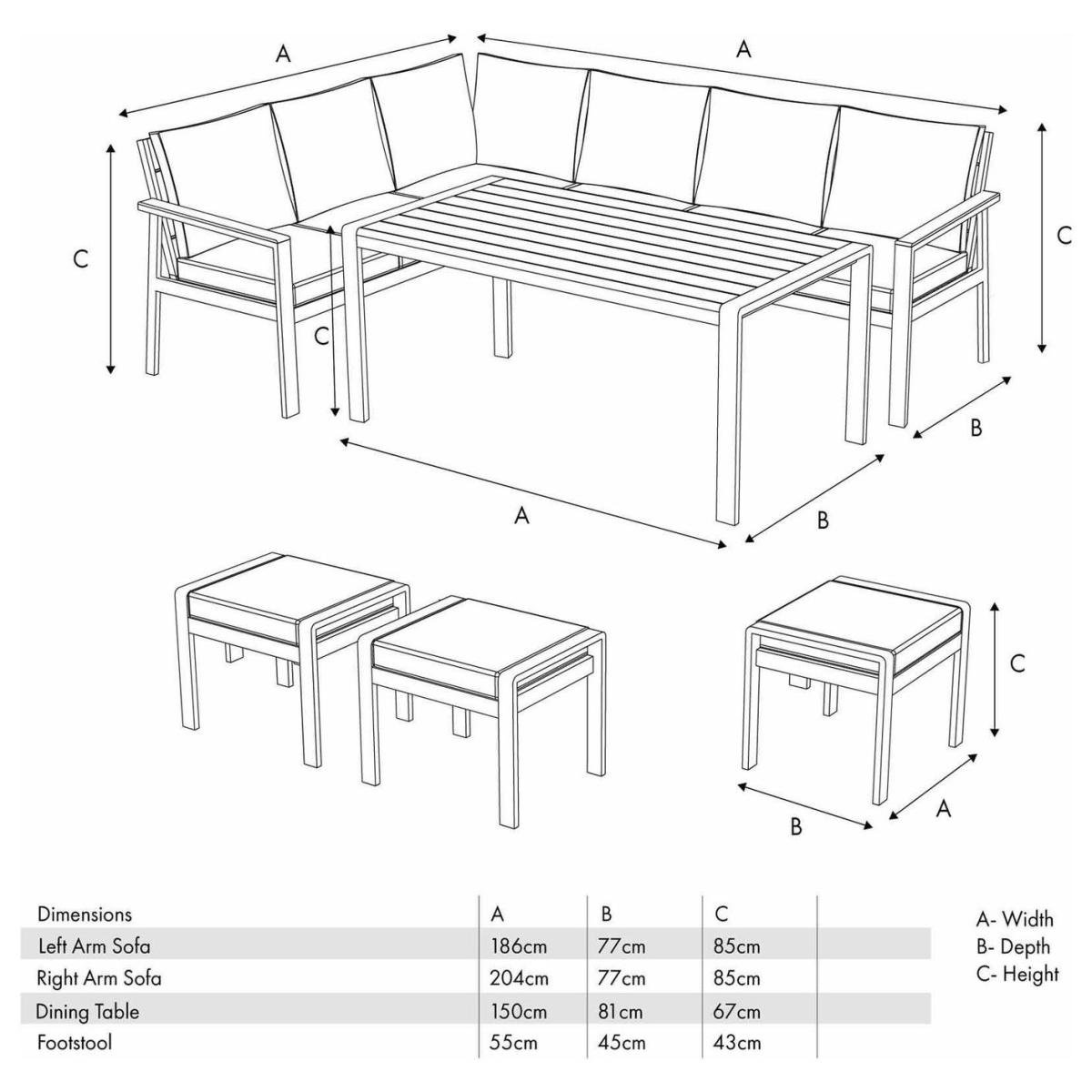 The Aruba offers a contemporary design, giving your garden a modern update. The modern shape with a mid height back design for comfort, consists of a 4 seater right arm sofa, 3 seater left arm sofa, 3 footstools, along with a rectangular aluminium framed table made from polywood. The perfect addition to any patio or garden area. Part of the Aruba collection. Parasol base not included. Parasol not included. Includes 17 cushions. General features: Set seats 10 people. Set made from aluminium. Cover or store inside in winter months to prolong life of the products. Total weight 81kg. Garden table features: Wood table top. Table size: H67, W150, L81cm. Chair features: Chair seat and back made from aluminium. 110kg maximum user weight per chair. Sofa features: Sofa size H85, W204. D186cm. 660kg maximum user weight per sofa. Stool features: Stool size H43, W55, D45cm. 110kg maximum user weight per stool. Cushion features: Olefin and Putty cushions. Removable covers. Washable covers. Stain resistant. Remove cushions when not in use and store inside. Packaging information: Package 1 size H56, W183, D66cm. Package 1 weight 57kg. Package 2 size H22, W141, D84cm. Package 2 weight 32kg. General Information: Minimal assembly - 2 people required. Manufacturer's 3 year guarantee.