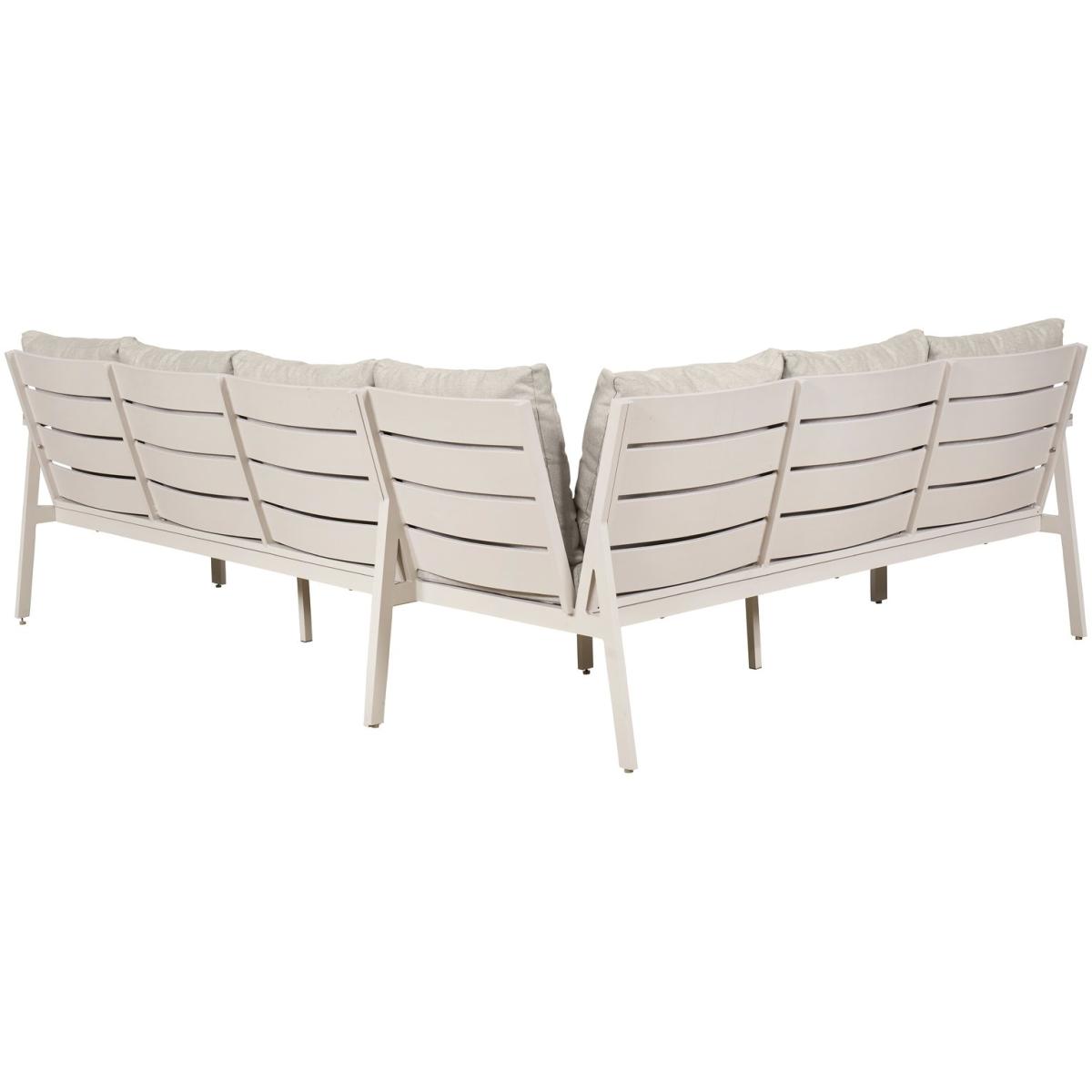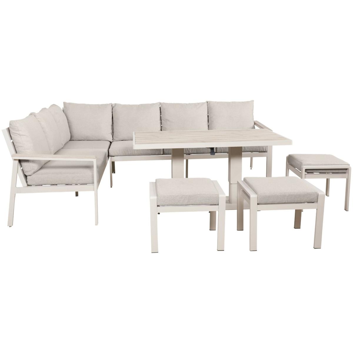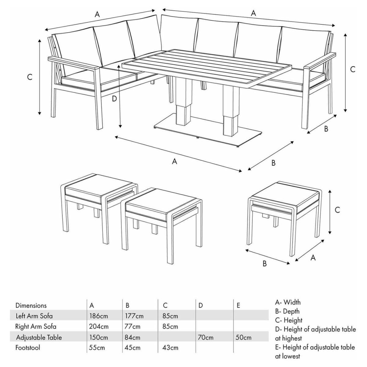 The Aruba offers a contemporary design, giving your garden a modern update. The modern shape with a mid height back design for comfort, consists of a 4 seater right arm sofa, 3 seater left arm sofa, 3 footstools, along with a rectangular aluminium framed table made from polywood. The perfect addition to any patio or garden area. Part of the Aruba collection. Parasol base not included. Parasol not included. Includes 16 cushions. General features: Set seats 10 people. Set made from aluminium and wood. Cover or store inside in winter months to prolong life of the products. Total weight 124kg. Garden table features: Wood table top. Table size: H70, W150, L84cm. Sofa features: Sofa size H85, W204. D77cm. Stool features: Stool size H43, W55, D45cm. 110kg maximum user weight per stool. Cushion features: Olefin and grey cushions. Stain resistant. Remove cushions when not in use and store inside. Packaging information: Package 1 size H56, W183, D66cm. Package 1 weight 57kg. Package 2 size H24, W143, D87cm. Package 2 weight 47.6kg. Package 3 size H18, W49, D28cm. Package 3 weight 19.4kg. General Information: Self-assembly - 2 people required. Manufacturer's 3 year guarantee.