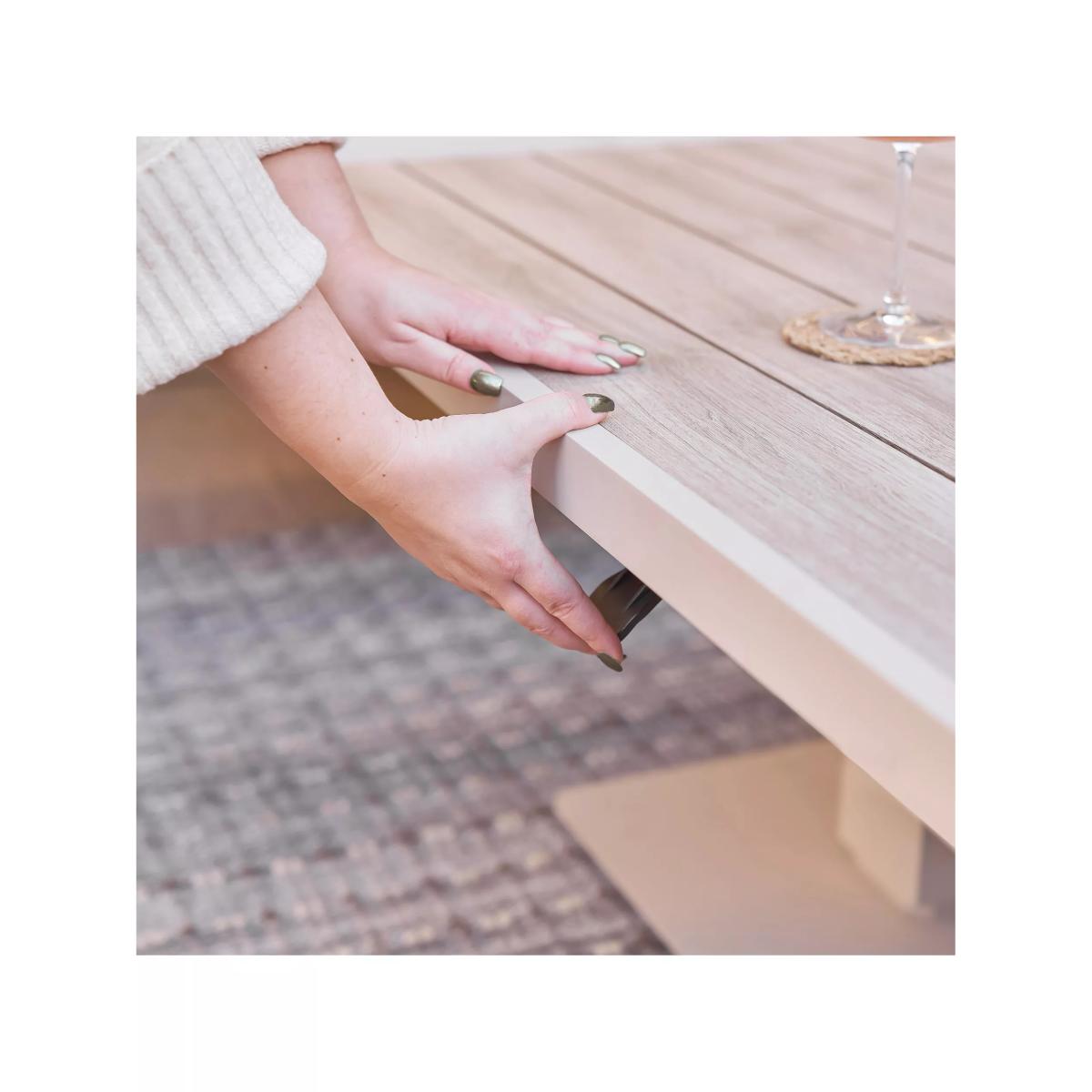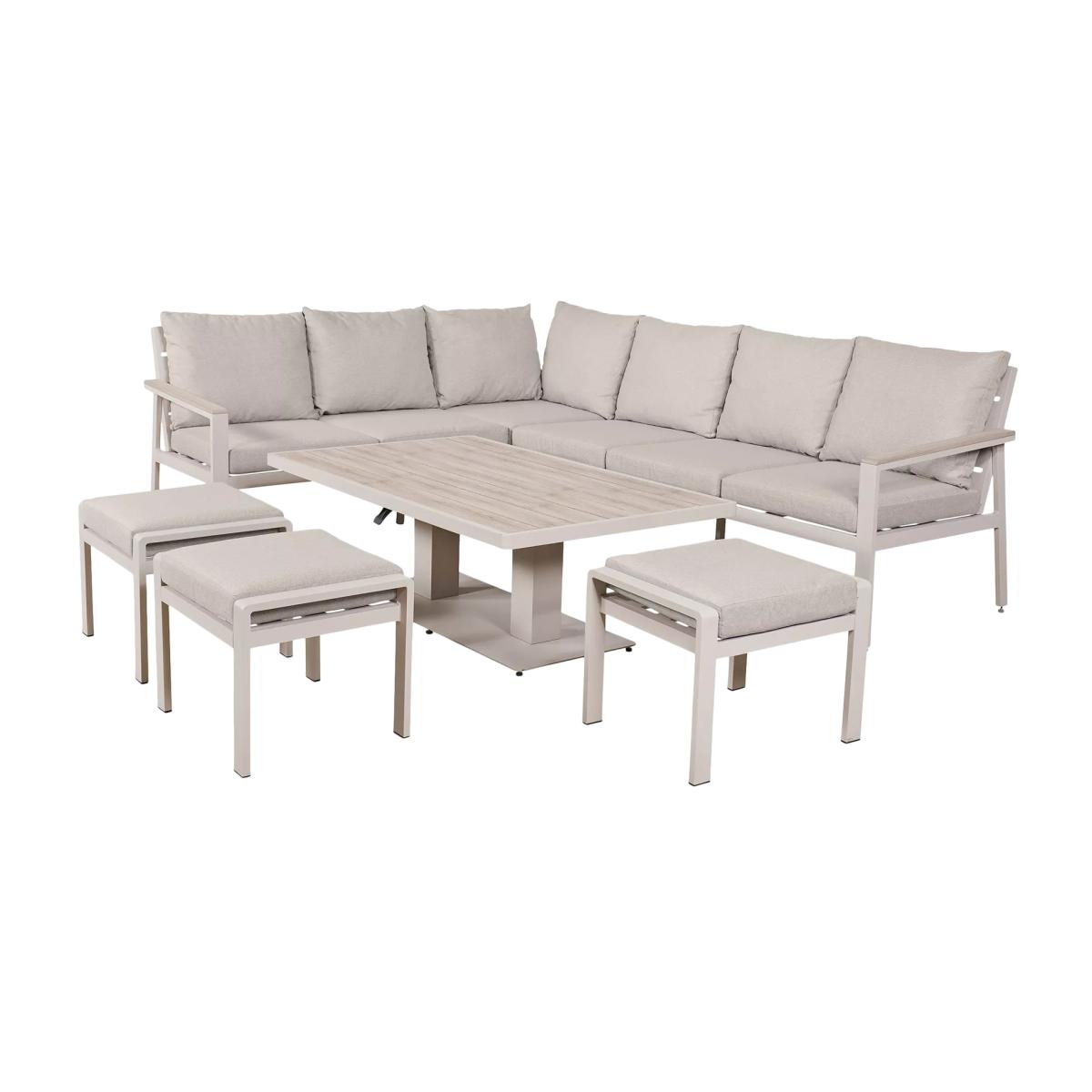 The Aruba is a contemporary design, giving your garden a modern update. Made from quality materials, the furniture has powder-coated aluminium frames in a Latte finish. The rectangular coffee table has a polywood table top in an Ash colour and is height-adjustable for use as a casual dining table. Season-proof seat and backrest cushions provide comfort and are made of Putty-coloured Olefin fabric that's highly resistant to staining and fading, and dries quickly. Key features: Height-adjustable rectangular garden coffee table with a polywood top in Ash Five-seater corner garden sofa set Three garden stools Powder-coated aluminium frames in Latte Shower-resistant seat and backrest cushions included