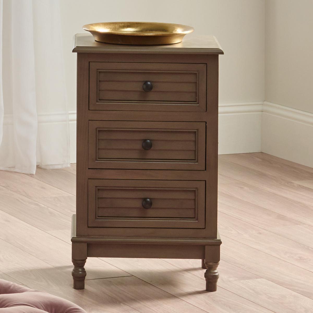 I love this bedside table for its versatile taupe pine finish, which works particularly well in neutral and earthy interiors, adding warmth without overpowering the space. It's ideal for both traditional and contemporary bedrooms, especially when paired with cosy textiles or minimalist decor. For styling, consider layering with a small table lamp, a glass of water, or some books for a lived-in look. Its practical three drawers provide plenty of storage, keeping your essentials neatly tucked away, while the understated design ensures it complements rather than competes with existing furnishings. This piece is a great choice for anyone looking to add a touch of understated elegance while maintaining functionality.