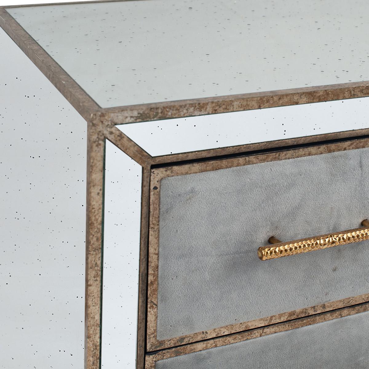 The bedside table is a stunning piece that combines modern elegance with a touch of glamour thanks to its grey velvet finish and mirrored accents. It works particularly well in contemporary, luxe, or even transitional interiors, adding a sophisticated layer without overpowering the space. To style it effectively, consider keeping the surface minimal-perhaps a simple lamp, a small vase, or a few personal touches-while using the drawers for practical storage of personal essentials. Pairing it with plush textiles or statement lighting can elevate its look, making it a focal point as well as an everyday practical piece.