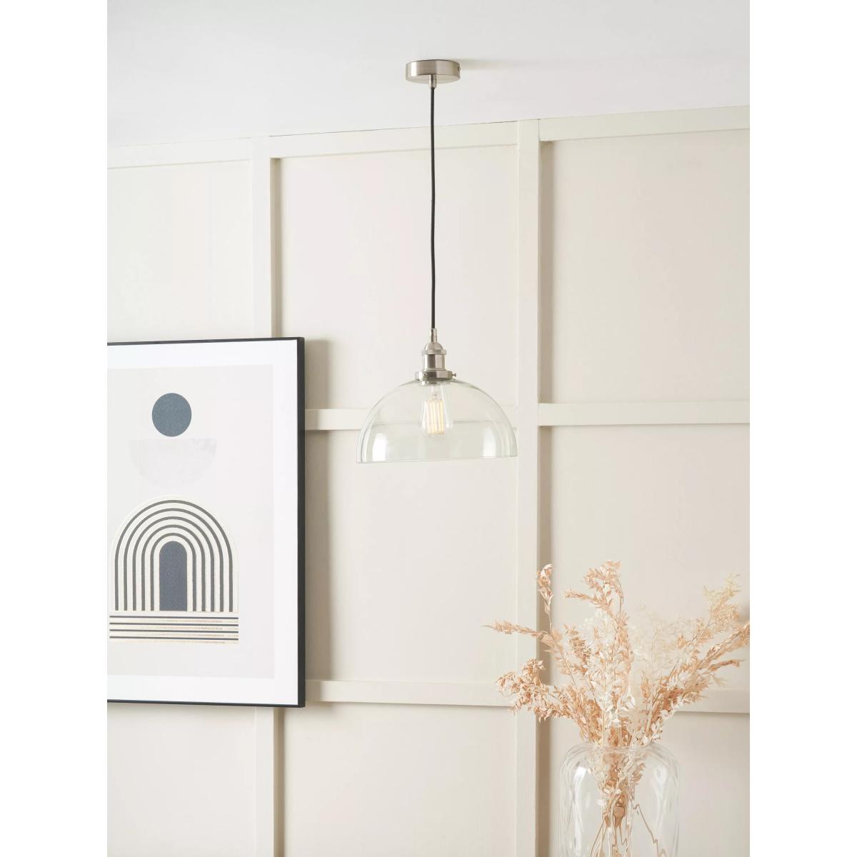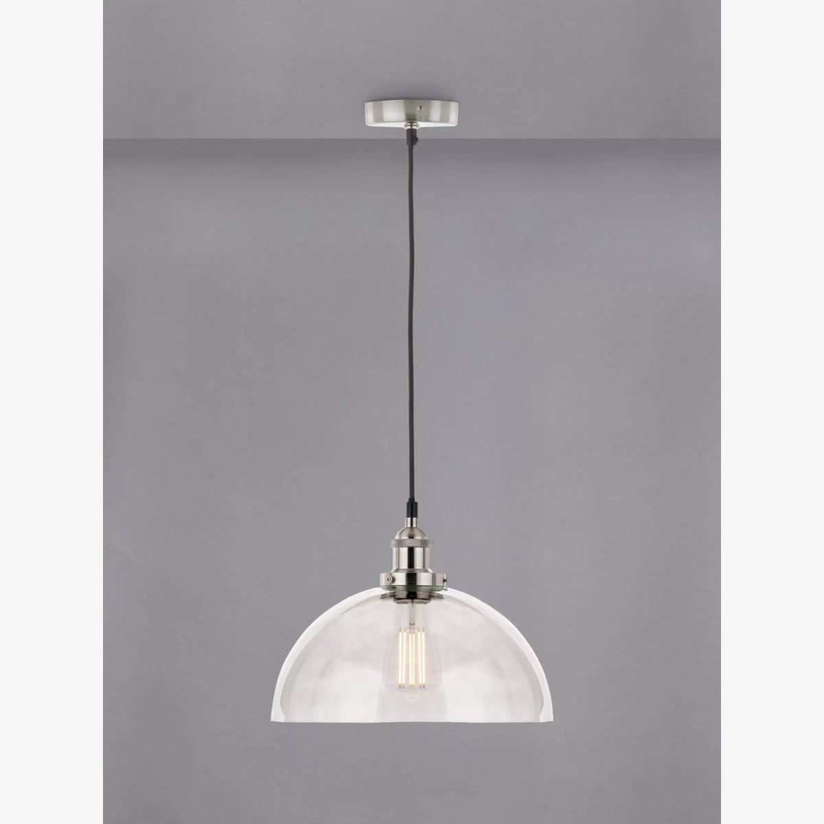 I love this pendant for its sleek, modern look that works particularly well in contemporary or minimalist interiors. The glass dome adds a touch of sophistication while still maintaining a practical, unobtrusive presence. It’s perfect for kitchens over islands, dining areas, or even in a bathroom where a clean, lightweight aesthetic is desired. When styling with this light, consider pairing it with other metallic finishes or neutral colour palettes to keep the space feeling cohesive. For a layered lighting effect, hang a few at varying heights or combine with wall-mounted fixtures to create a functional yet stylish ambience.