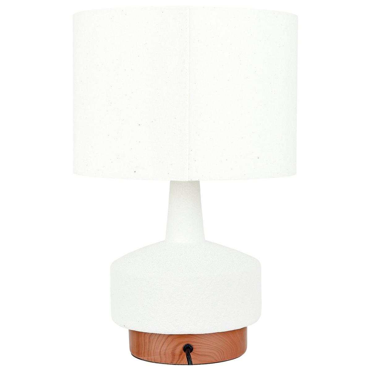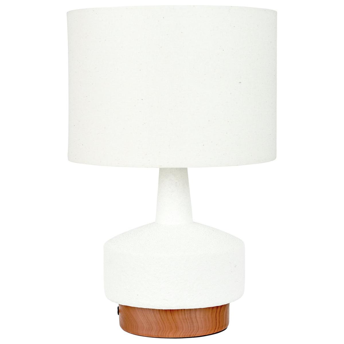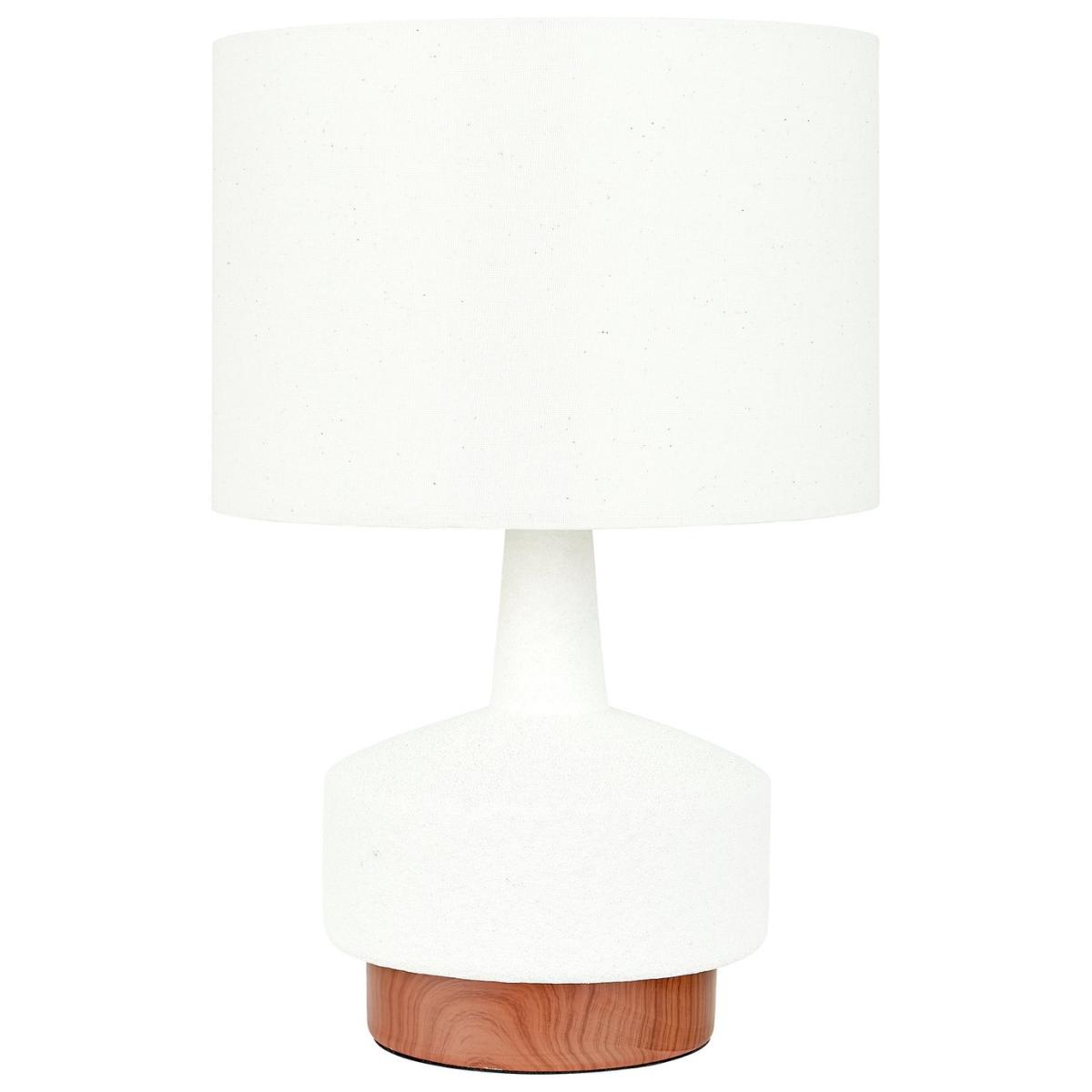 This stunning ceramic table lamp is most certainly eye-catching. The base is finished with a dark wood grain effect, contrasting with the white, sane textured body perfectly. The contemporary shaped base is topped off with a white faux linen lampshade, to complete the look. Dimensions: Overall size H43, W28, D28 cm. Diameter 28cm. Shade size H20, D28cm. Diameter of base 19cm. Cord length 2m. Bulb Information: Bulbs required 1 x GLS E27 edison screw LED bulb(s)(not included). General Information: Shade colour: white. Base colour: white. Shade material: faux linen. Base material: ceramic. In-line switch. IP rating 20. Minimal assembly. Product is mains powered plug in. This lighting product is a class 2 fitting. Manufacturer's 1 year guarantee.