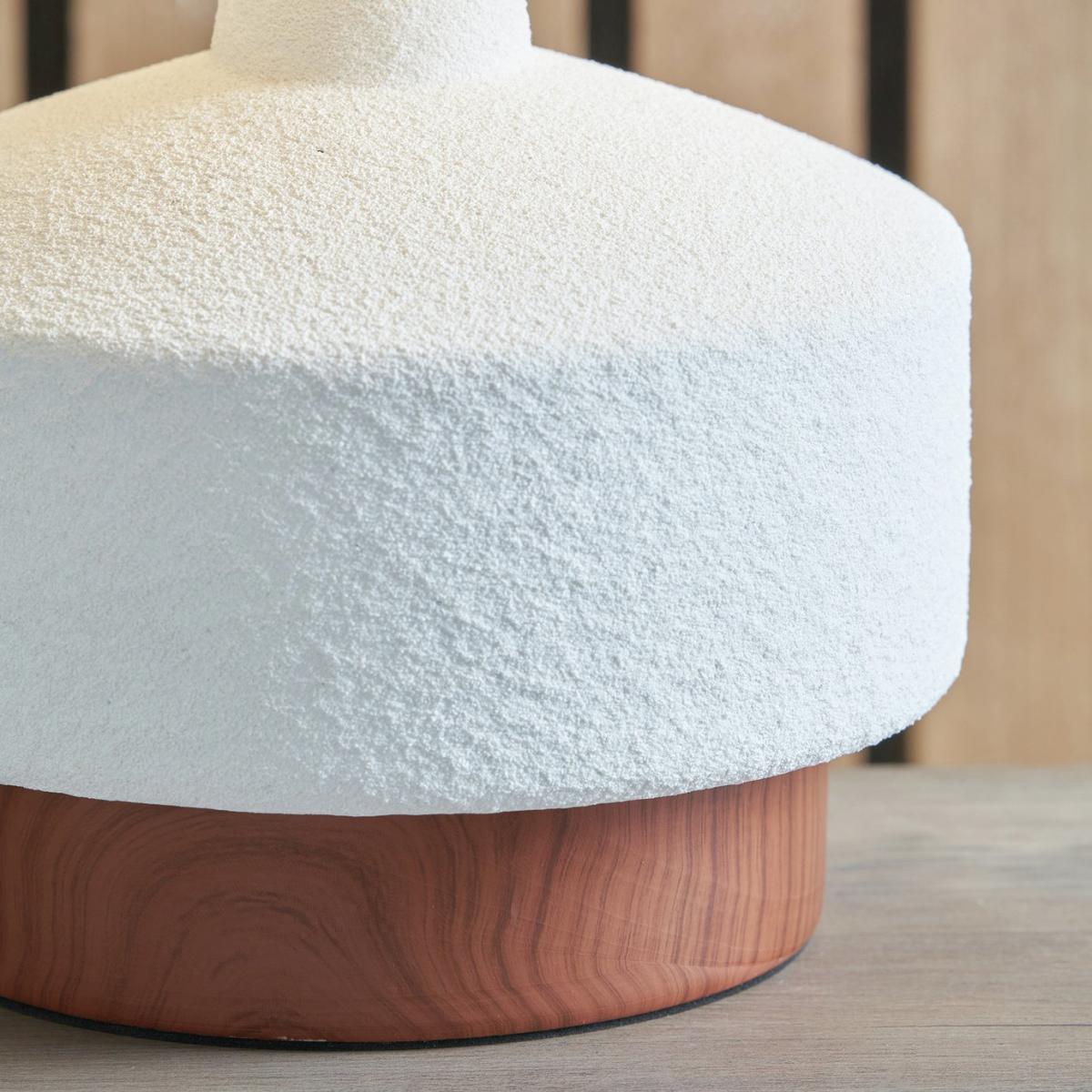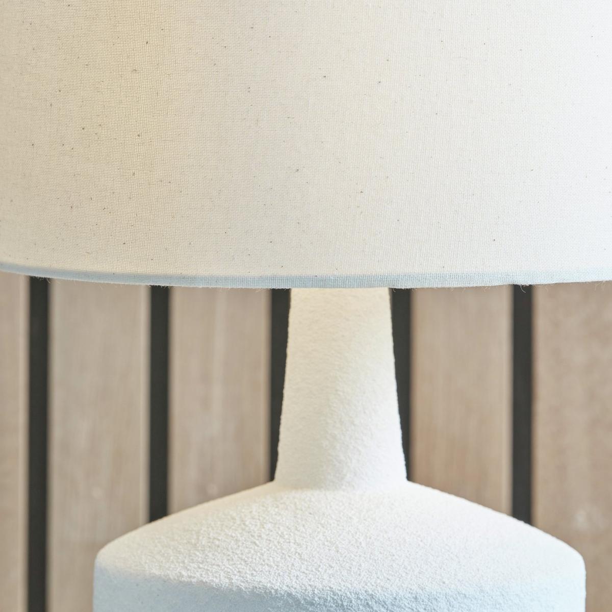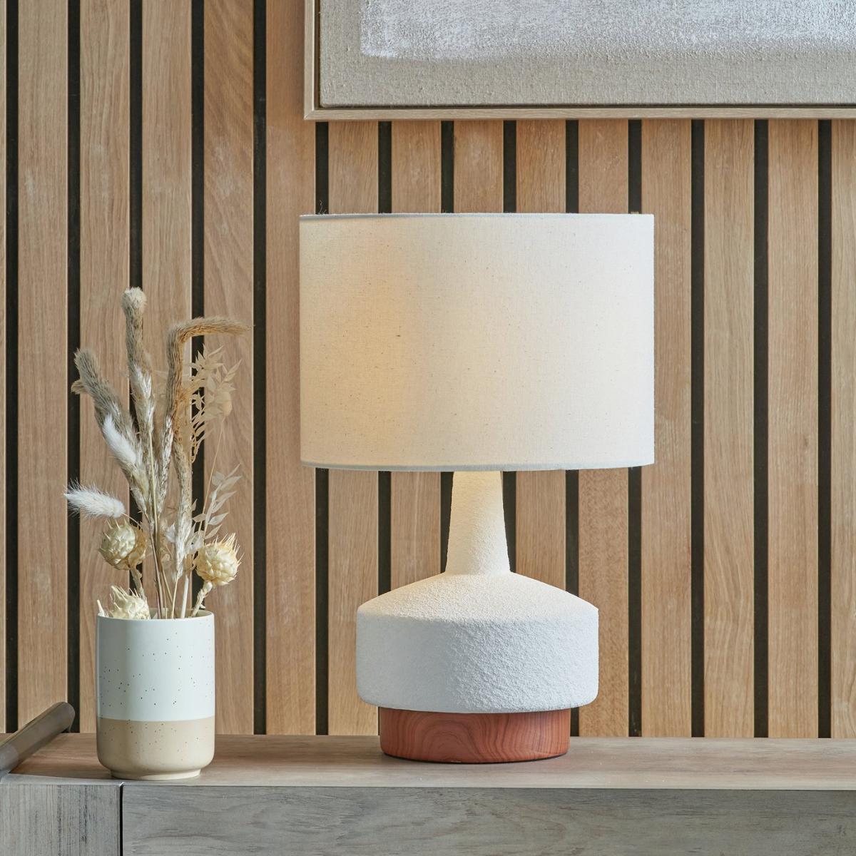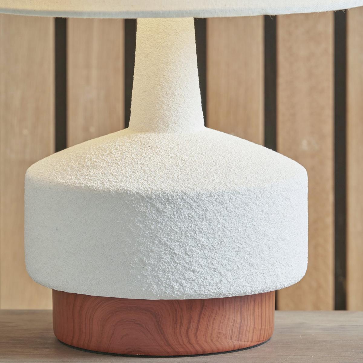 This stunning ceramic table lamp is most certainly eye-catching. The base is finished with a dark wood grain effect, contrasting with the white, sane textured body perfectly. The contemporary shaped base is topped off with a white faux linen lampshade, to complete the look. Dimensions: Overall size H43, W28, D28 cm. Diameter 28cm. Shade size H20, D28cm. Diameter of base 19cm. Cord length 2m. Bulb Information: Bulbs required 1 x GLS E27 edison screw LED bulb(s)(not included). General Information: Shade colour: white. Base colour: white. Shade material: faux linen. Base material: ceramic. In-line switch. IP rating 20. Minimal assembly. Product is mains powered plug in. This lighting product is a class 2 fitting. Manufacturer's 1 year guarantee.