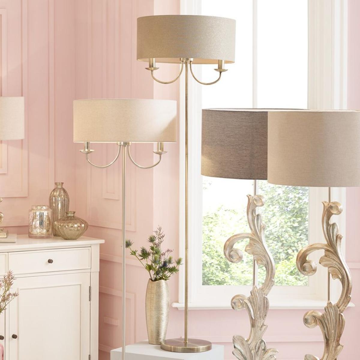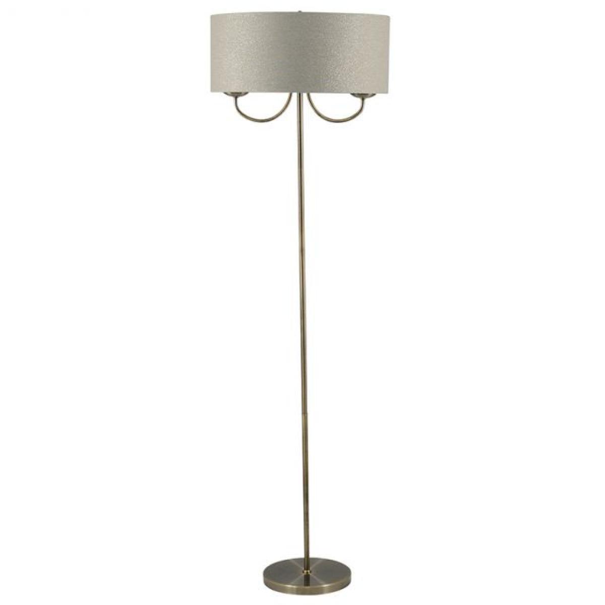 Elegant shaded two arm floor lamp finished in a soft antique brass and topped with a slim shade in linen effect material with a pretty glitter thread running through. Adds a classic style with a modern twist to any room. Also a available in a pendant if required. Height: - 160cm  Width: 47cm Depth: 47cm