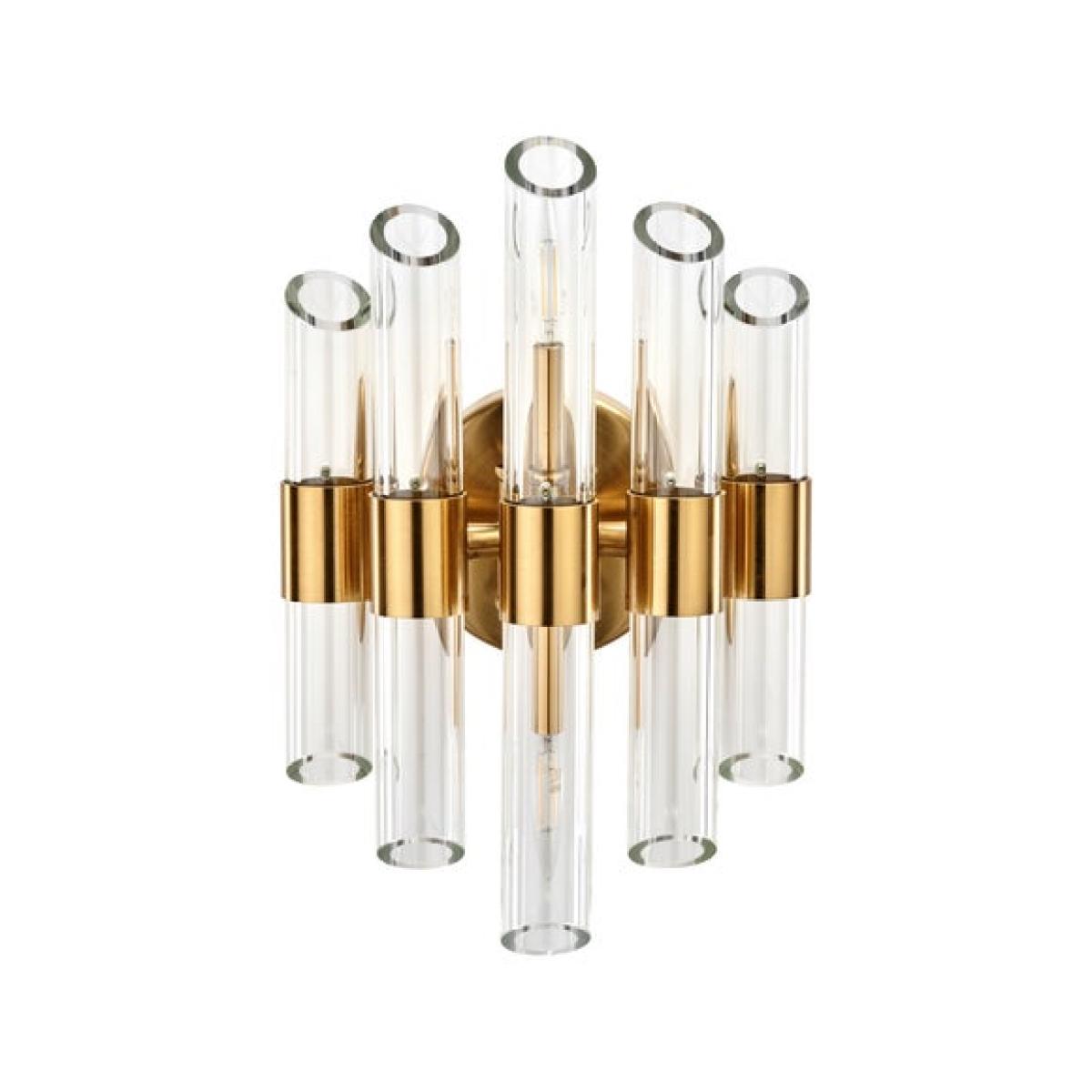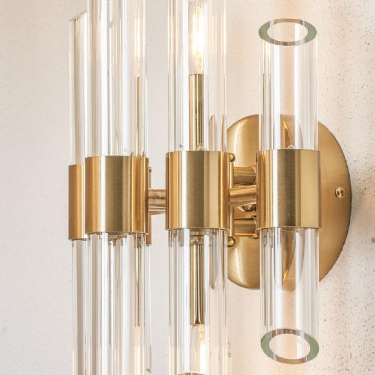 This wall light is a sleek, contemporary choice that works beautifully in modern and eclectic interiors. I love how the clear glass tubes combined with the gold accents create a statement piece without overwhelming the space. It’s ideal for adding focused lighting to bedrooms, living rooms, or even hallways where you want a touch of sophistication. When styling, consider placing it next to artwork or mirrors to reflect light and enhance its visual impact. For practical use, it’s best paired with warm bulbs to accentuate the gold detailing and create a welcoming ambiance, making it both functional and stylish.