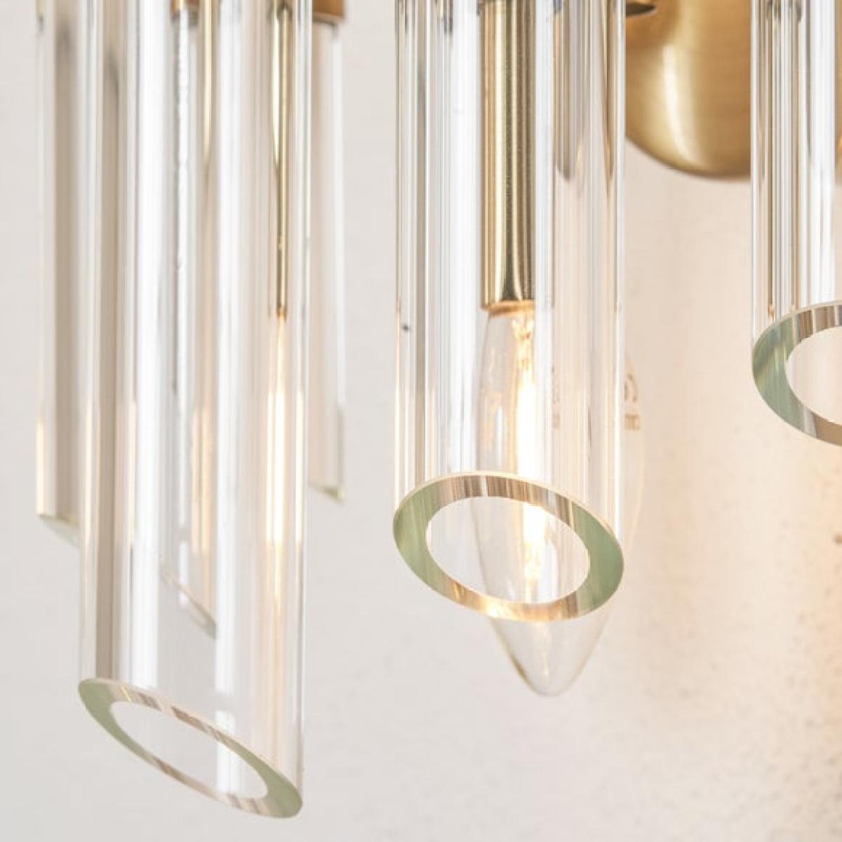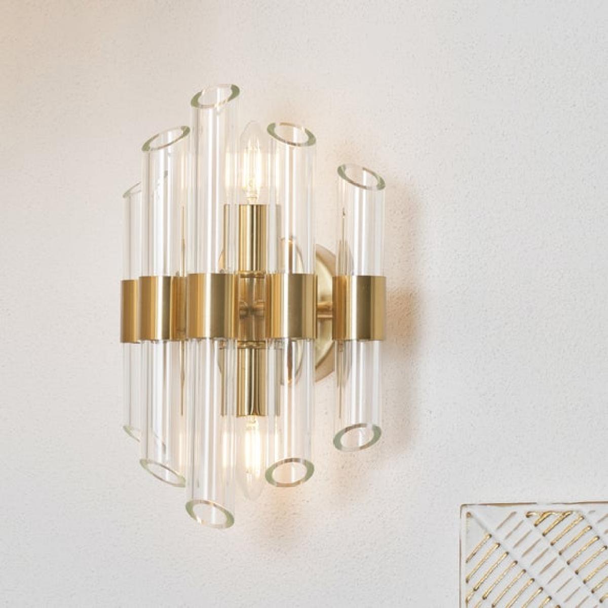 * Striking, Eye-Catching Design * Cylindrical Glass Shades * Requires: Candle Bulbs & E14 Cap Type Add instant impact with the Brielle 2 Light Wall Light. Its elegant glass tubes and antique brass accents make any wall a statement feature.