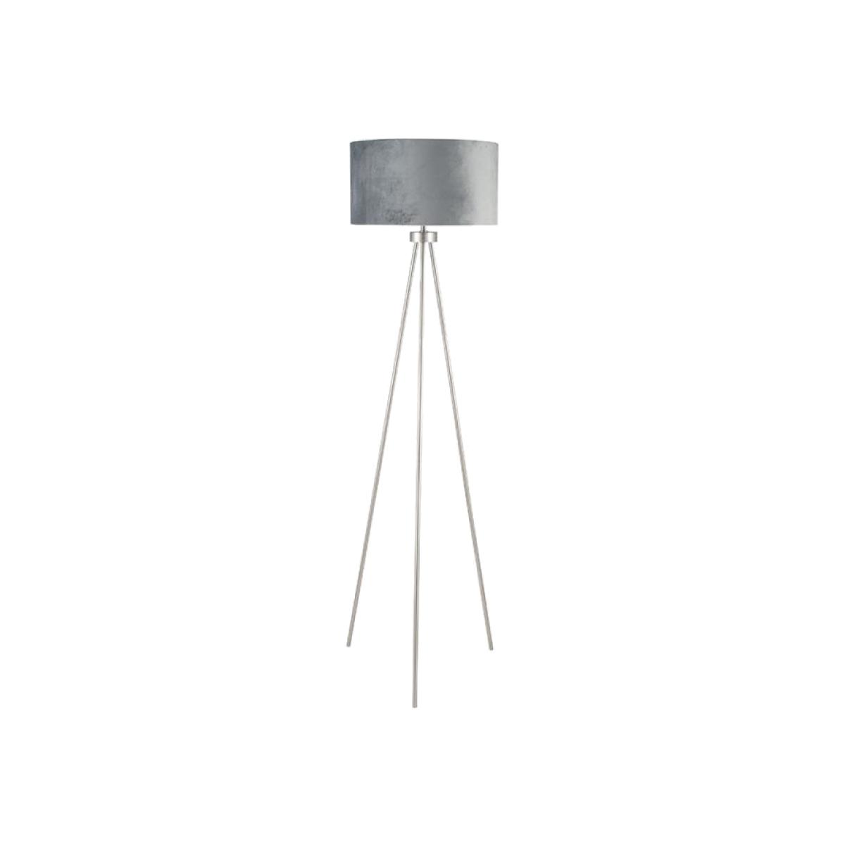 This contemporary tripod floor lamp is a simple yet elegant style with slim legs and brushed silver finish. The shade is a luxurious grey velvet lined in a matching faux cotton adding sophisticated glamour to any room.