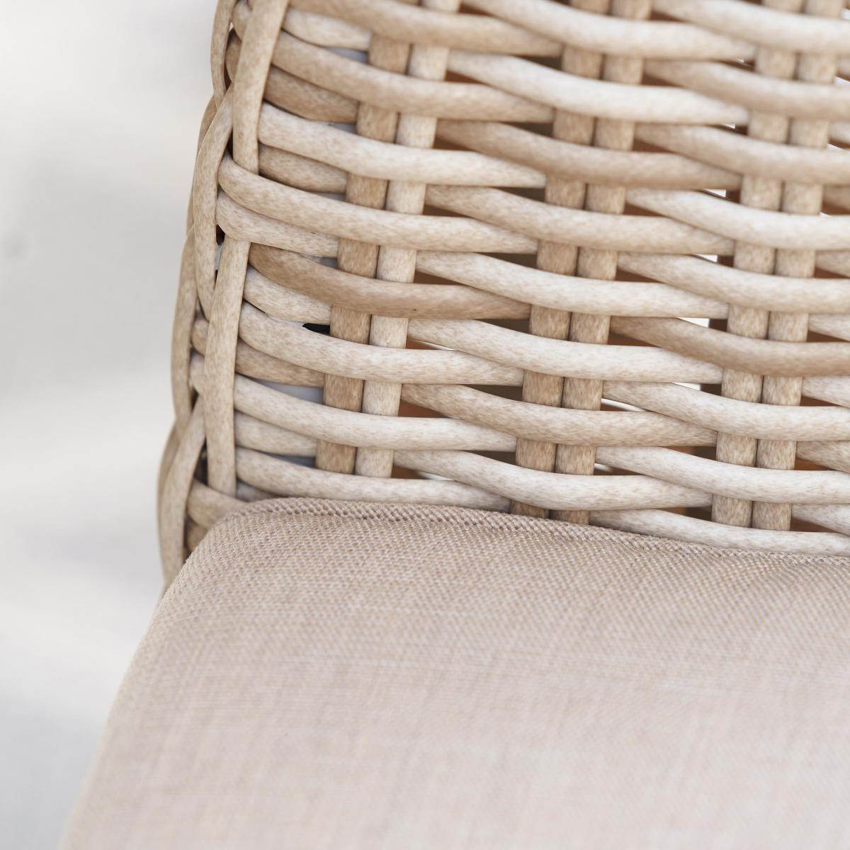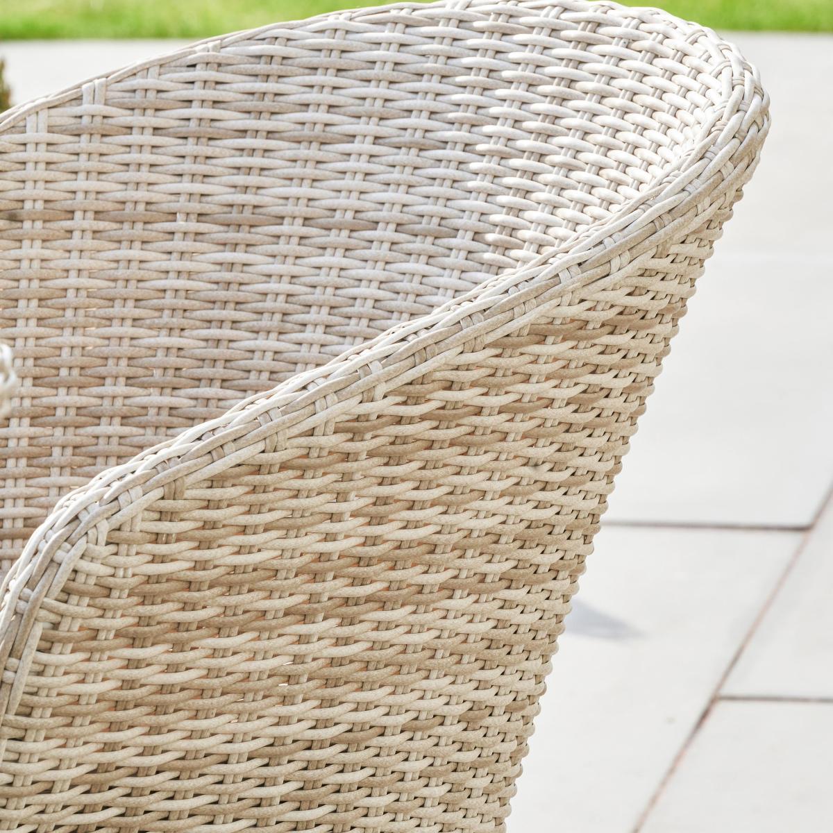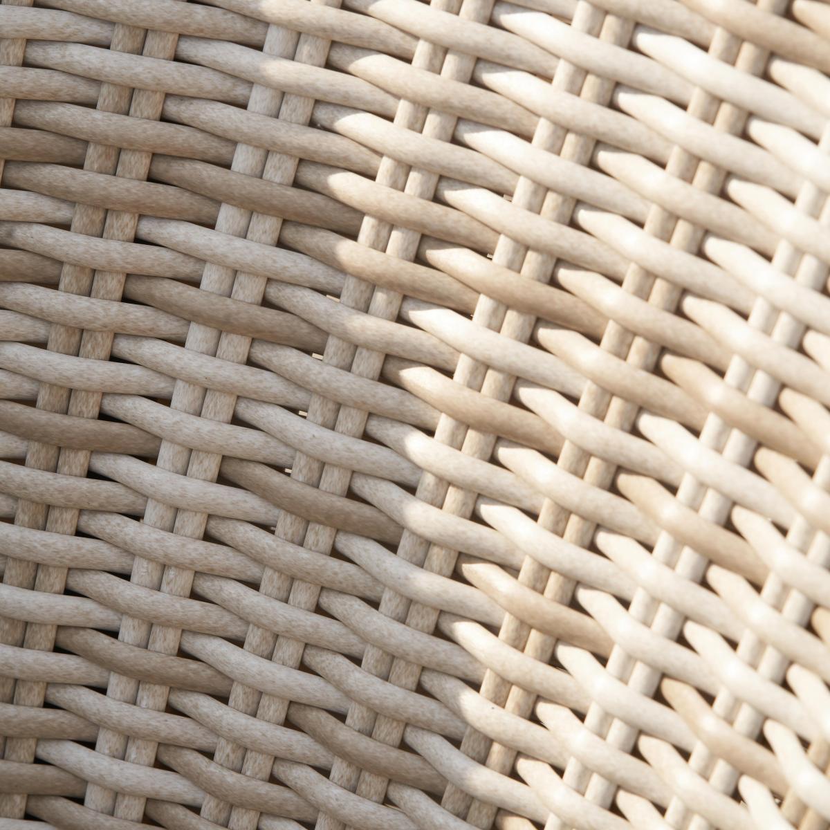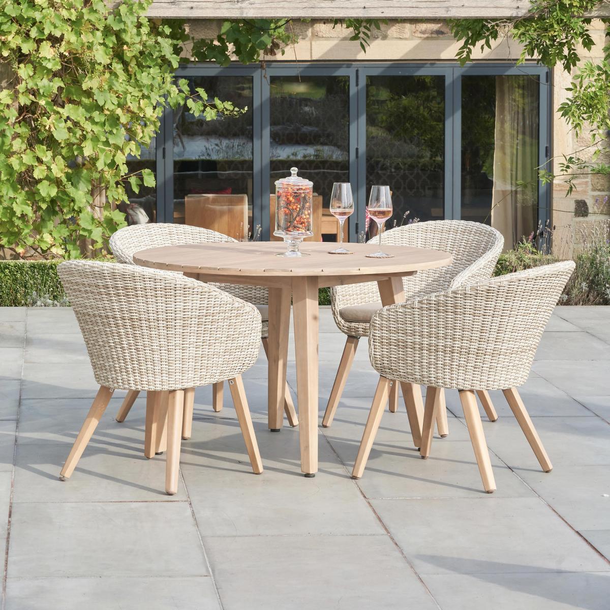 * 1 x table and 4 x chairs * Rattan design * Acacia wood frame * Season proof This stylish set features a slatted, round table with a light teak effect acacia wood top and four comfortable dining chairs. The half-round synthetic rattan weave in pebble colour and acacia wood legs are complemented by season-proof Olefin cushions that are resistant to stains, fading, and quick to dry. Ideal for those who love to entertain outdoors, this set is easy to maintain and comes with a 3-Year Structural Guarantee. Protect it with an Aerocover for a long-lasting, fresh look!