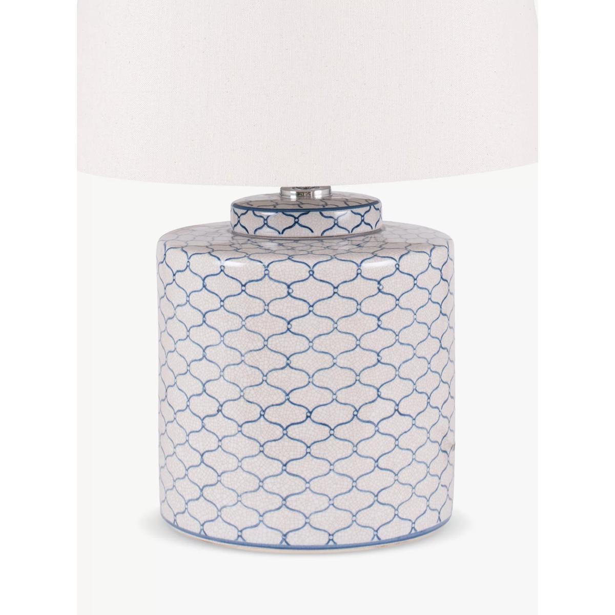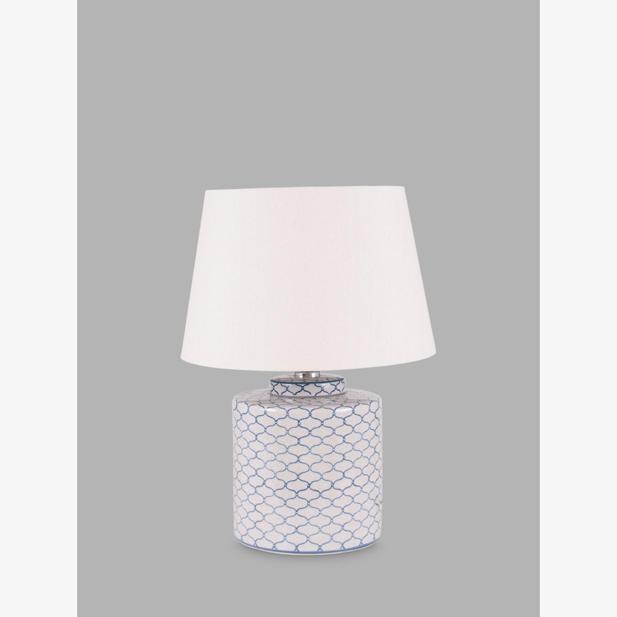 A tea caddy shaped ceramic pot with a geometric blue design, repeated against a light grey background. This lamp comes complete with a tapered cotton shade.