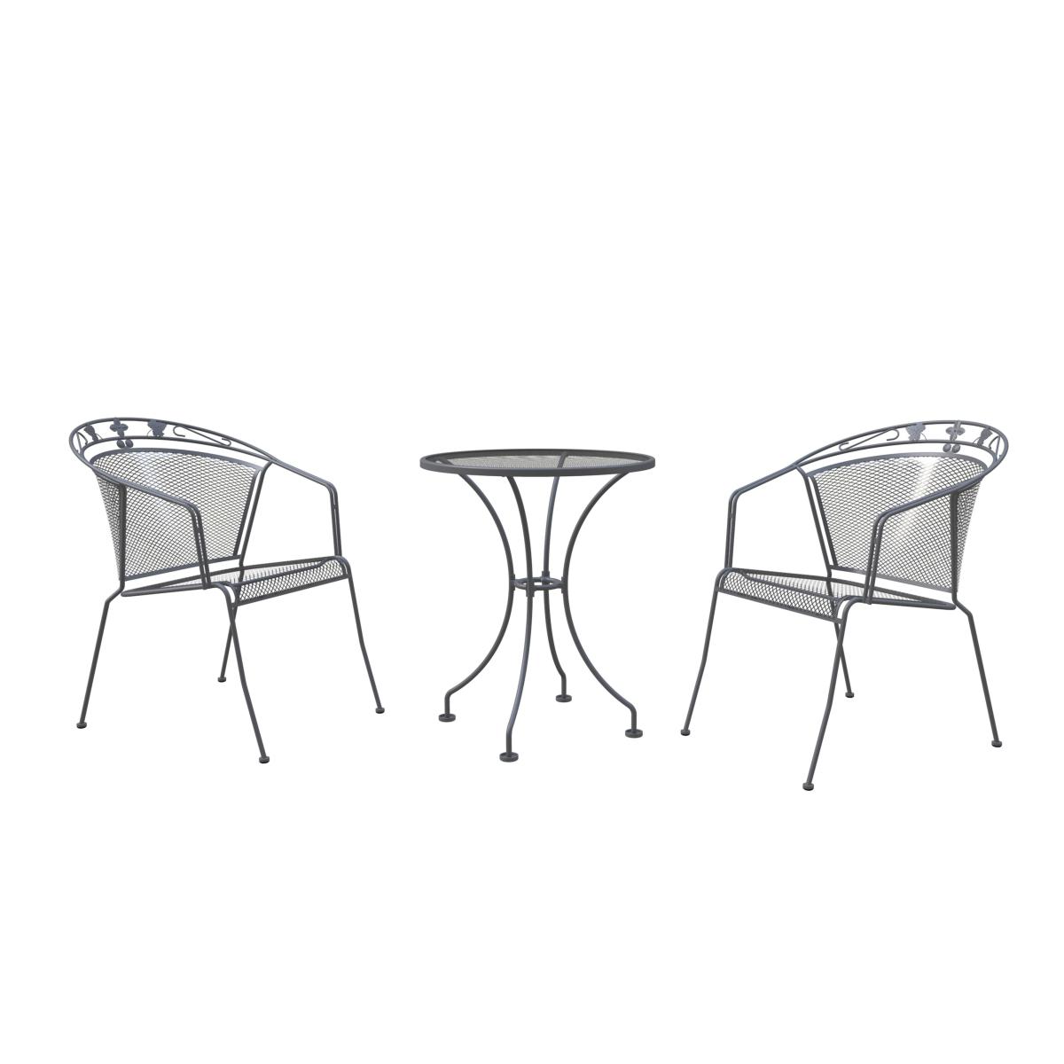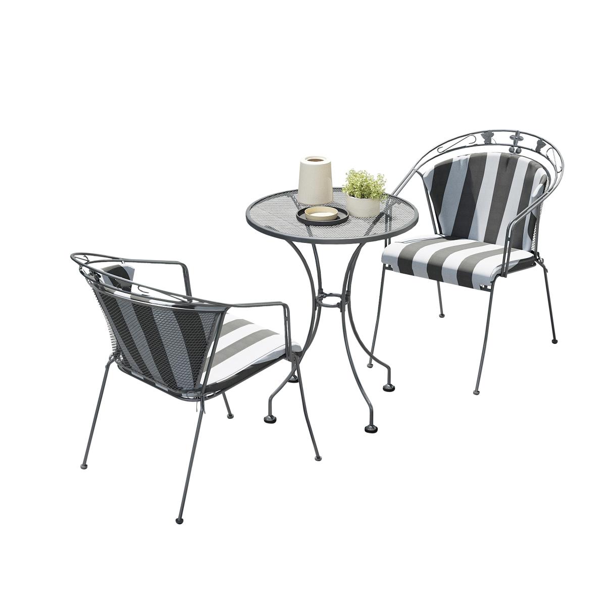 * 1 x Table and 2 x chairs * Coated metal frame * Weather proof This set includes 2 chairs and a bistro table, providing ample space for two to enjoy light bites or drinks in the sun. The modern curved backs and armrests offer long-lasting comfort, elevated with delicate ivy detailing. The chairs are stackable for easy storage in winter. Crafted from premium Steel, this bistro set is durable and weather-resistant, with an innovative Thermosint coating that protects up to 10 times longer than other powder coatings against corrosion. The Elegance Cushion, featuring a modern grey and white stripe design, adds an extra layer of comfort. For long-term maintenance, it's recommended to store the cushions indoors or cover them during inclement weather.