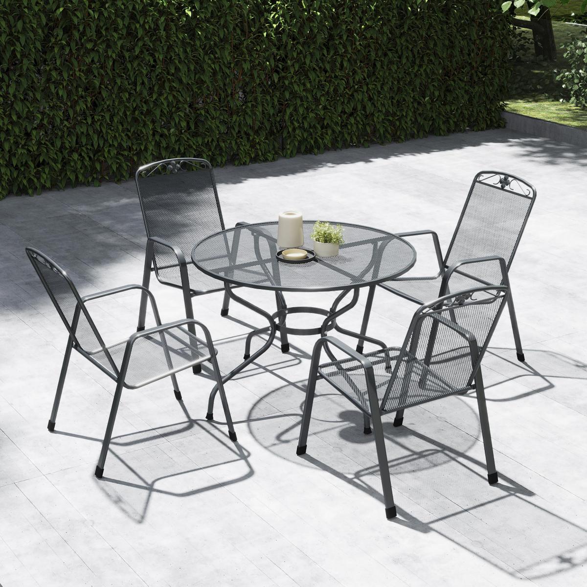 * 1 x Table and 4 x chairs * Coated metal frame * Weather proof This set includes a dining table and 4 chairs, with ivy detailing on the backs of the chairs to bring nature into your space. The curved backs and armrests ensure comfort during al fresco dining. The chairs are stackable for convenient storage, and the table includes a hole for a parasol. Made from premium Steel, this set is durable and weather-resistant. It features an innovative Thermosint coating, protecting it up to 10 times longer than standard powder coatings, ensuring comfort year-round.