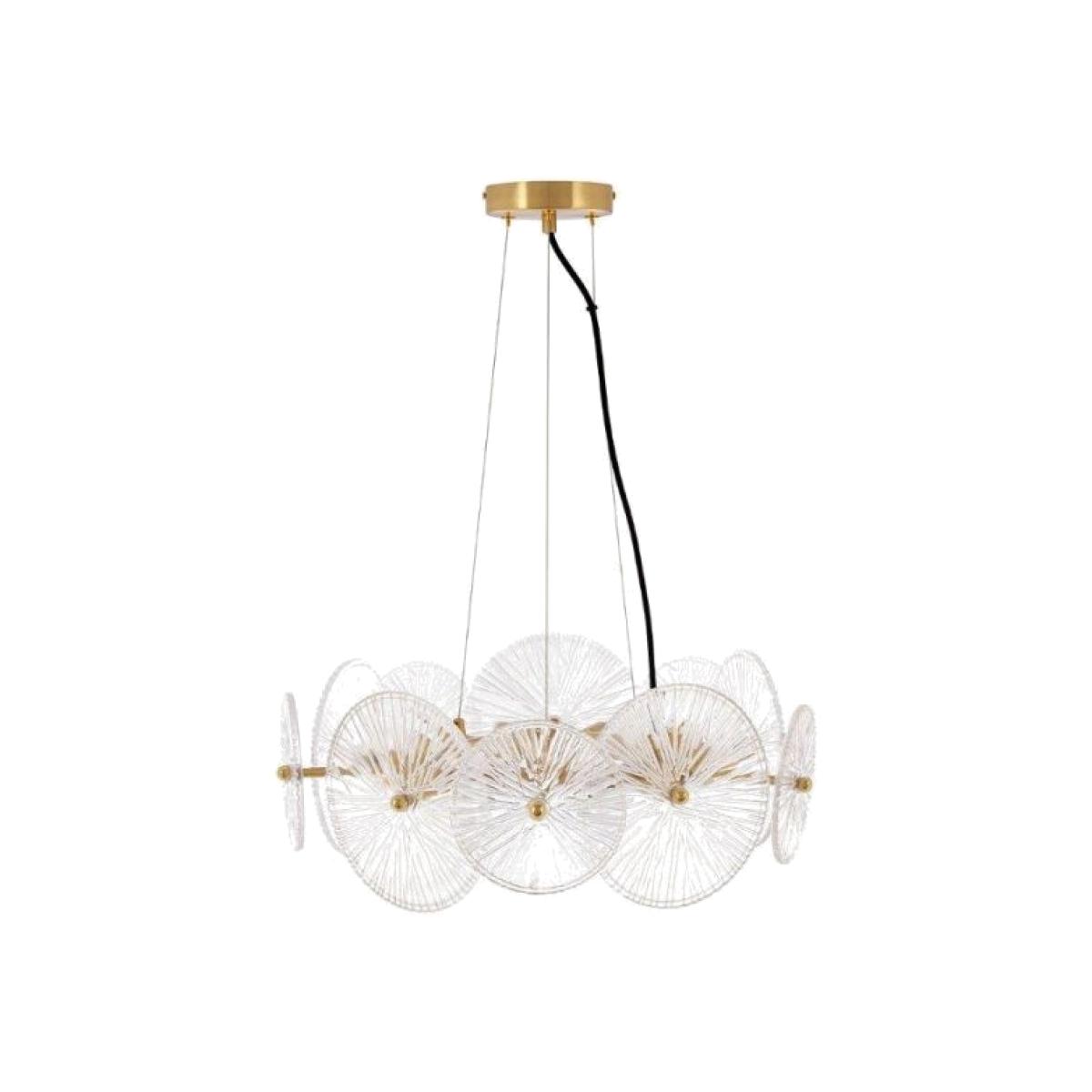 A remarkable electrified pendant with textured clear glass circles and gold metal detailings. The light shines through the glass disks creating a warm glow. An eye catching centre piece for any room. Also available in a semi-flush pendant. Bulb Required. Max Wattage: G(/3W LED Only.  Material: Glass  Dimensions W52xD52xH13. 0cm.