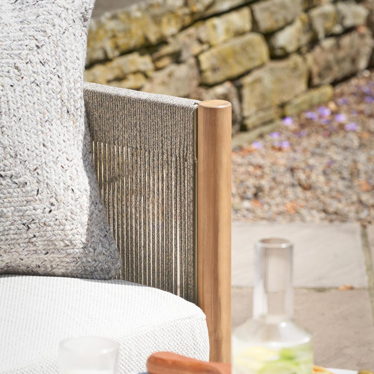 * 2 x Tables, 2 Armchairs and 1 x Sofa * Acacia wood frame * Rope weave accents * Season proof This modern set features a 2-seater sofa, two armchairs, and both large and small coffee tables, crafted from eco-friendly acacia wood with a light teak finish. The rope weave design offers a contemporary touch, while the Olefin fabric cushions are quick-drying, stain-resistant, and perfect for outdoor use. For extra longevity, protect your set with an Aerocover, and enjoy a 3-Year Structural Guarantee.