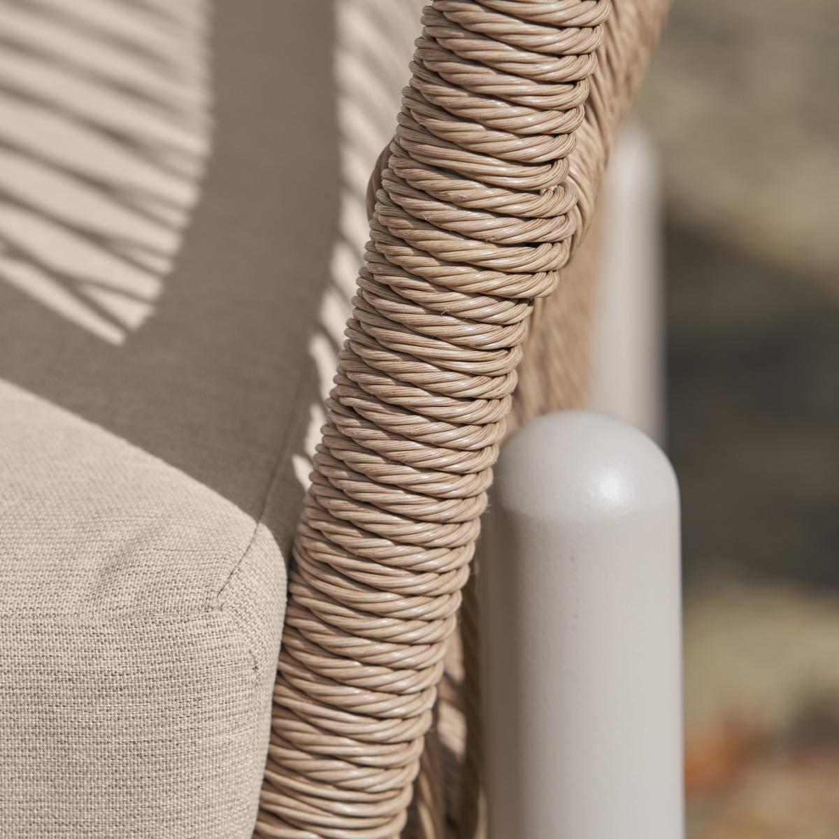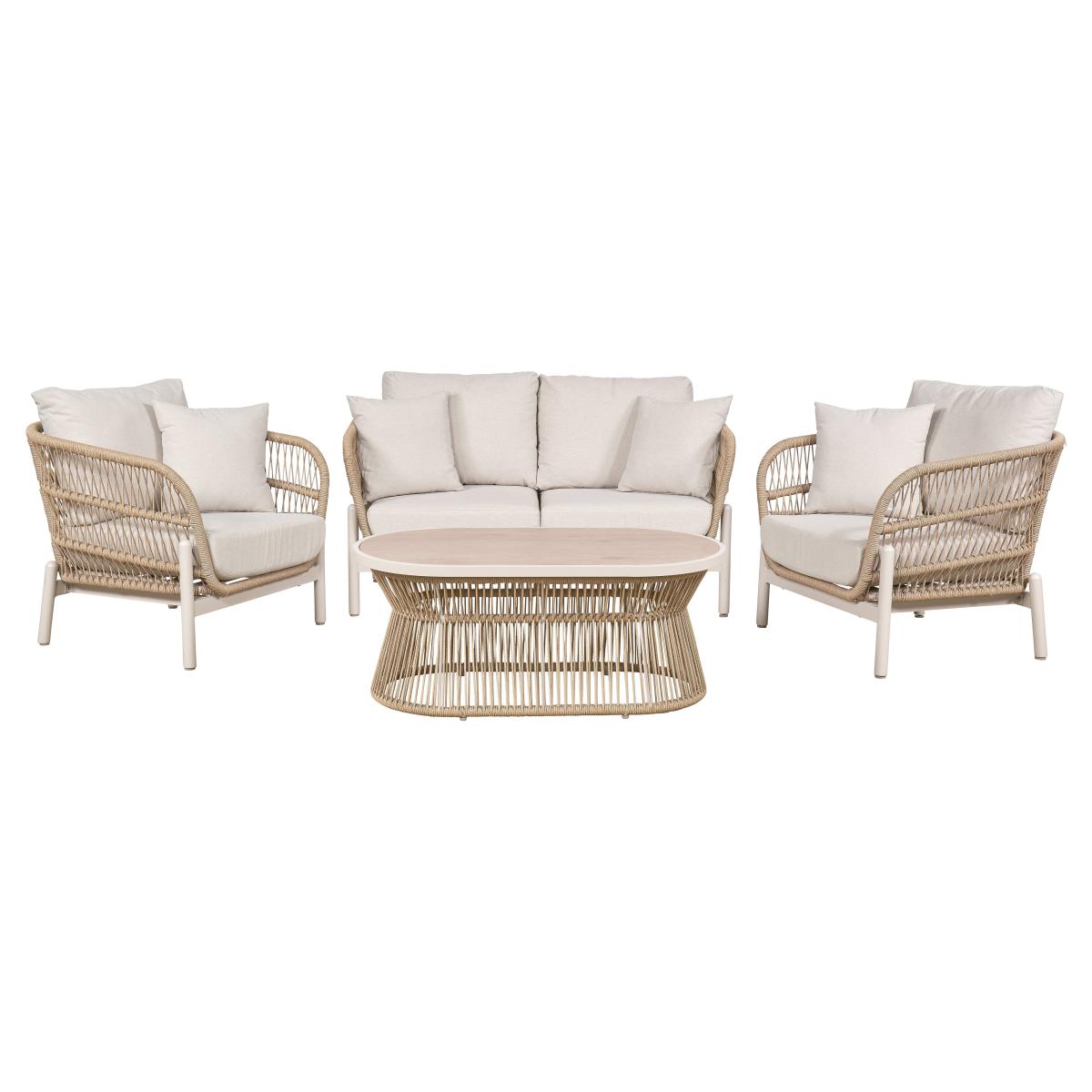* 1 x sofa, 2 x armchairs and 1 x coffee table * Powder coated aluminum frame * Woven core * Plush seat cushions * Season proof This set includes a 2-Seater Sofa, 2 Armchairs, and a Coffee Table, all crafted from durable powder-coated aluminium in an elegant Latte finish. The frame is enhanced by a Natural Synthetic Core Weave, offering a modern yet organic feel. Plush seat cushions and scatter pillows in Light Putty Olefin fabric provide comfort and durability, with superior resistance to stains, fading, and quick-drying properties. The glass-topped coffee table adds sophistication with an Ash wood-effect finish. Use an Aerocover to maintain its pristine look. The set comes with a 3-Year Structural Guarantee.