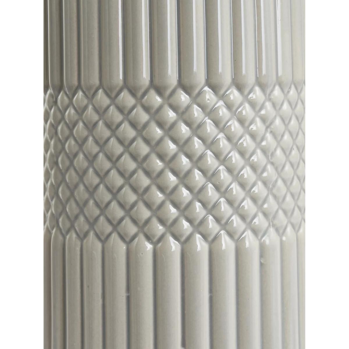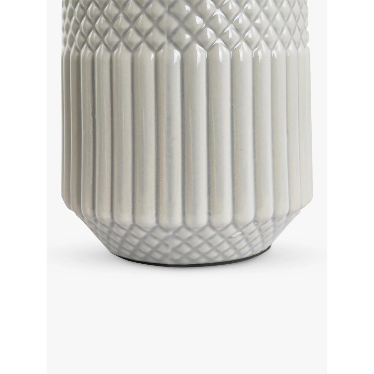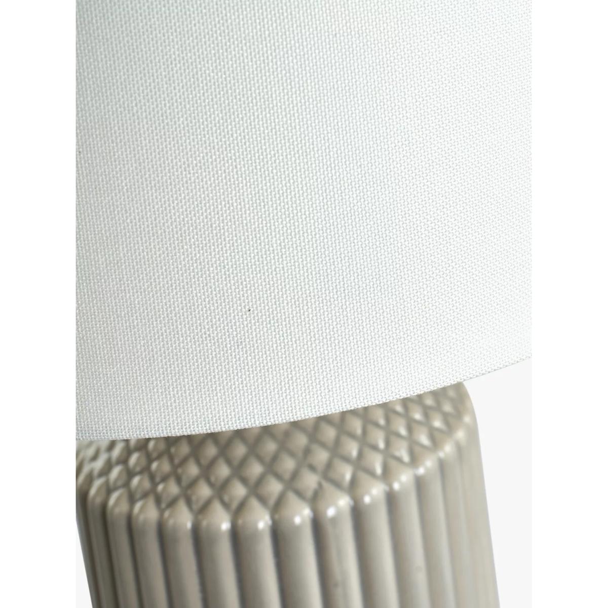 This beautiful tall, textured ceramic table lamp is finished in a simple glaze. Complete with a crisp white shade for a clean neutral look.