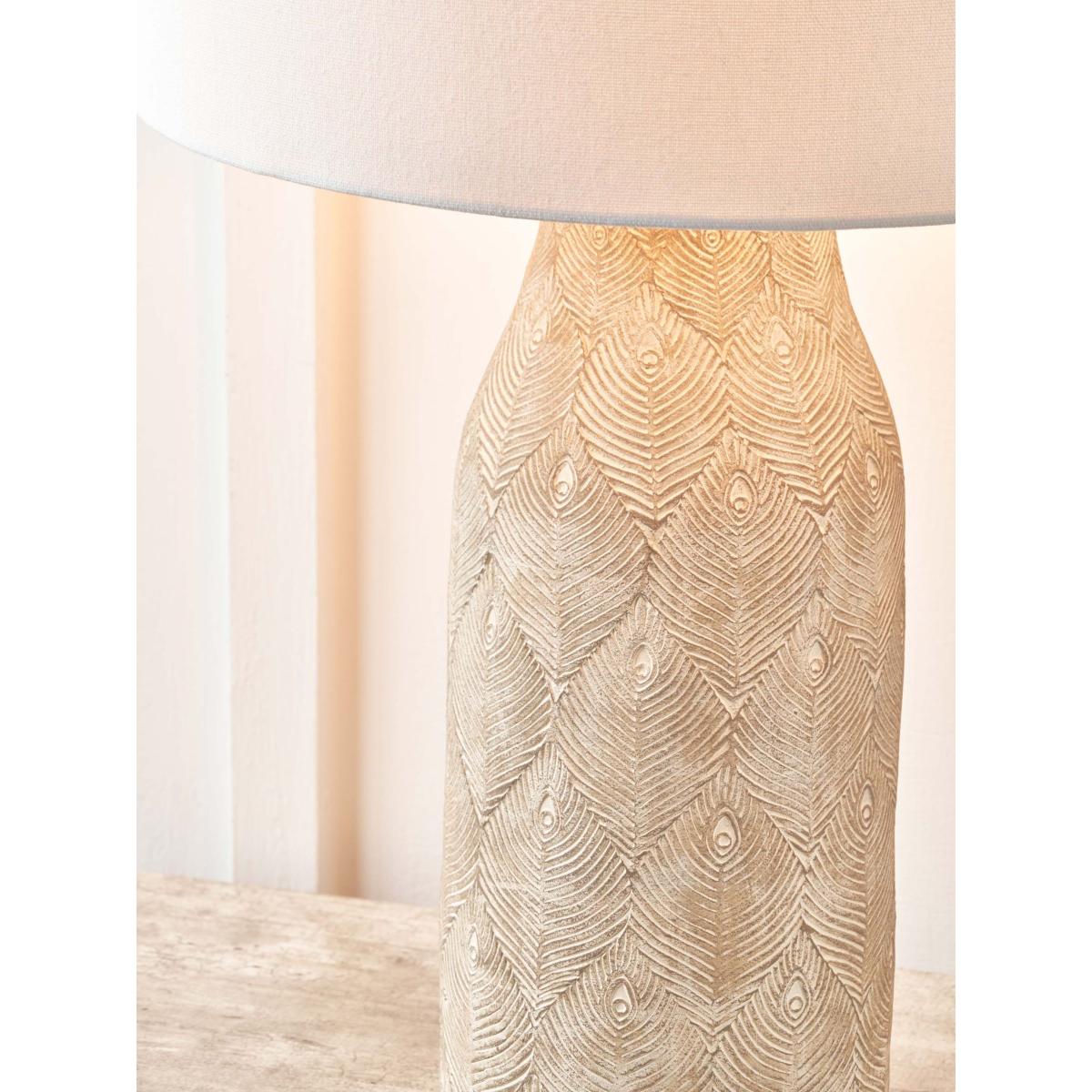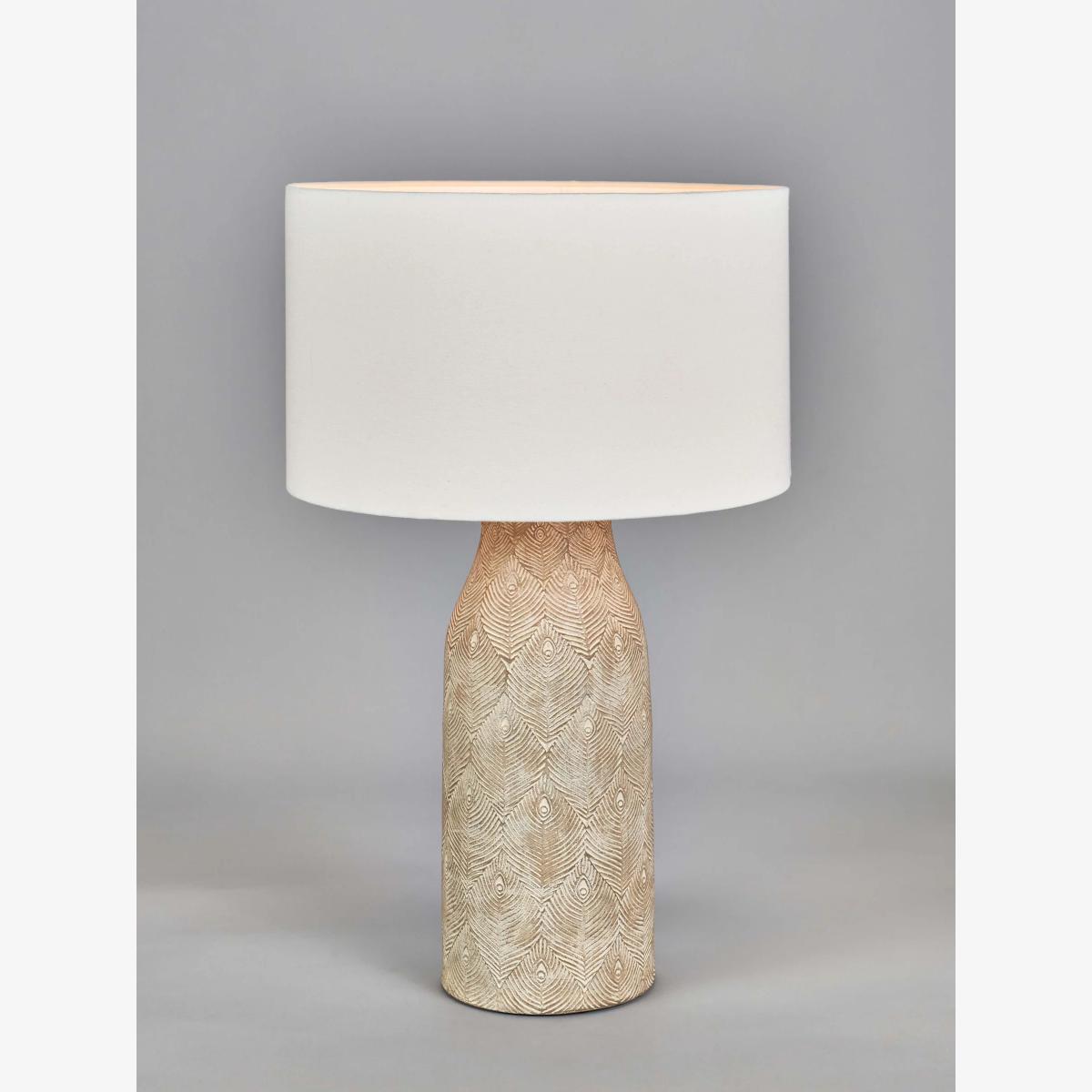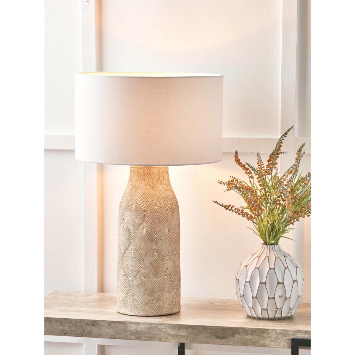 Light up your home with the stylish Palawan table lamp. This stoneware lamp will add contemporary flair to any space. The eye catching engraved design creates a unique look. Topped with a cylinder lampshade that allows light to filter through.