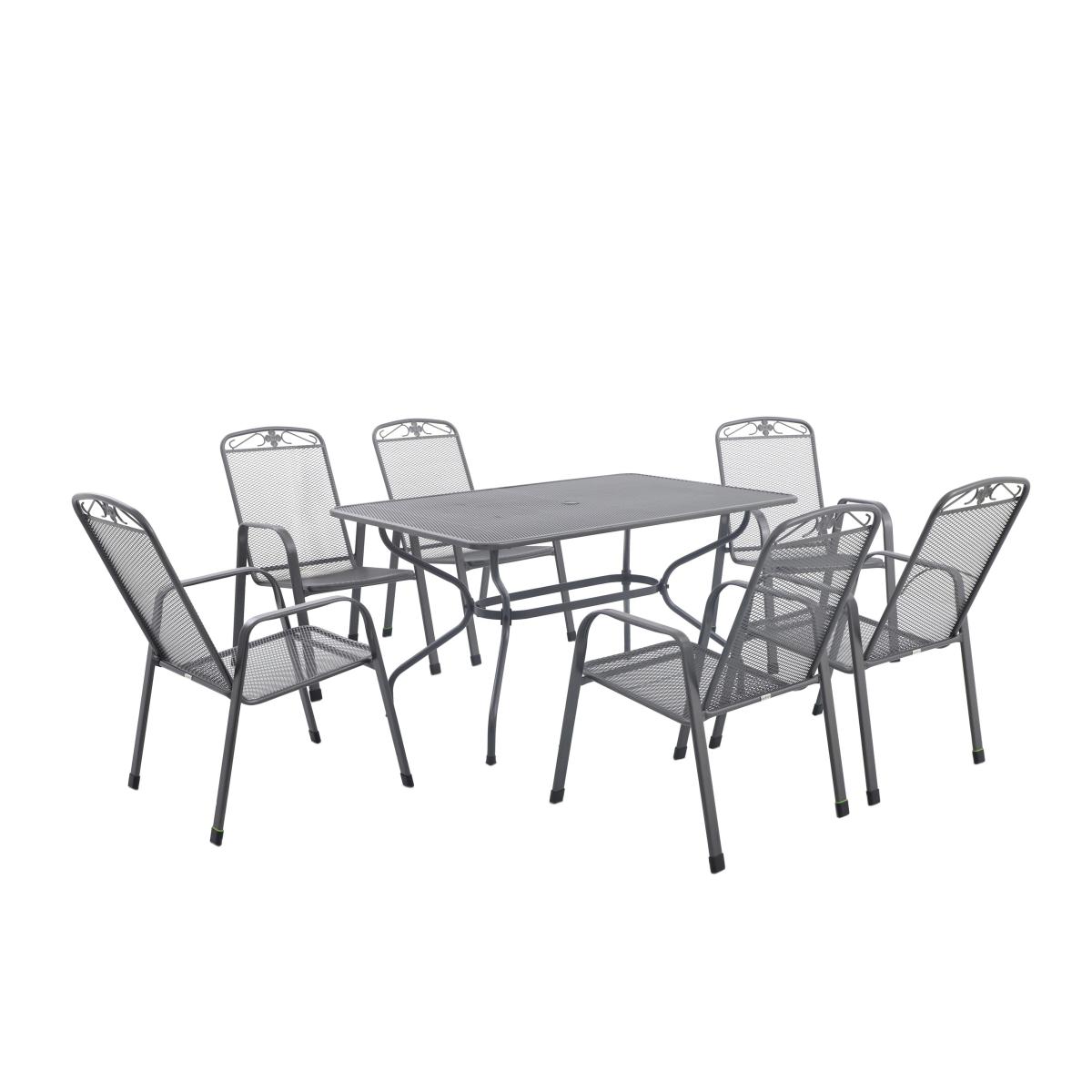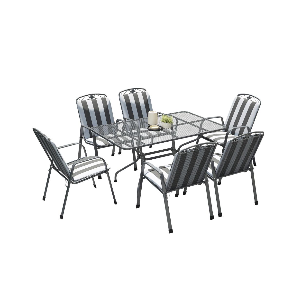 * Premium-metal frame * Floral detailing on chairs * Weather proof Create a stylish outdoor dining area with the Savoy Rectangular 6 Seater Dining Set. This set includes six chairs with a chic floral design and a dining table with a parasol hole. Constructed from durable steel with a Dark Grey finish, the set is designed to withstand the elements. The included cushions, in a modern grey and white stripe pattern, add extra comfort.