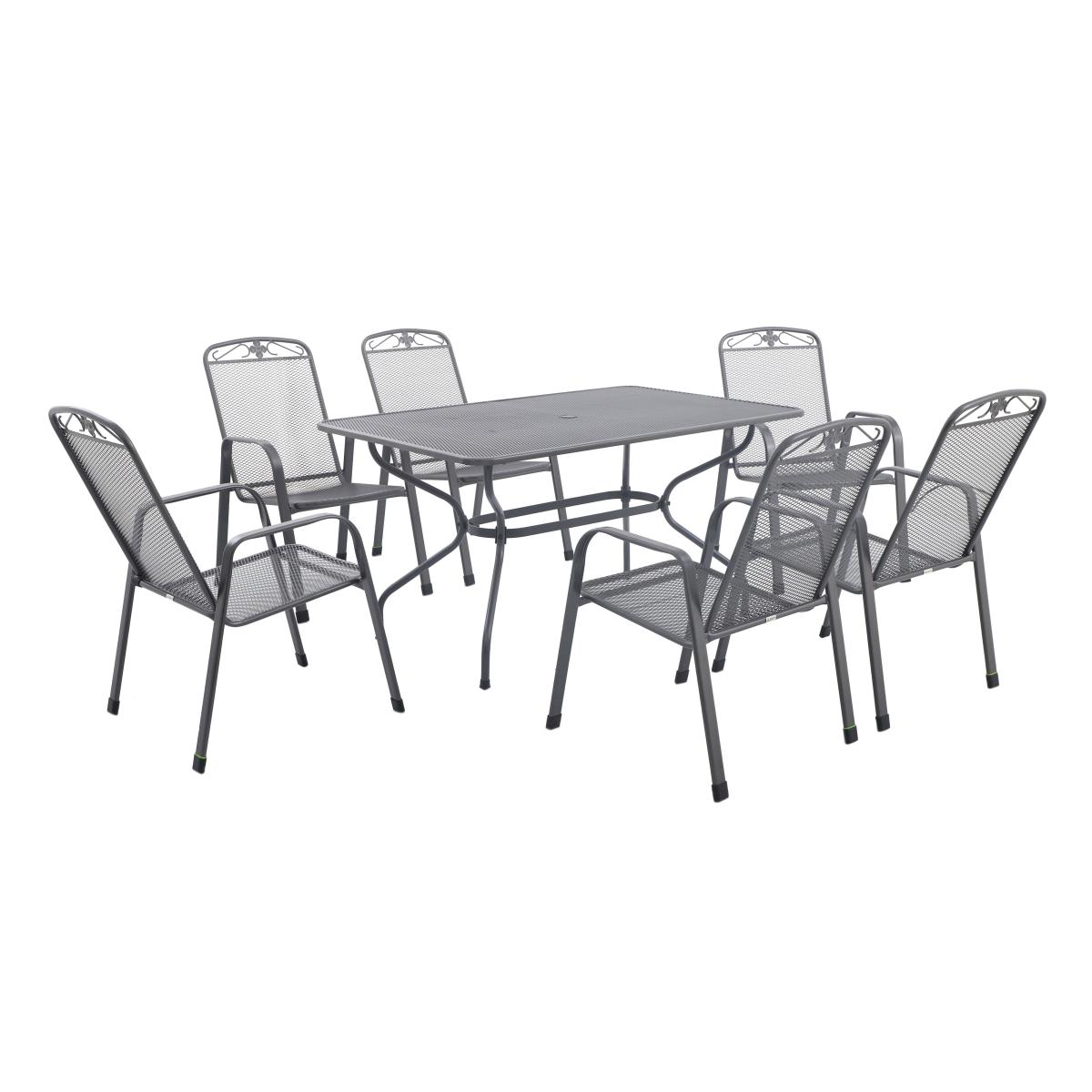 * 1 x table and 6 x chairs * Premium-metal frame * Floral detailing on chairs * Weather proof Elevate your garden with the Savoy 6 Seater Rectangular Dining Set. Featuring six dining chairs and a rectangular table, this set combines farmhouse charm with modern functionality. The floral design on the chair backs adds elegance, while the table has a hole for parasol placement. Made from premium steel with a Dark Grey finish, this set is durable and weather-resistant.