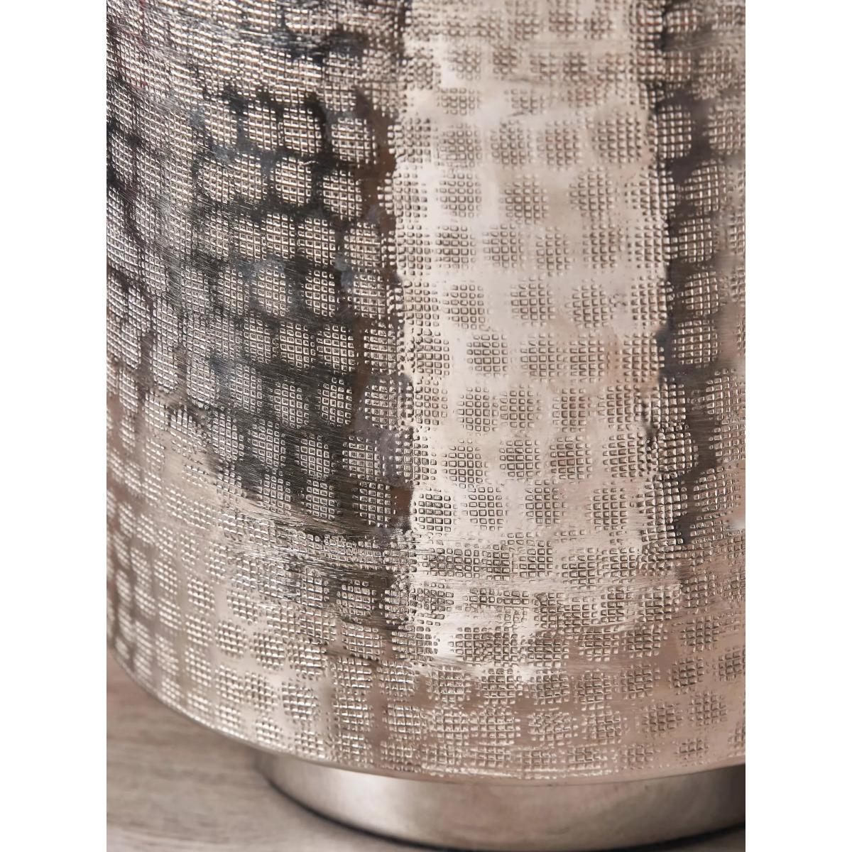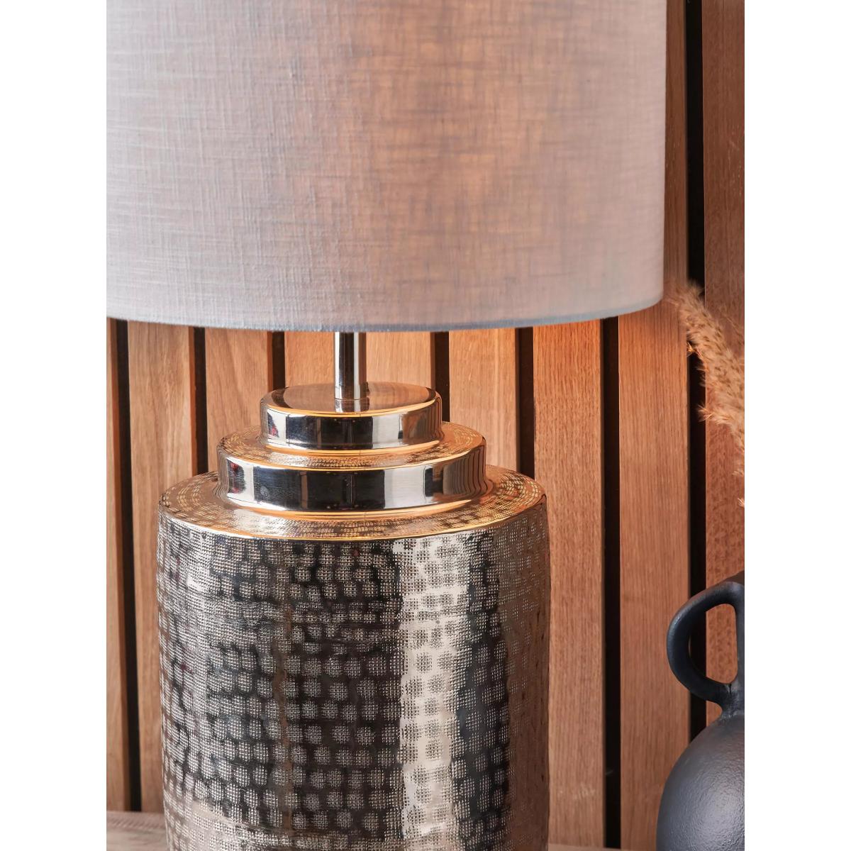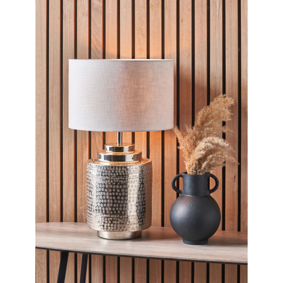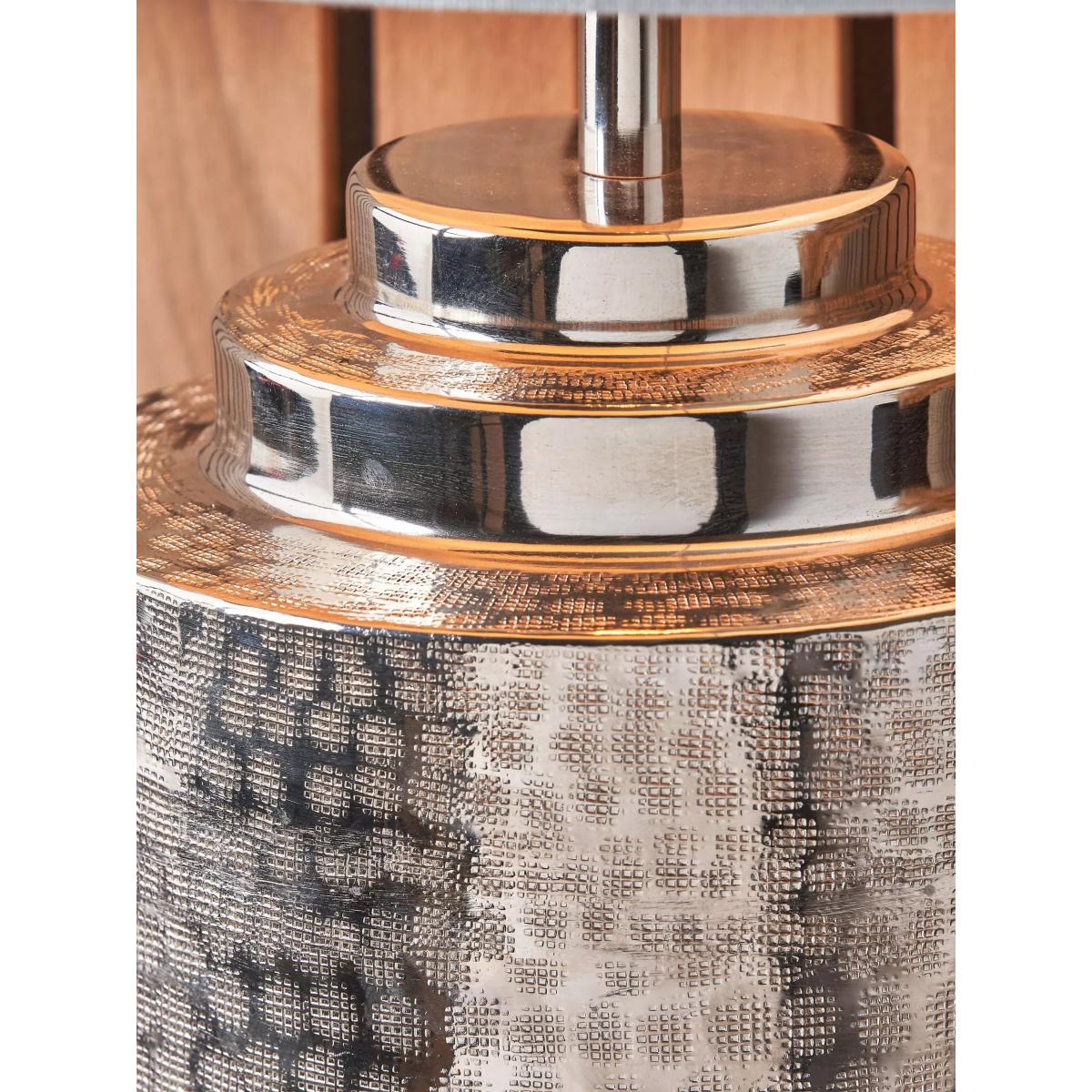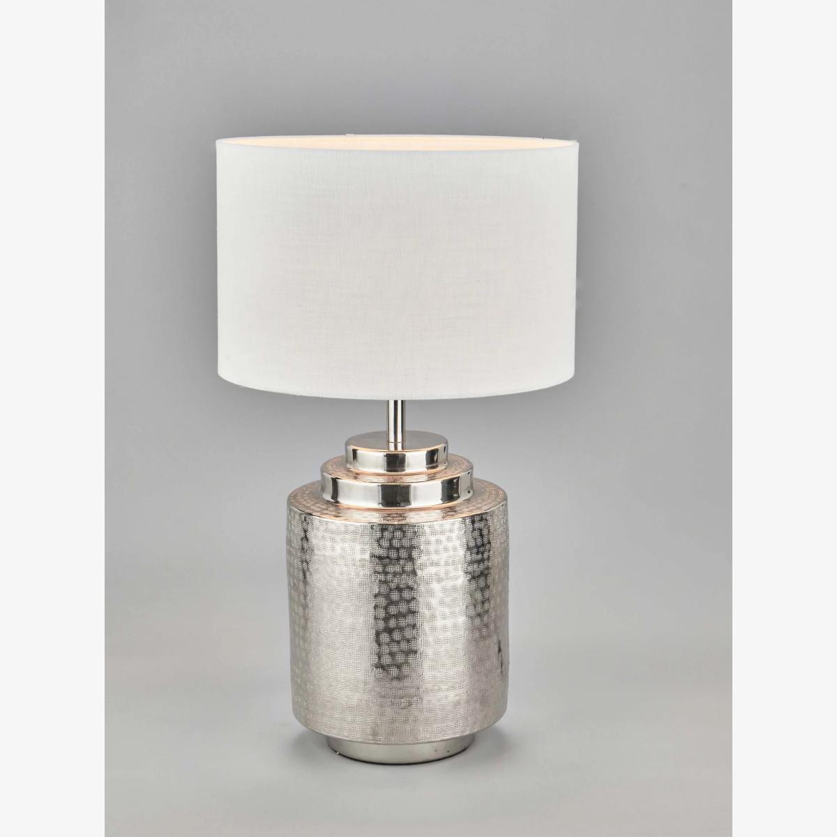 This stylish shiny metal table lamp is made in India using the long-standing technique of hand-hammering. Topped with a lined, open weave lampshade that allows light to filter through.