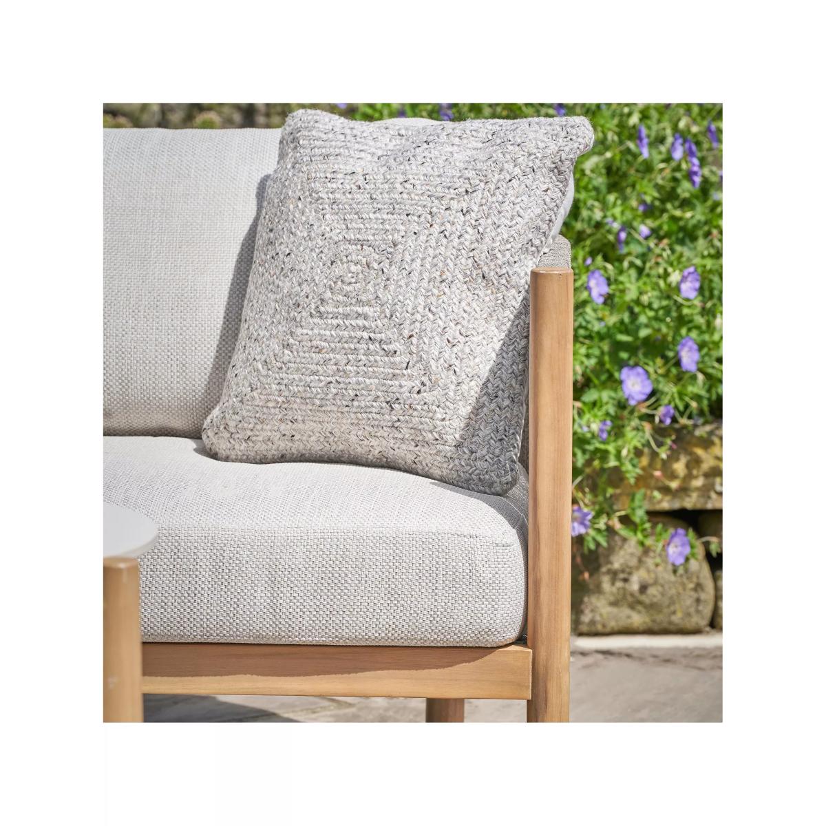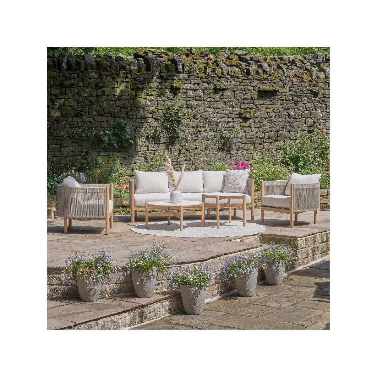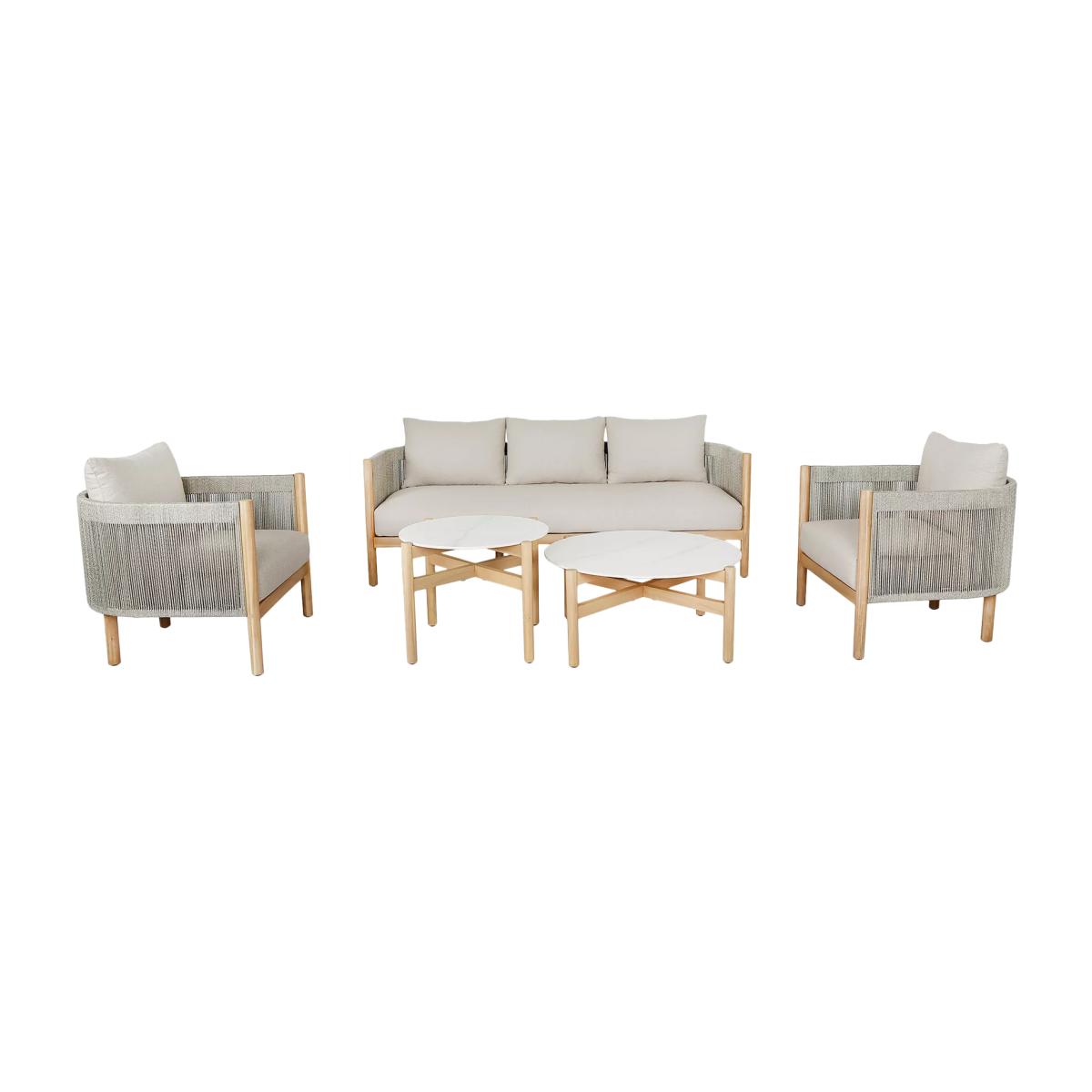 The Marche, made in Vietnam, gives your garden an update with an on-trend curved seat back design and synthetic rope weave. The four-seater garden lounge set features acacia wood frames and a large round coffee table and a small round coffee table with polystone tops which are durable and weather-resistant. Season-proof seat and backrest cushions provide comfort and are made of Olefin fabric that's highly resistant to staining and fading, and dries quickly. Key features: Large round coffee table and small round coffee table with polystone tops Two-seater garden sofa and two garden lounge chairs with a polyrope weave Naturally weather-resistant acacia wood frames Shower-resistant seat and backrest cushions included