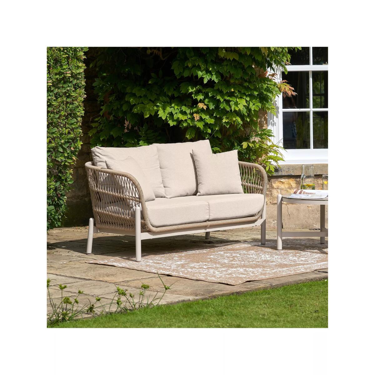 The Martic is a contemporary design to give your garden a modern update with its synthetic rope-like weave. This two-seater garden sofa has a lightweight yet robust powder-coated aluminium frame in a latte colour. Season-proof seat and backrest cushions provide comfort and are made of a latte Olefin fabric that's highly resistant to staining and fading, and dries quickly. Key features: Two-seater garden sofa with a polyrope weave Powder-coated aluminium frame in a Latte colour Shower-resistant seat and backrest cushions included
