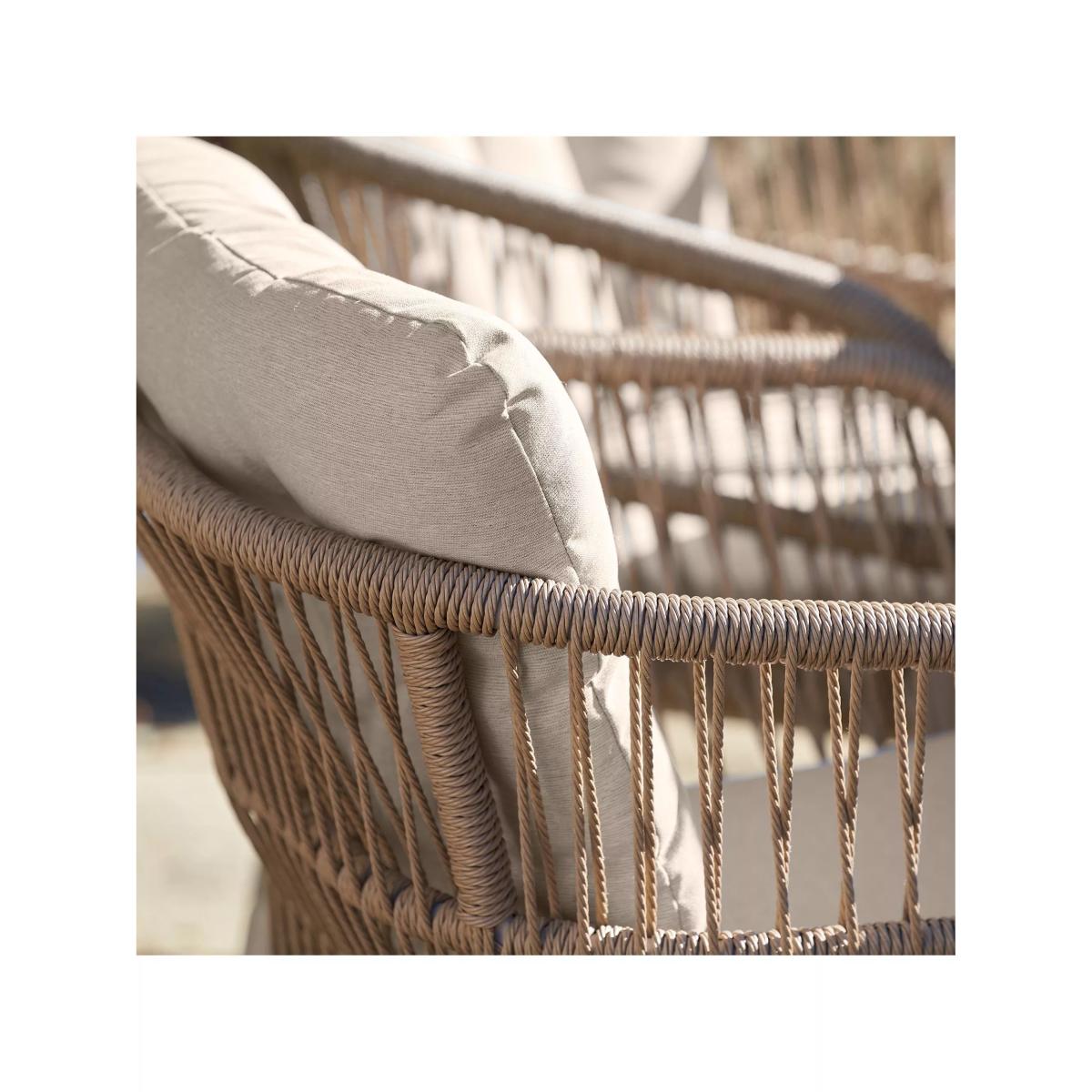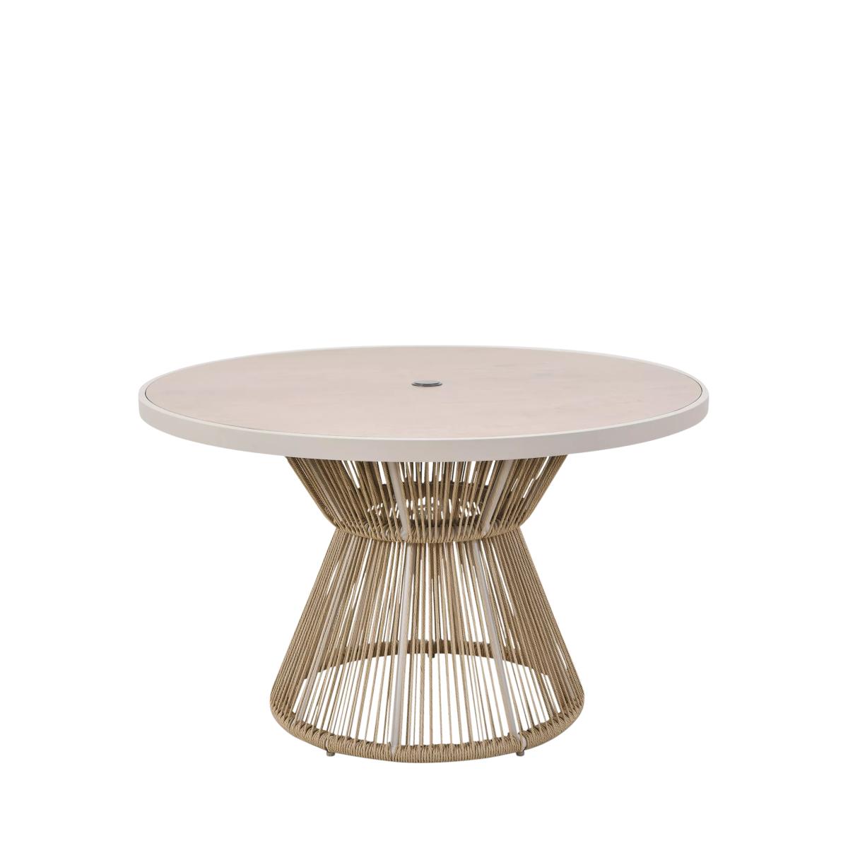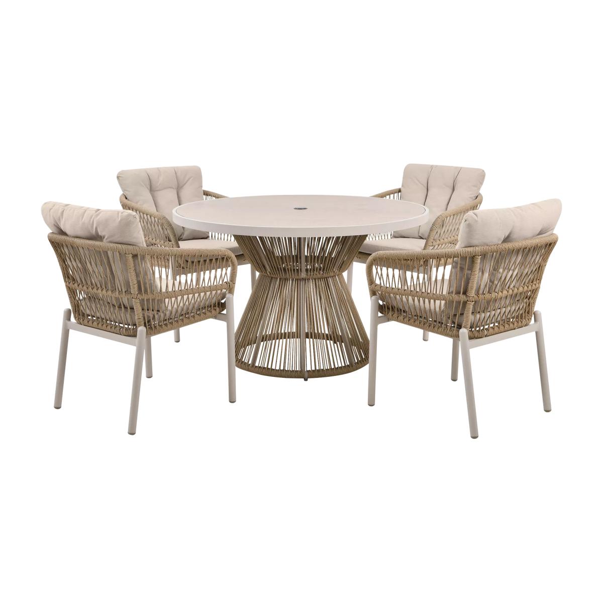 The Martic is a contemporary design to give your garden a modern update with its synthetic rope-like weave. The set includes a round garden dining table and four casual dining chairs, all with lightweight yet robust powder-coated aluminium frames in a latte colour. The table has an Ash-coloured wood-effect glass top and parasol hole. We recommend using season-proof seat cushions for added comfort. Cushions are not included with this set. Key features: Round garden dining table with a wood-effect glass top and parasol hole Four garden dining chairs with a polyrope weave Powder-coated aluminium frames in a Latte colour Shower-resistant seat cushions are not included