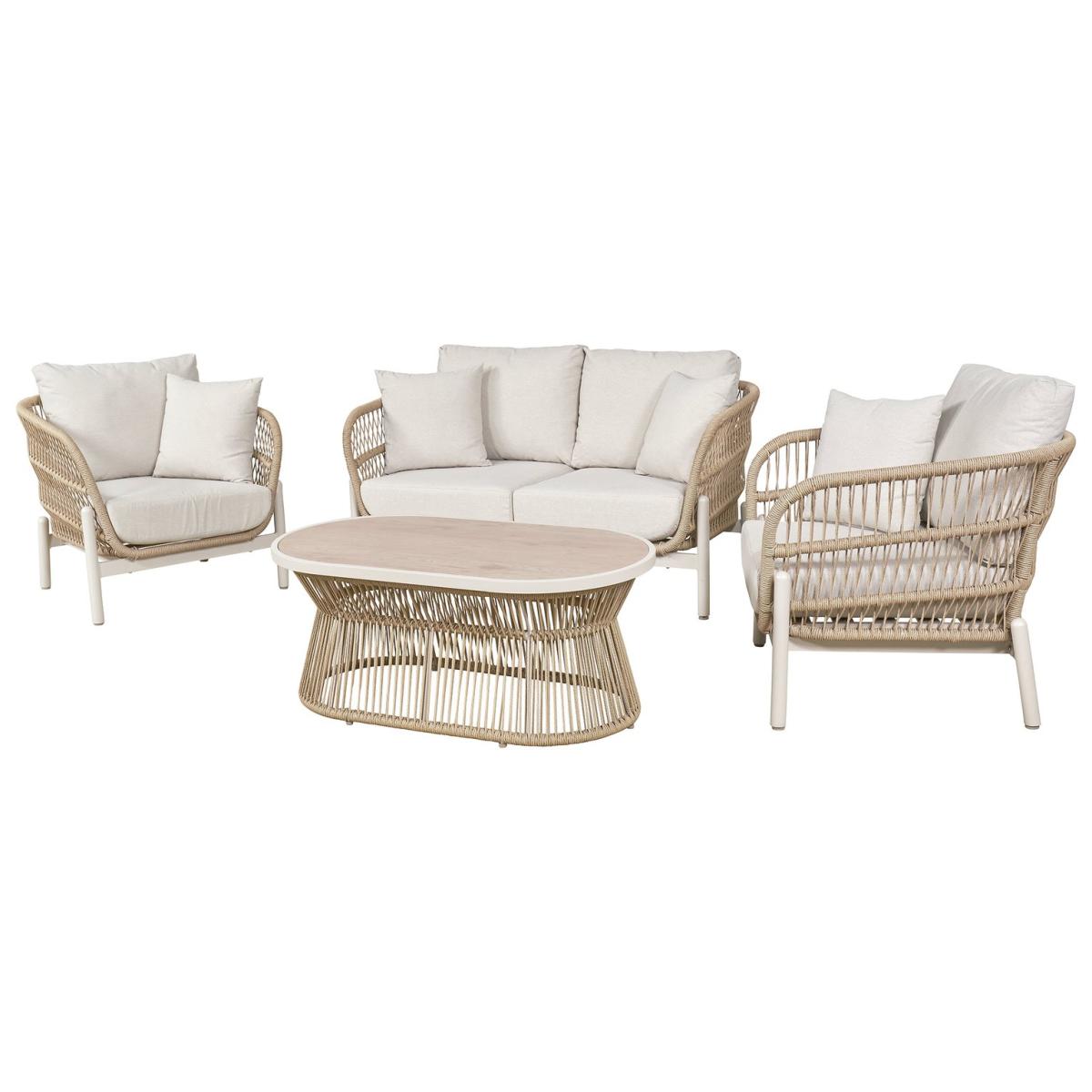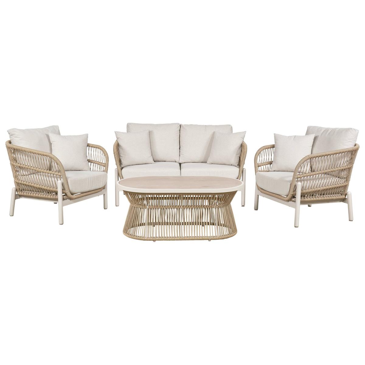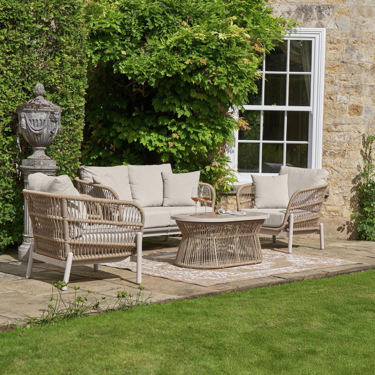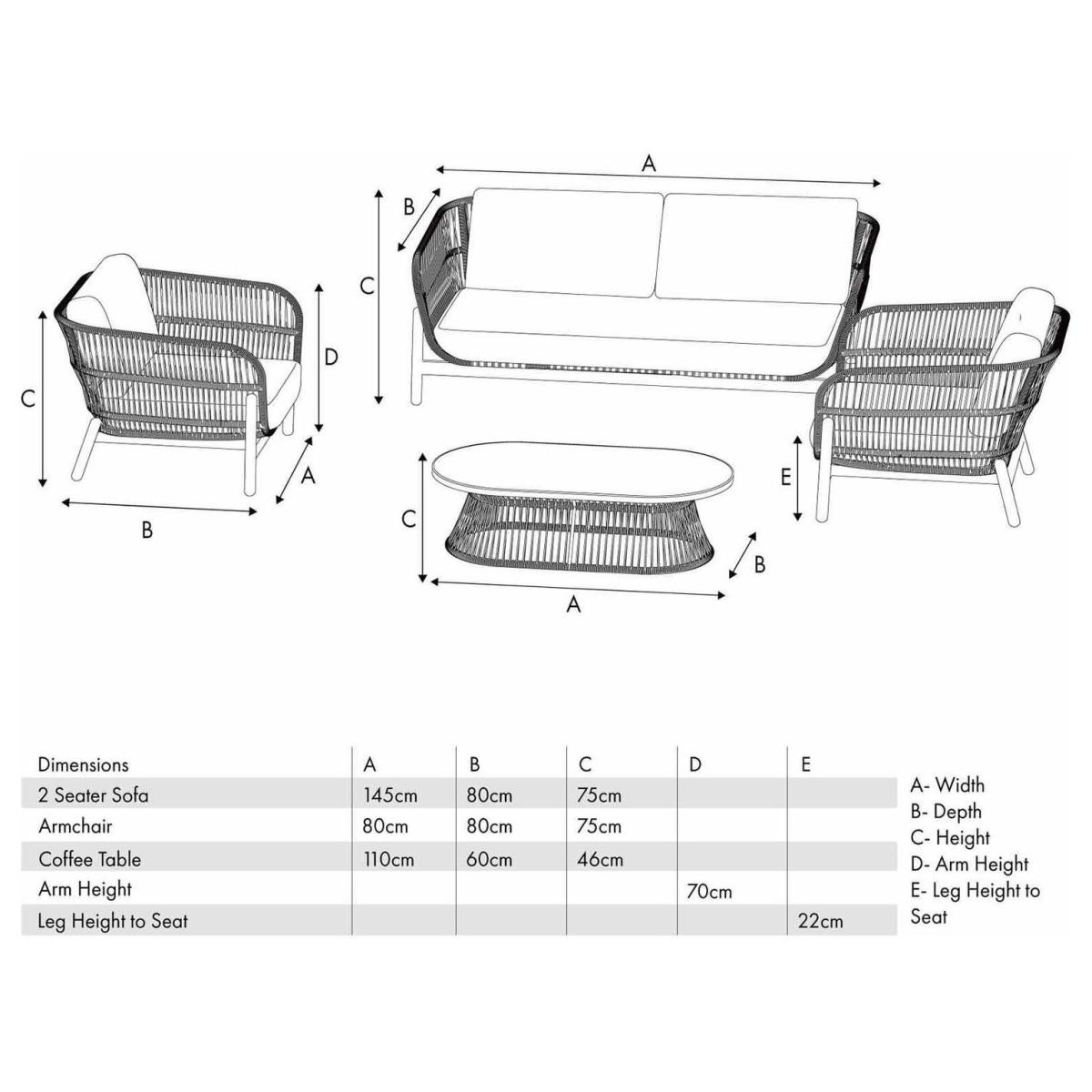 The Martic offers a contemporary design, perfect for enhancing the outdoors in style. Modern shape with a mid height back design for the ultimate lounging experience. This statement piece comprises of a 2 seater sofa, and two armchairs, along with a oval coffee table, with glass table top, a perfect addition to any garden or patio space. Part of the Martic collection. Parasol base not included. Parasol not included. Includes 12 cushions. General features: Set seats 4 people. Set made from rattan effect and aluminium. Cover or store inside in winter months to prolong life of the products. Total weight 108kg. Garden table features: Glass table top. Table size: H46, W110, L60cm. Chair features: Chair seat and back made from rattan effect. Size H75, W80, D80cm. Seat height 75cm. Seating area size W 80, D80cm. 110kg maximum user weight per chair. Sofa features: Sofa size H75, W145. D80cm. 220kg maximum user weight per sofa. Cushion features: Olefin and Putty cushions. Removable covers. Washable covers. Stain resistant. Remove cushions when not in use and store inside. Packaging information: Package 1 size H75, W165, D93cm. Package 1 weight 46kg. Package 2 size H50, W113, D63cm. Package 2 weight 16kg. General Information: Self-assembly - 2 people required. Manufacturer's 3 year guarantee.