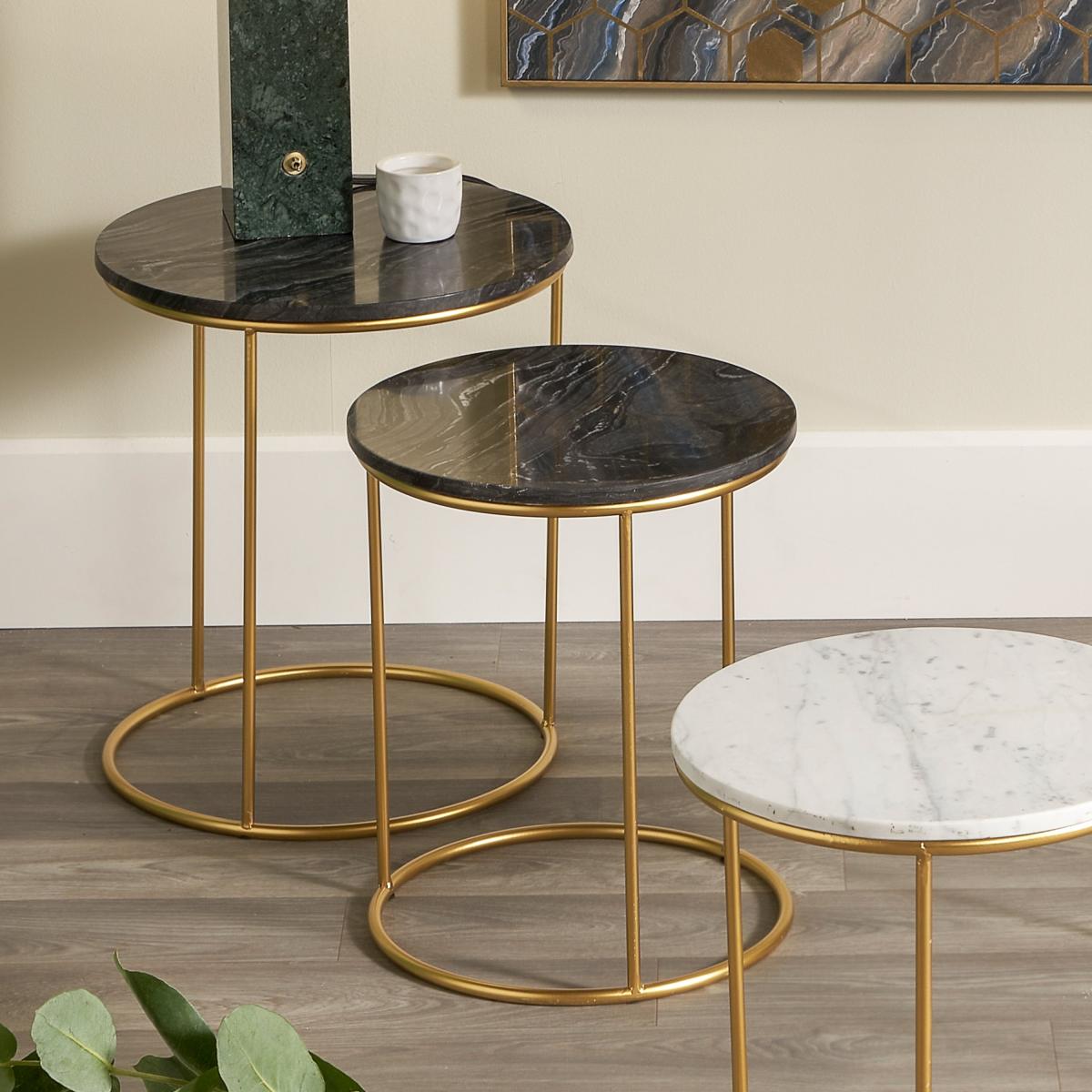 The tabletop is made of marble which gives it a luxurious look, and the gold iron frame adds a touch of glamour. There are 3 colourways that these nests of tables come in, so find the best one to suit your home interior! The heavy and sturdy construction ensures the tables are durable and able to withstand daily use. Additionally, the tables are versatile pieces of furniture as they can be easily stored away when not in use, saving space in small living areas.