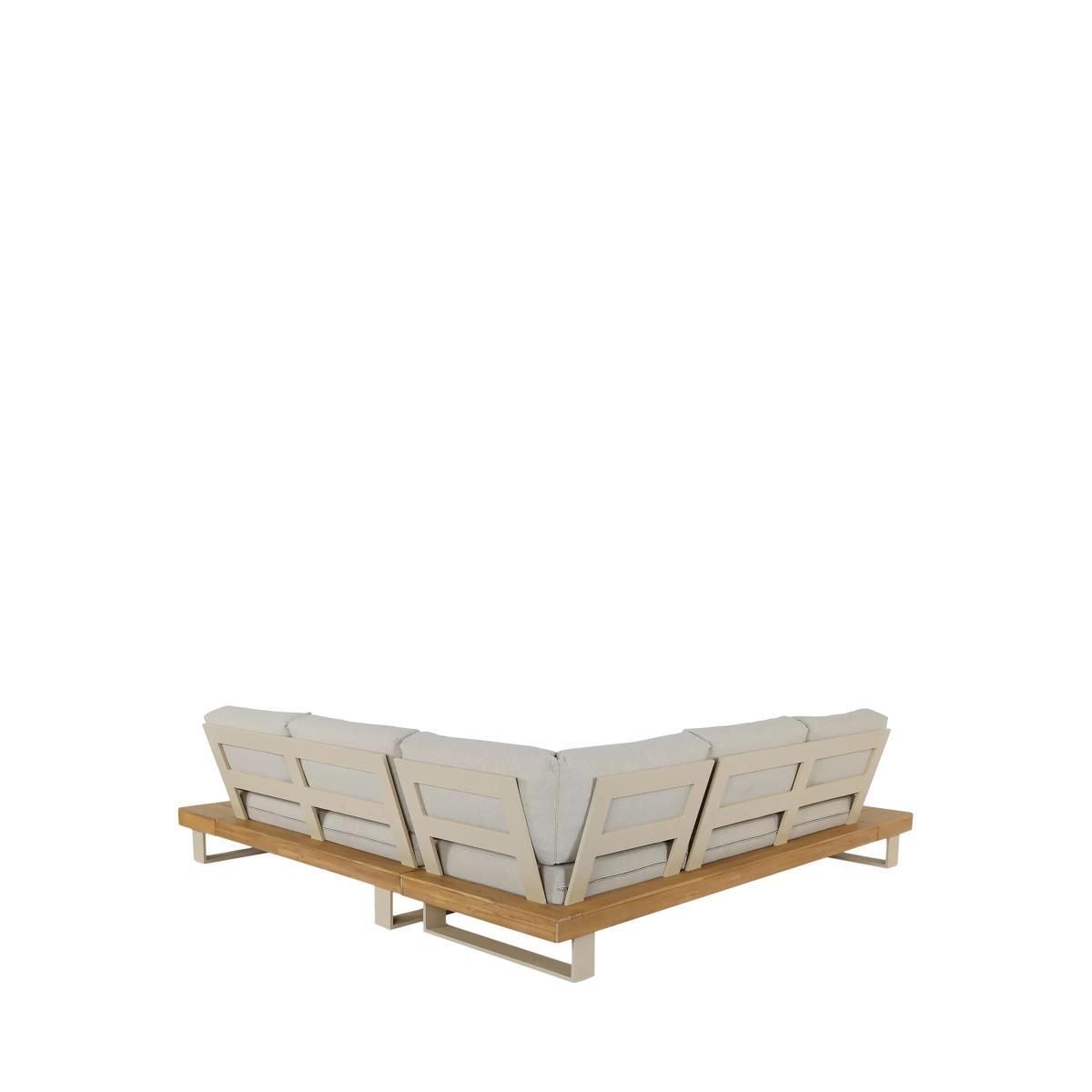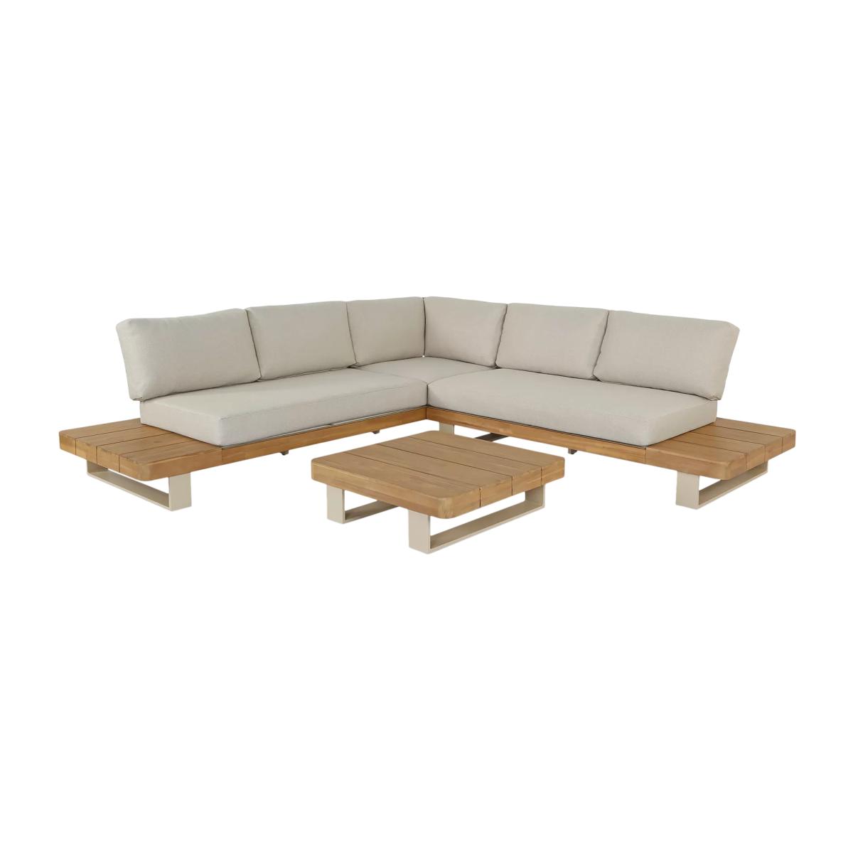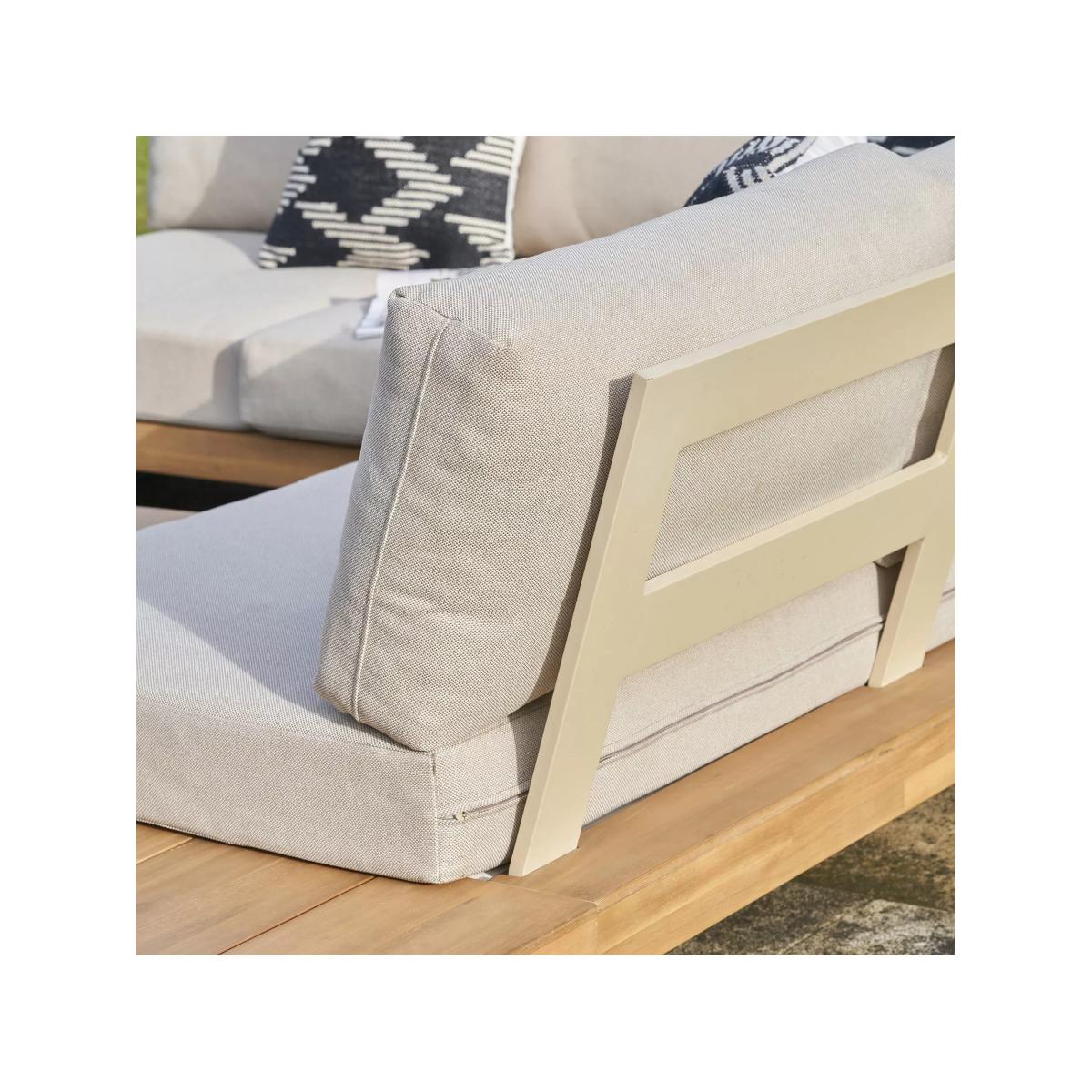 The Osaka garden lounging range, crafted in Vietnam, is made with powder-coated aluminium latte frames, light teak-effect acacia wood and natural fabric. The acacia wood is tough, long-lasting and naturally weather-resistant, making it an excellent choice for outdoor furniture. Seat cushions are made to the highest standard and are fire-retardant and weather-resistant. Key features: Square garden coffee table made of light teak-effect acacia wood 6-seater corner garden sofa set with light teak-effect acacia wood side tables Powder-coated aluminium frames in Latte Weather-resistant seat and backrest cushions