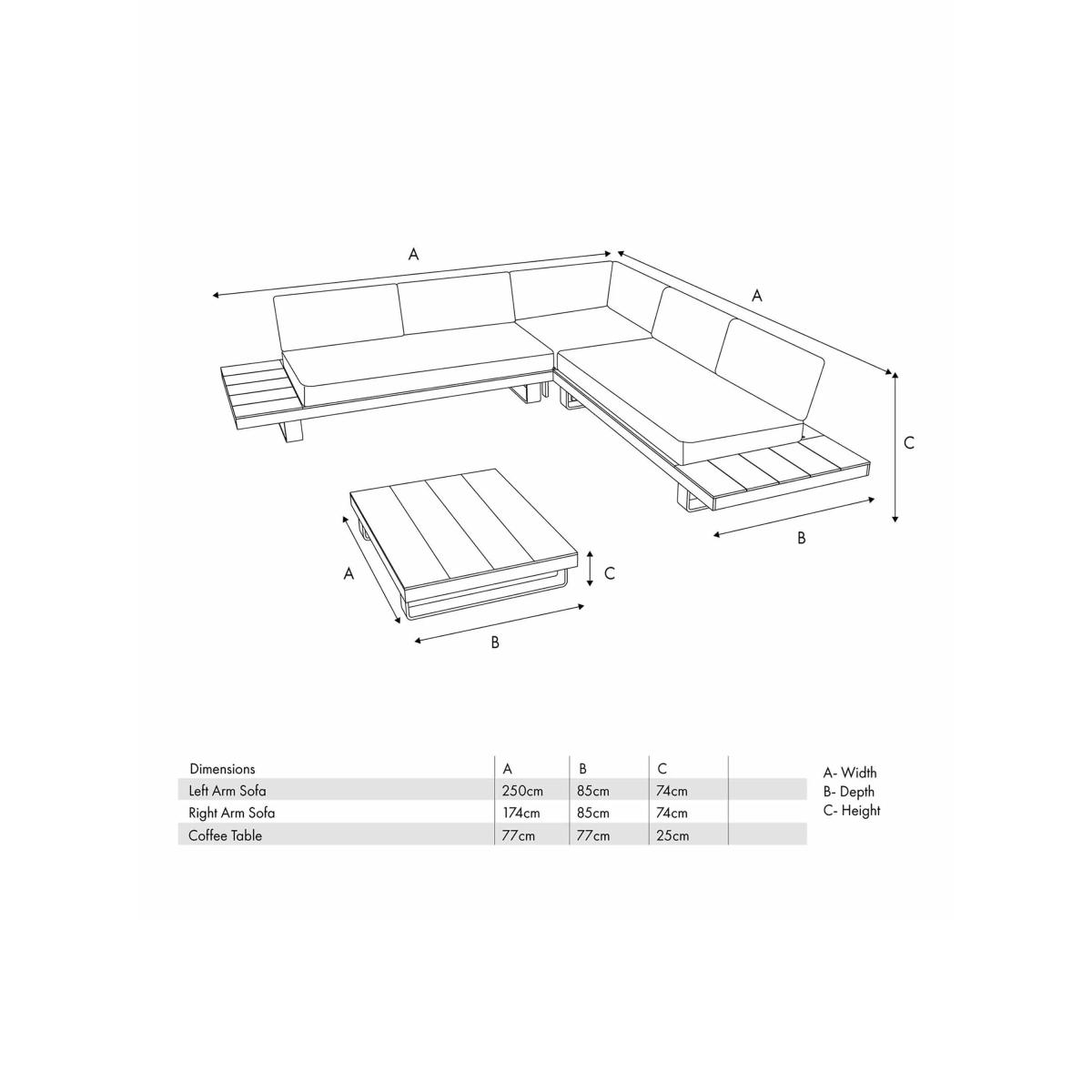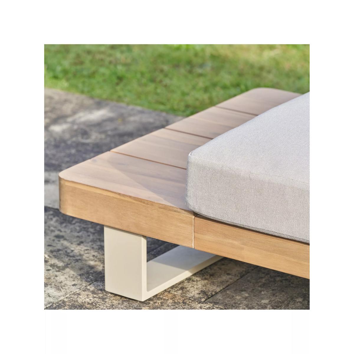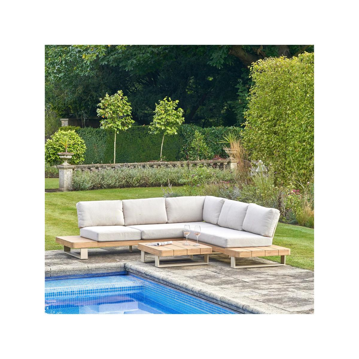 The Osaka garden lounging range, crafted in Vietnam, is made with powder-coated aluminium latte frames, light teak-effect acacia wood and natural fabric. The acacia wood is tough, long-lasting and naturally weather-resistant, making it an excellent choice for outdoor furniture. Seat cushions are made to the highest standard and are fire-retardant and weather-resistant. Key features: Square garden coffee table made of light teak-effect acacia wood 6-seater corner garden sofa set with light teak-effect acacia wood side tables Powder-coated aluminium frames in Latte Weather-resistant seat and backrest cushions