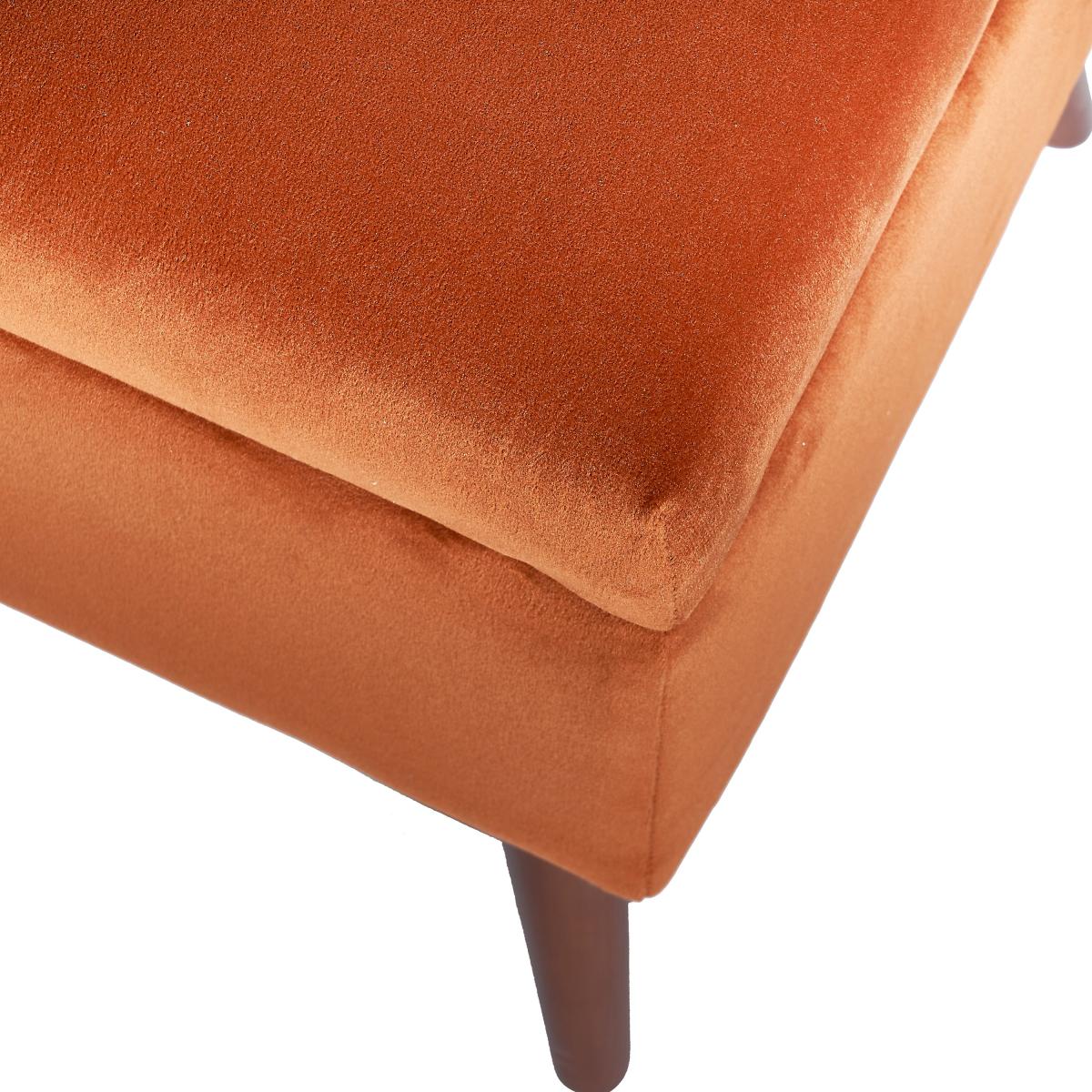 I love this piece for its mid-century modern vibe combined with the rich tobacco velvet, which adds warmth and texture to any space. It works particularly well in living rooms, dressing areas, or even at the foot of a bed, offering both style and practicality. To style it effectively, consider pairing with neutral or earthy tones to let the velvet pop, and incorporate layered textiles like throws or cushions for added comfort. Its compact size makes it versatile for smaller rooms or as an accent piece in more generous interiors, providing a welcoming spot to sit or just add visual interest.
