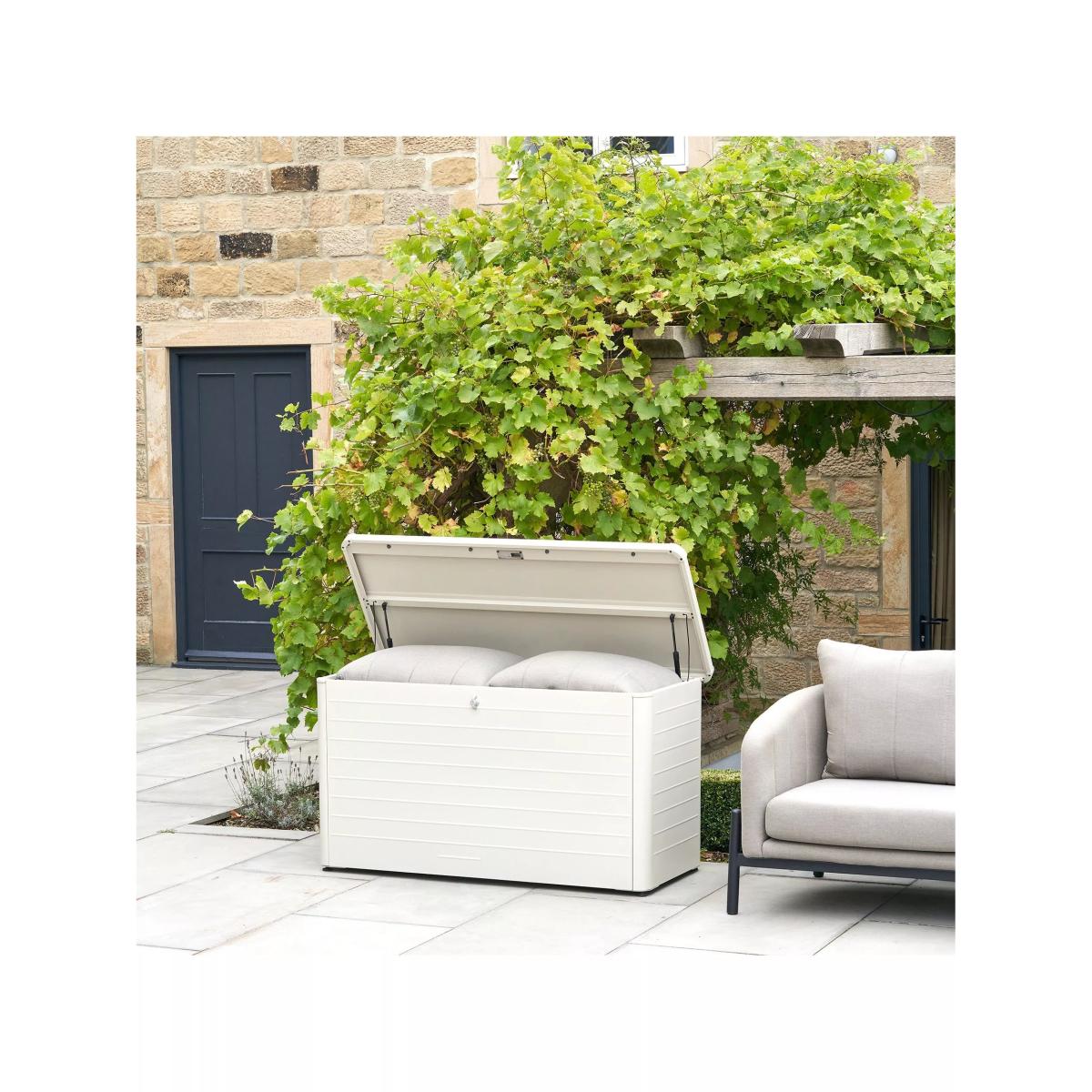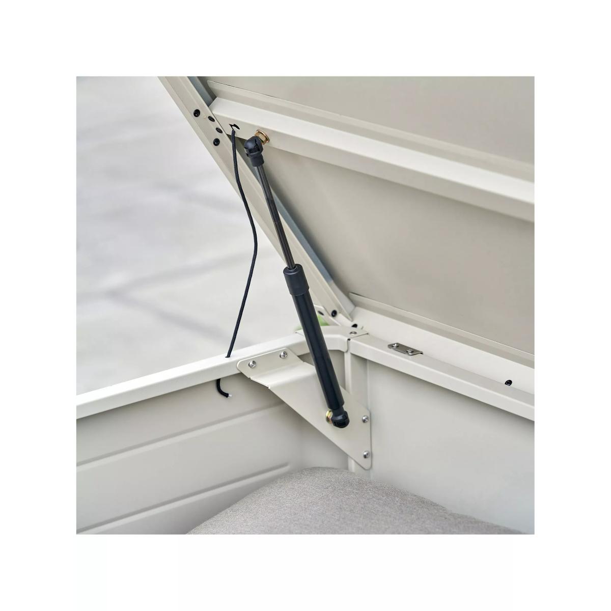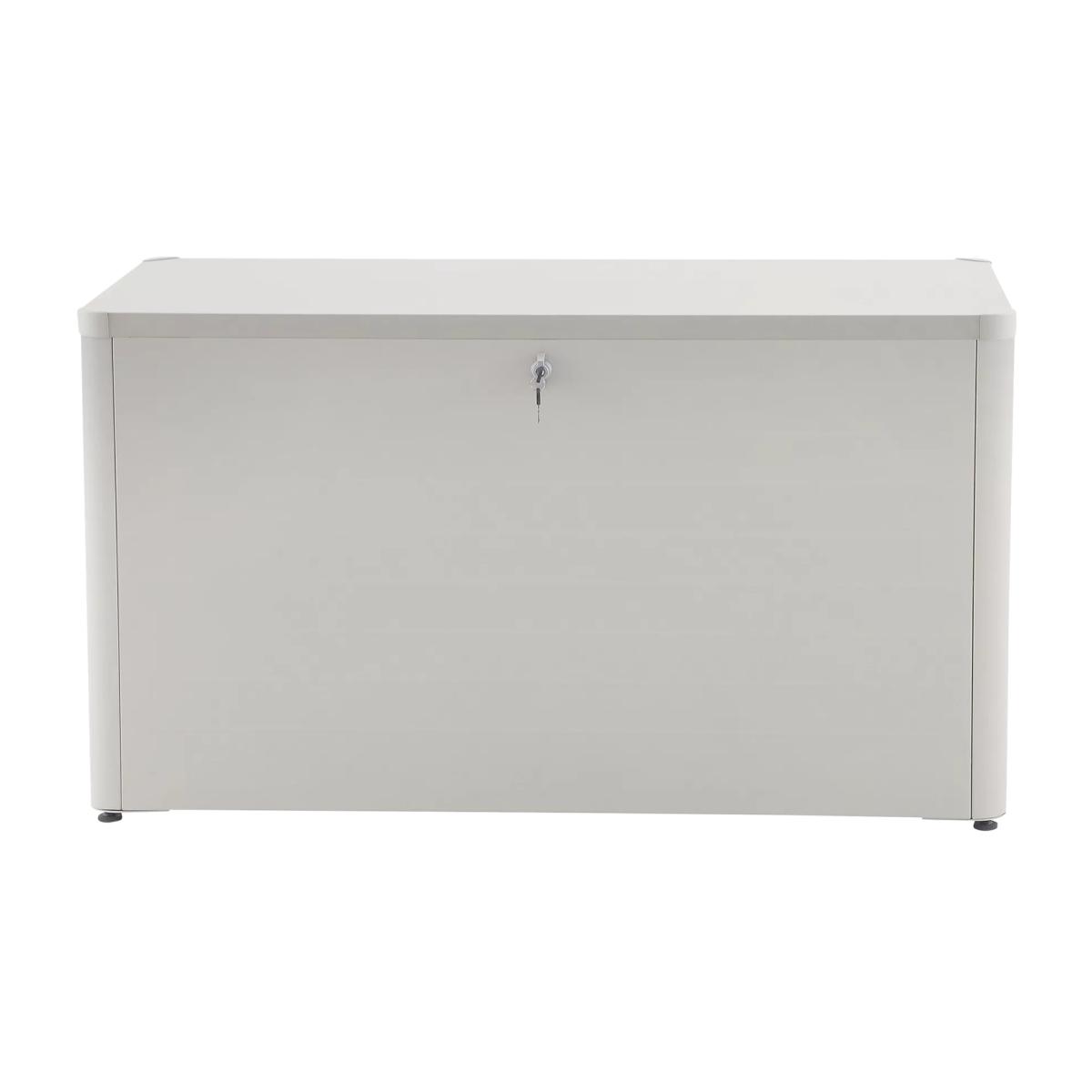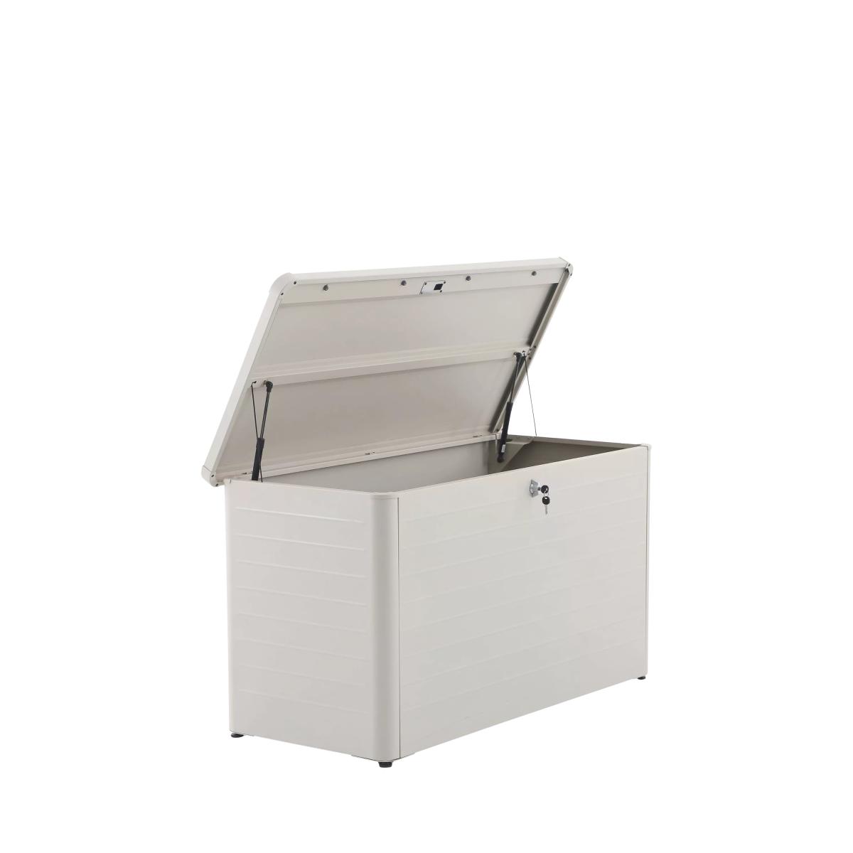 Galvanised steel cushion box with a contemporary, slim lid, designed with gas pump hinges for ease of closing and opening. Adjustable feet keep it level when it's on the patio, ready to store your garden cushions inside. A lock and key ensure security. Rhode Island cushion boxes are available in two sizes, small and large, and are available in three colourways.