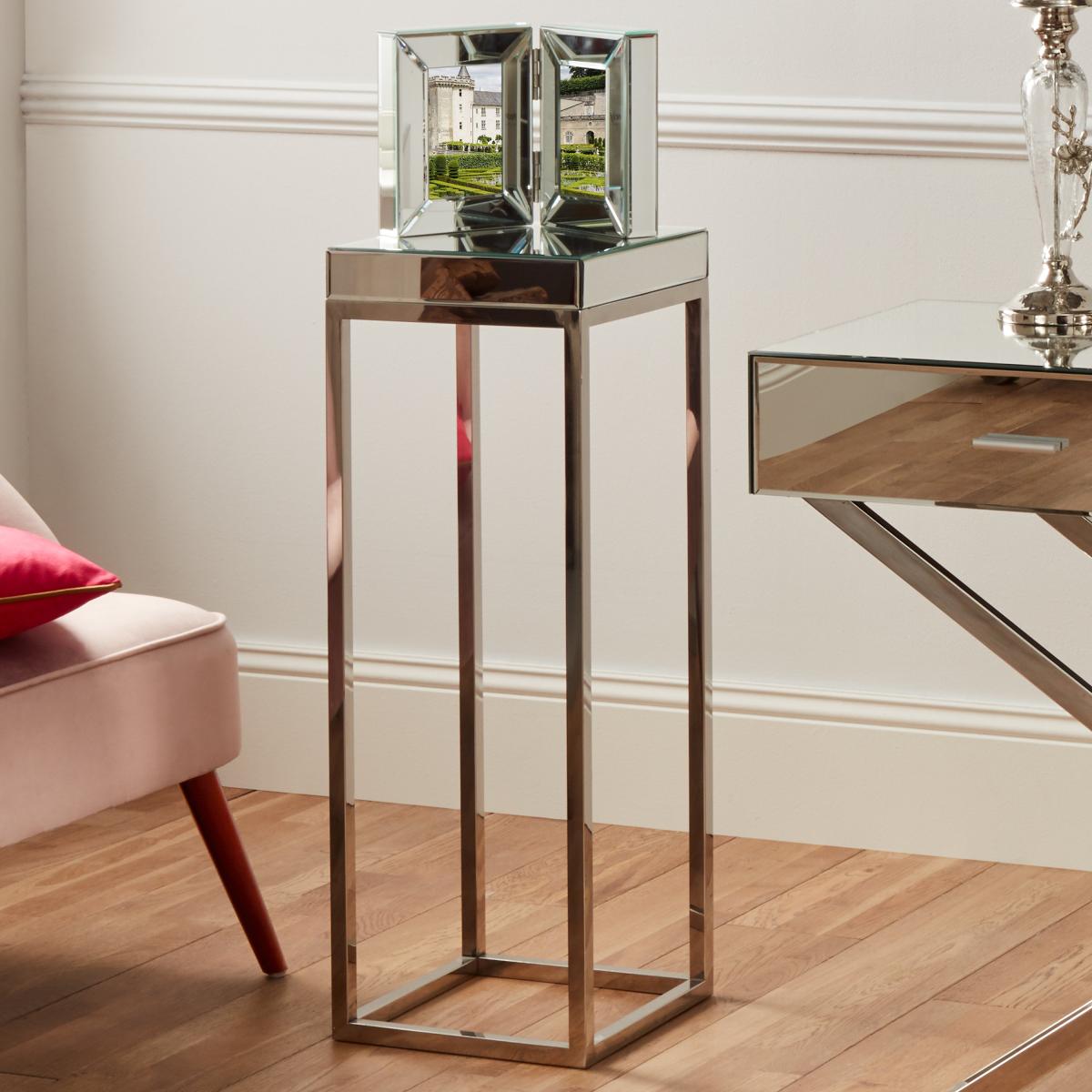 I love this little side table because its mirrored finish and sleek silver accents make it a versatile addition to both contemporary and glam interiors. It works especially well in spaces where you want to reflect light and add a touch of sophistication, such as in living rooms with metallic accents or modern bedrooms. For practical styling tips, consider using it as a display surface for decorative objects like candles, small art pieces, or a favourite vase. It can also serve as a handy spot for a glass of water or a lamp, blending function with style effortlessly. Its minimalist yet reflective surface helps to keep the overall look clean and elegant, making it a useful and stylish sidekick in many settings.