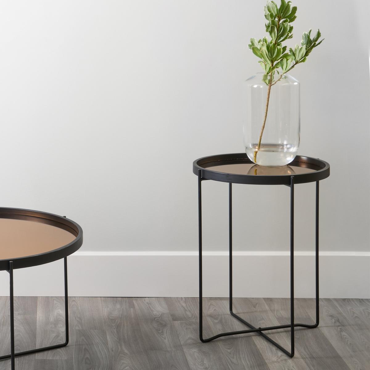 I love this side table because of its sleek industrial look, which works well in both contemporary and modern interiors. The combination of iron and copper adds a subtle warmth and texture, making it a versatile piece that can blend with warm metals or contrasting colours. It’s perfect for placing next to a sofa or bed, and I’d style it with a small lamp, a tray for everyday essentials, or a curated selection of books and greenery. Keep in mind, its minimal footprint makes it ideal for smaller spaces or to complement larger pieces without overcrowding. For a balanced look, pair it with other black or brass accents and consider grouping it with similar-height tables for extra visual interest.