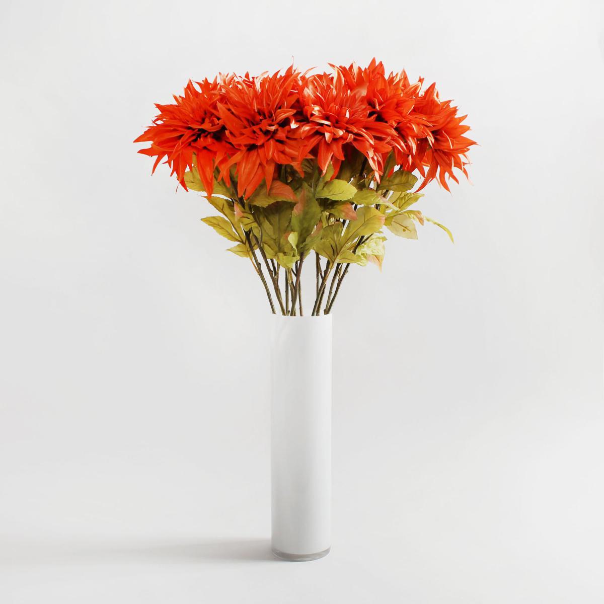 I love this bunch of orange dahlias for their bold colour and realistic texture, making them a versatile addition to many interiors. They work particularly well in contemporary or minimalist spaces where their vibrant hue can add a splash of warmth without overpowering. Practical styling tips include arranging them in a statement vase like a sleek white or matte black, or grouping a few together for a fuller display. Because they are artificial, they’re ideal for areas with limited natural light or spaces that require low-maintenance decor, such as kitchens, bathrooms, or offices. Overall, they’re a fuss-free way to bring seasonal colour and a touch of modern elegance to your space all year round.