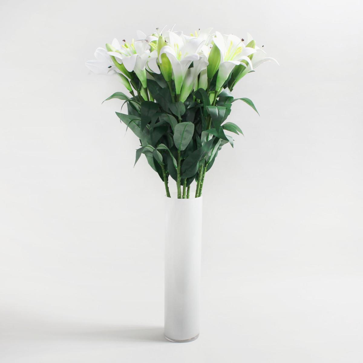 I love this bunch of white lilies because they bring a fresh, minimalist feel to any space without the maintenance of real flowers. They work particularly well in modern or classic interiors where a subtle touch of elegance is desired. For styling, try grouping a few in a sleek vase or mixing them with greenery for a more natural look. These lilies are also perfect for adding seasonal charm to a table centrepiece or placing on a mantle or console table for a clean, understated statement. Their versatile white hue makes them easy to incorporate across different colour schemes and interior styles, offering ongoing freshness without the fuss.