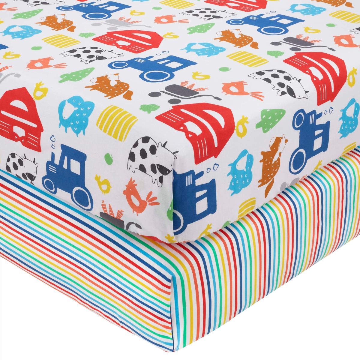 Add a pop of colour to your little ones bedroom with these set of two Farmyard fitted sheets designed in a colourful striped print and a Farmyard print. Made from recycled polycotton in a 144 thread count, perfect for giving your child a perfect night sleep. It's easy to clean by simply popping in the washing machine. Why not coordinate with the matching duvet cover and pillowcase set for a complete bedding look. MADE IN GREEN by OEKO-TEX® is a unique product label to trace the countries and production facilities - search the product label for more information.