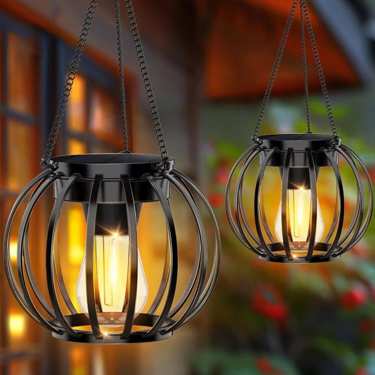 Add a touch of charm and practical lighting to your garden, patio, or outdoor space with this pack of 2 stunning solar hanging lanterns. Featuring a stylish metal cage design with a warm LED bulb inside, they cast beautiful scattered light patterns, creating a relaxing and inviting atmosphere. Effortlessly powered by the sun, these lanterns automatically charge during the day and illuminate your evenings for up to 12 hours when fully charged. Built to withstand the British weather, they boast an IP65 waterproof rating with a clever double waterproof design. Easy to hang anywhere thanks to the included hook and chain, they are perfect for garden paths, trees, pergolas, or decorating outdoor seating areas. Enjoy energy-efficient, automatic lighting year-round.