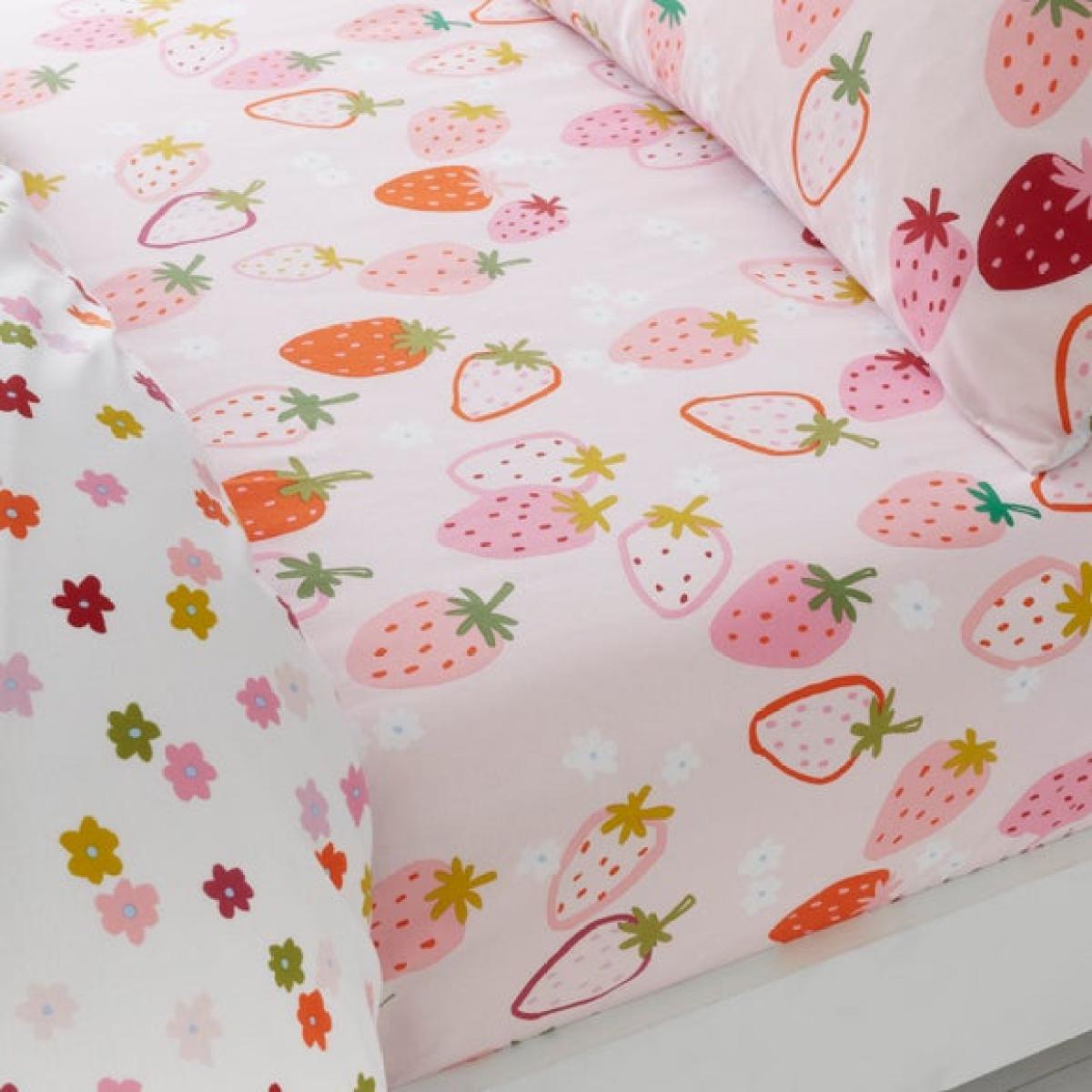 I love these strawberries fitted sheets for their playful and charming vibe, making them perfect for adding a touch of fun to a child's bedroom or a lively guest space. The colour palette is fresh and versatile, pairing well with both neutral and pastel interiors. A practical styling tip is to keep the surrounding décor simple to let the print stand out; pairing with plain cushions or curtains can create a balanced look. These sheets work beautifully in casual, cosy interiors and are great for bringing a cheerful, youthful feel to any bedroom.